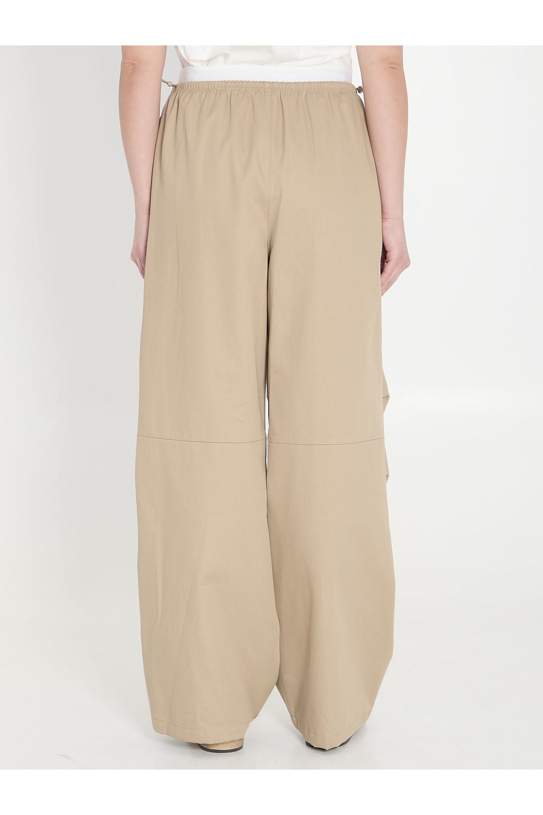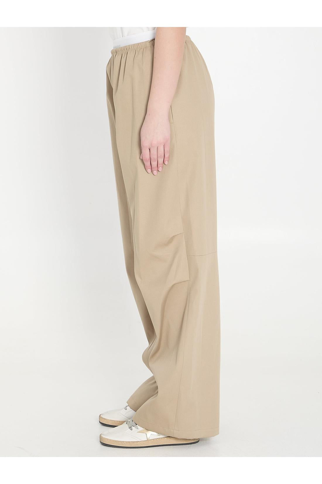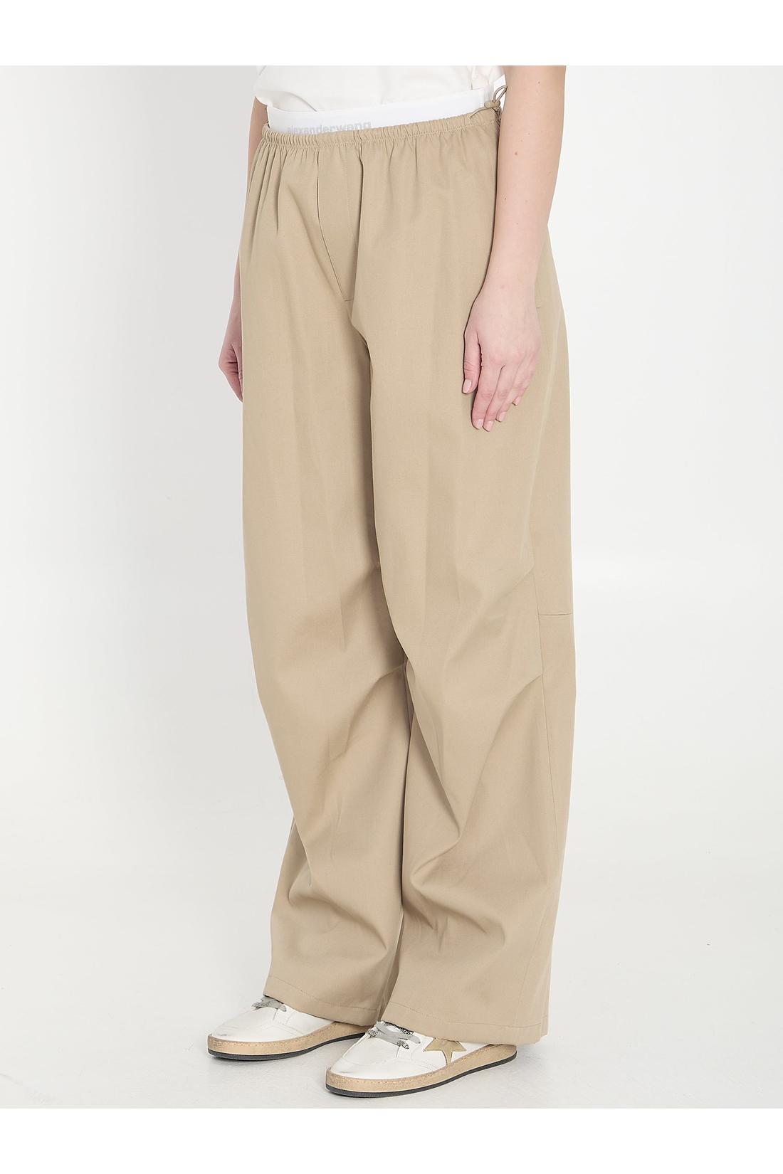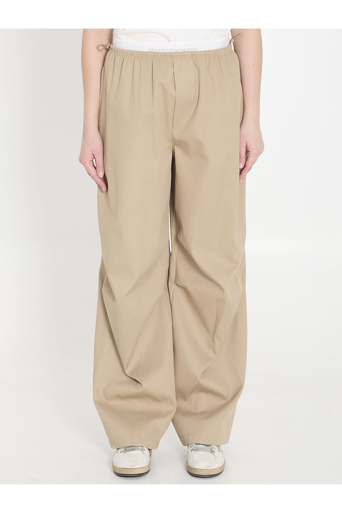 Warm taupe cotton twill pants. They feature an elasticized waistband with a logo, an adjustable drawstring waist, a non-functional front flap, side zip pockets, knee pleats, a mid-rise waist, and wide legs. Comfortable fit.