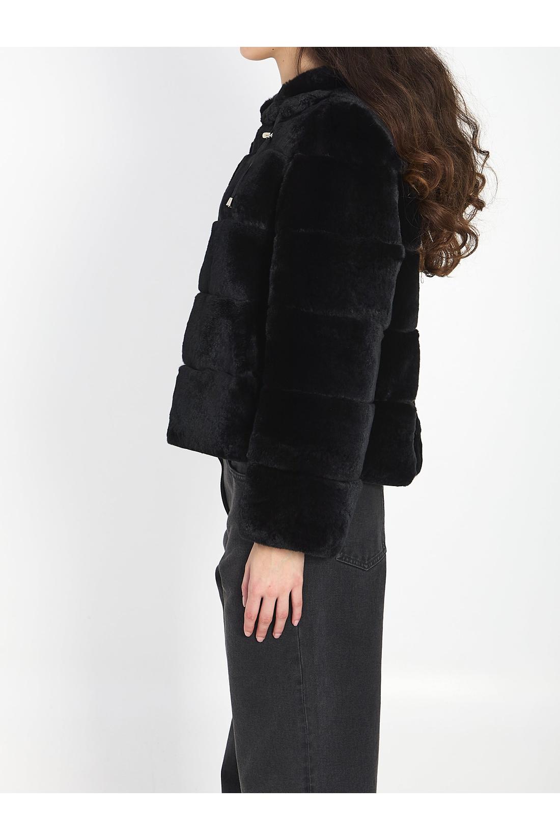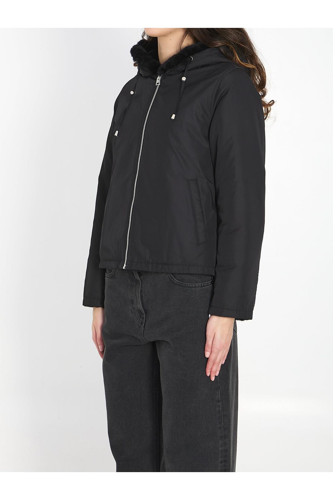 Reversible jacket in Rex rabbit fur and black technical fabric. It features an adjustable hood with a drawstring, one side in striped Rex fur with two front pockets, the other side in water-repellent technical fabric with two front pockets, and a front zip closure. Regular fit.