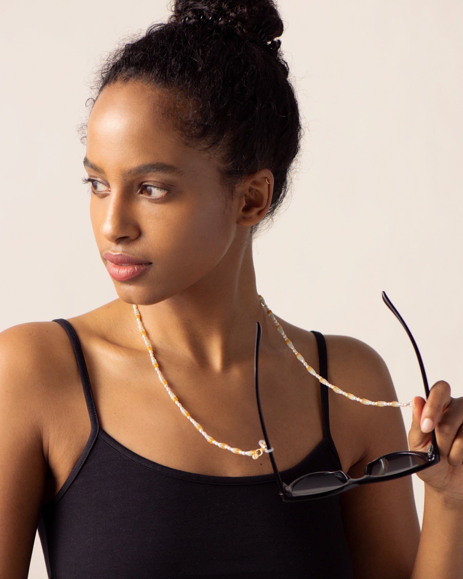 Feature: Du kannst die Sunglass Chain im Handumdrehen in eine Halskette, Bauchkette oder Halterung für deine Gesichtsmaske verwandeln mit einer Verlängerungskette. Win-Win right there