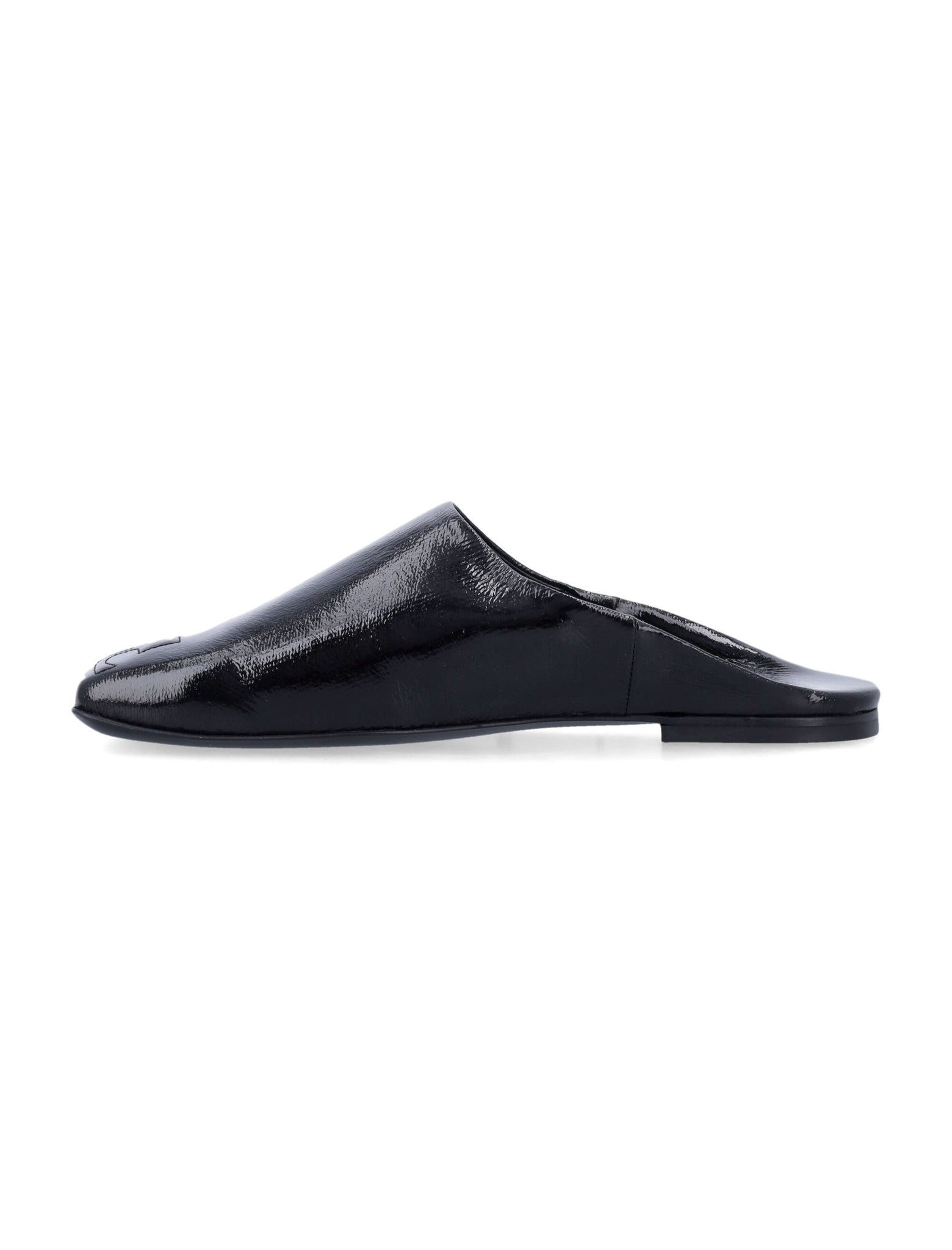 Step into elegance with the Heritage Shadow Mules by Courrèges. These stylish black mules offer a luxurious vinyl finish, a comfortable slip-on design, and a chic squared toe accentuated by an embossed logo. Perfect for any occasion!