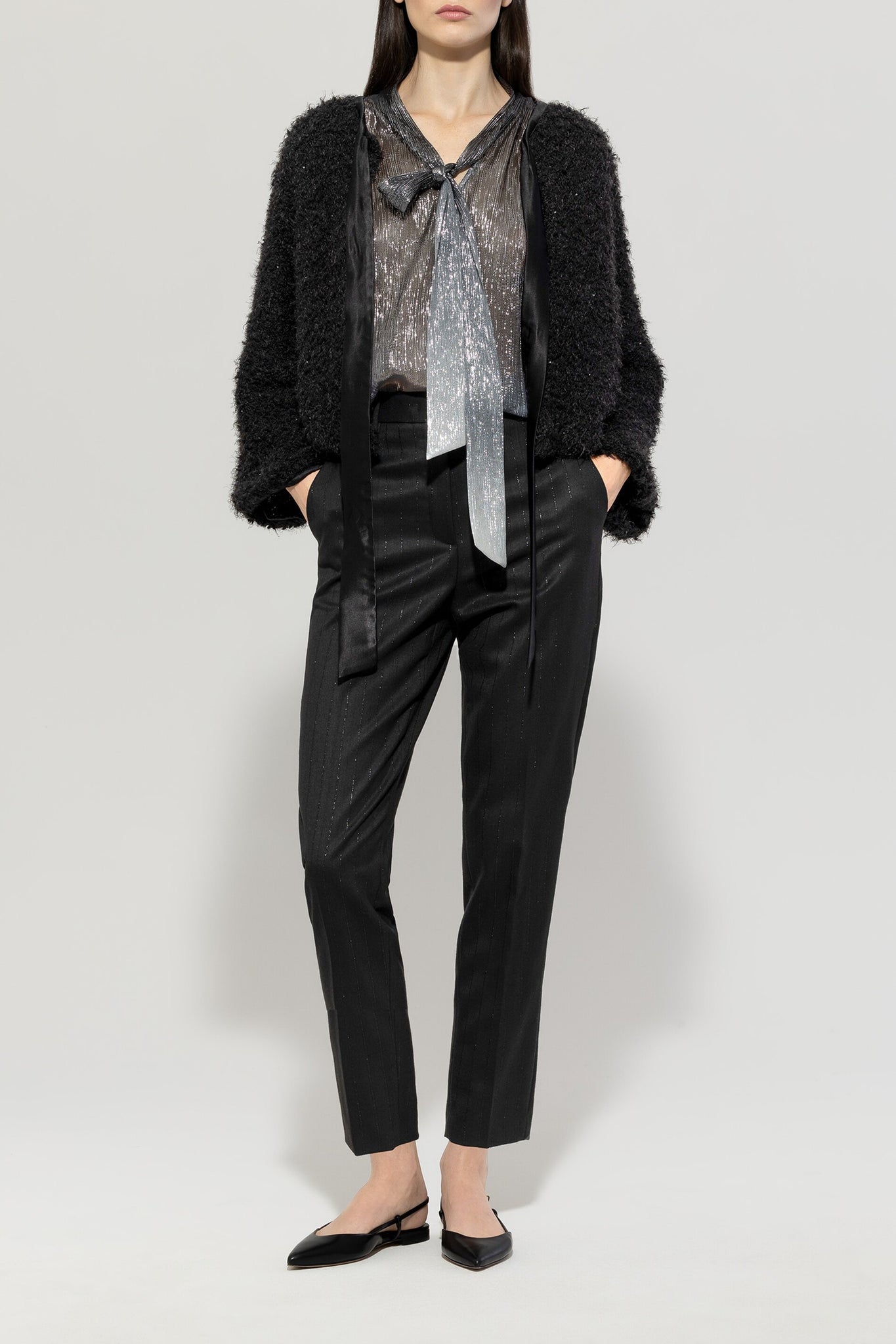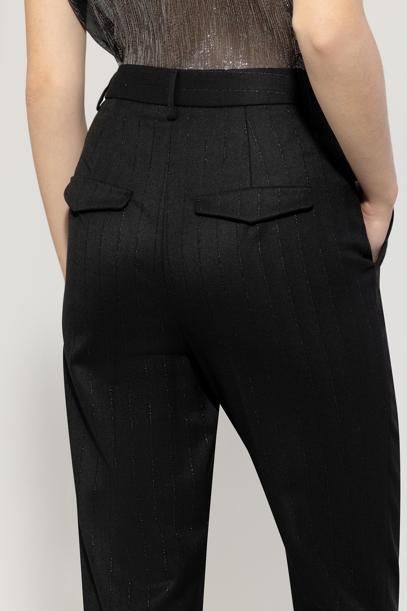 Gerade geschnittene Hose aus stretchiger Viskose-Wolle-Mischung mit Bügelfalten und dezent glänzenden Nadelstreifen. Die Hose verfügt über zwei offene Seitentaschen und zwei angedeutete Pattentaschen am Gesäß.