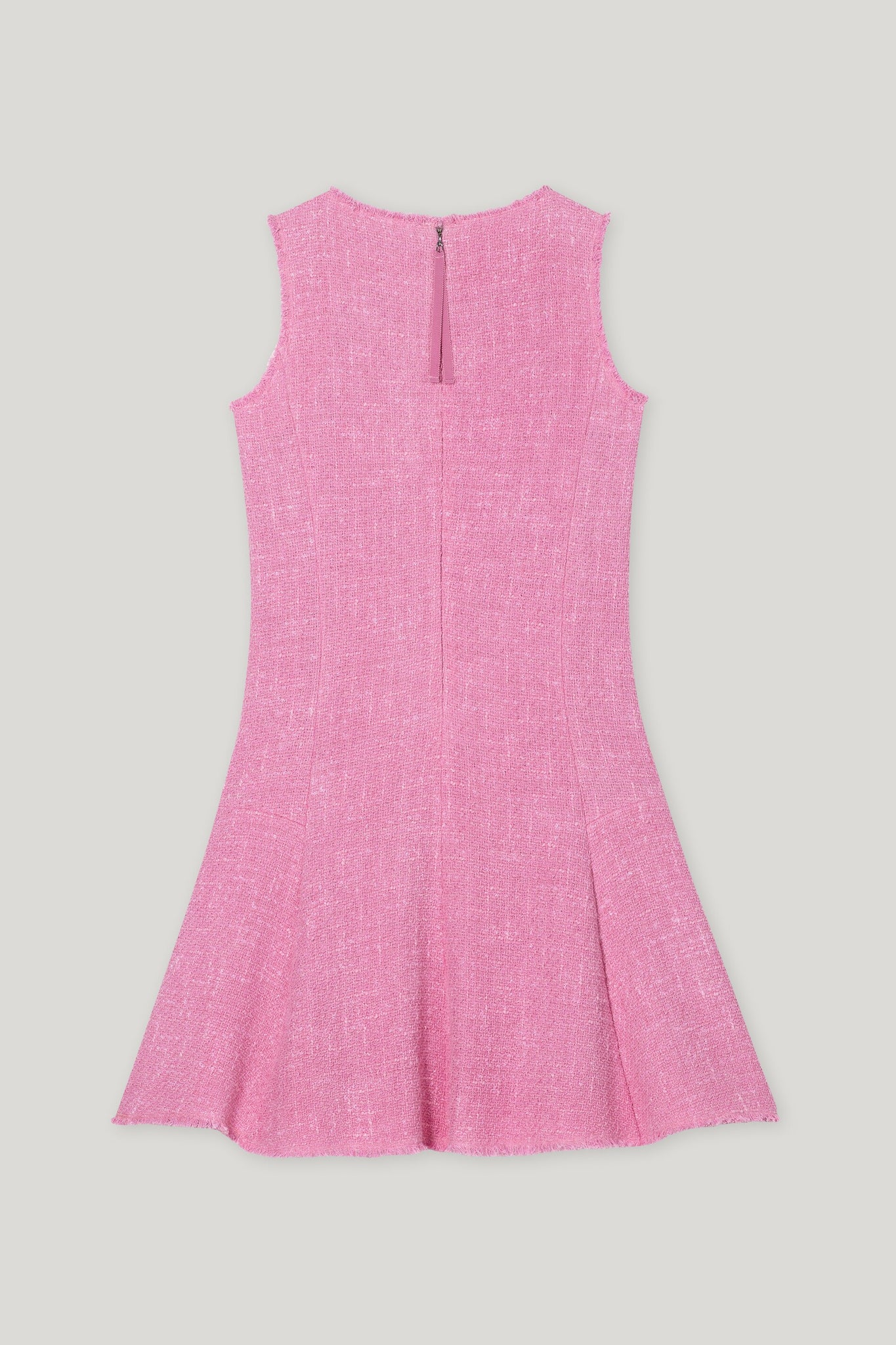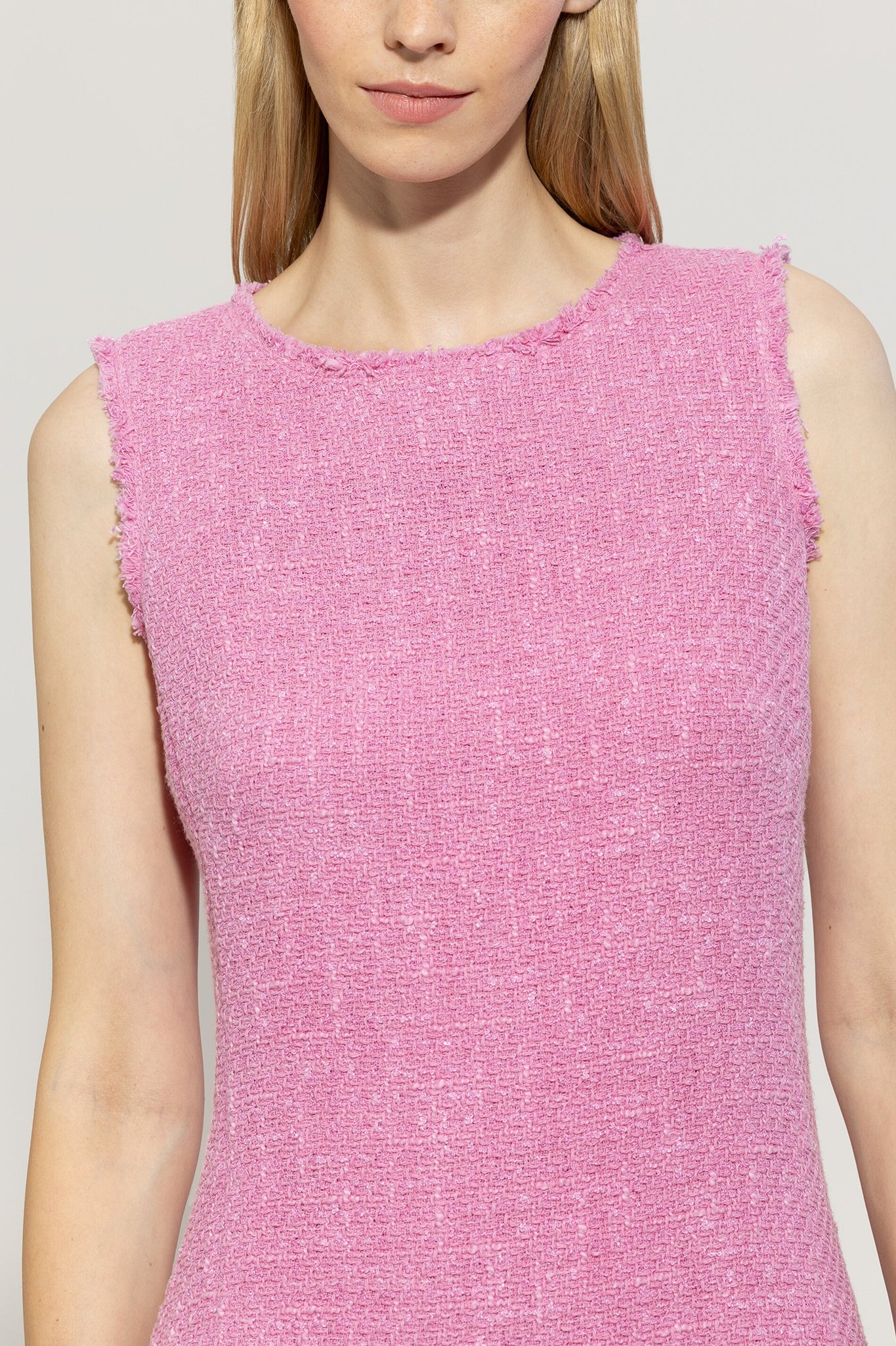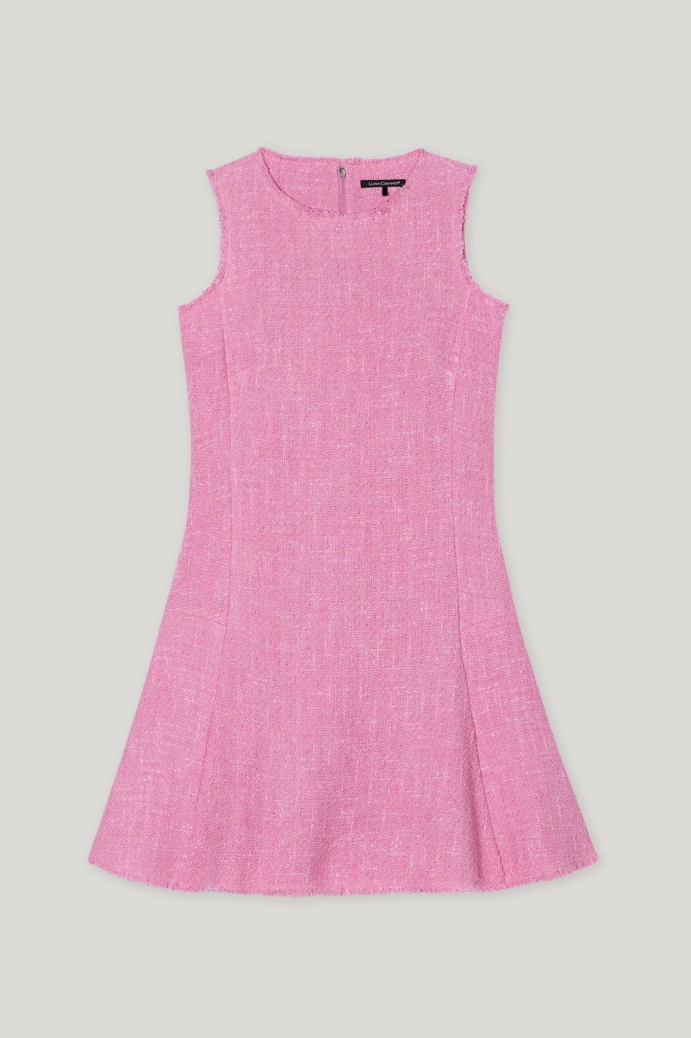 Minikleid in A-Linie aus sommerlichem Tweed-Stoff mit besonderer Vintage Mal-Tinto-Färbung und ausgefransten Saumkanten. Das ärmellose Rundhalskleid ist vollständig gefüttert und mit einem versteckten Reißverschluss auf der Rückseite ausgestattet.