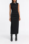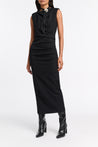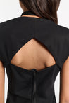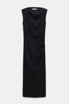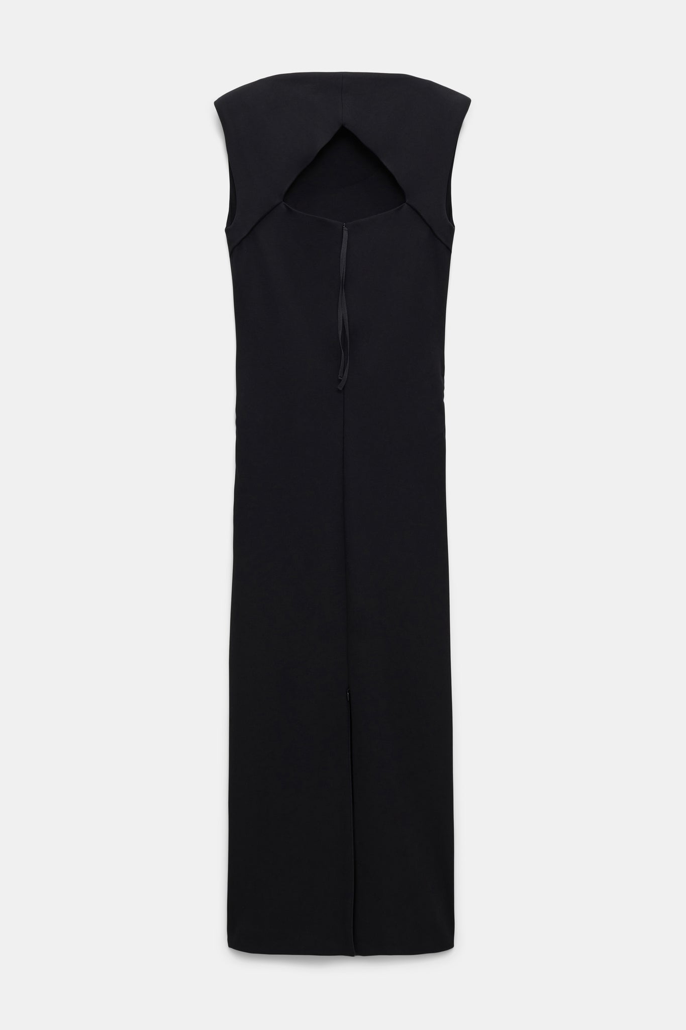 Das Kleid ist aus softem Punto Milano gefertigt und hat eine drapierte Vorderseite. Ein Cut-Out am Rücken trifft auf einen nahtfeinen Zipper mit Bänder-Detail sowie einen Reißverschluss am Saum, durch den du die