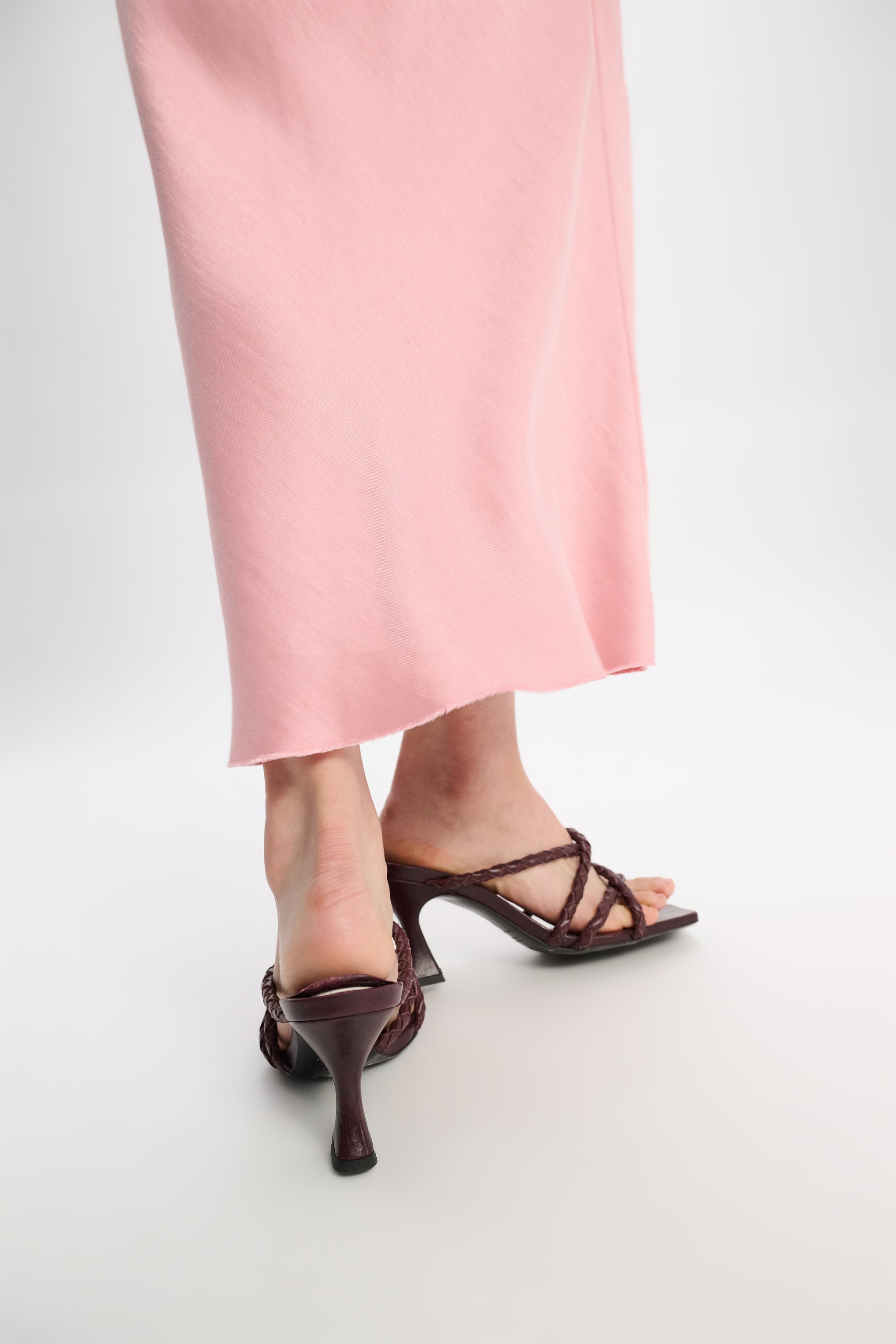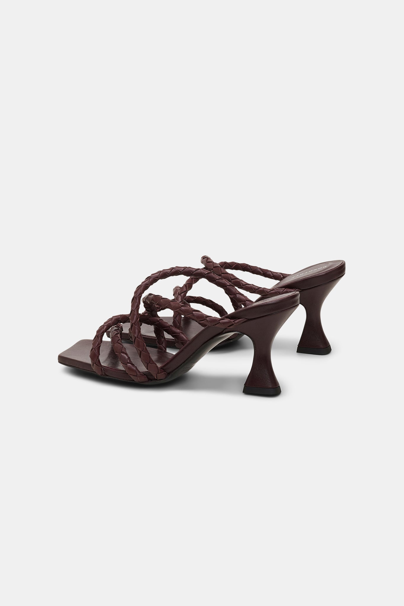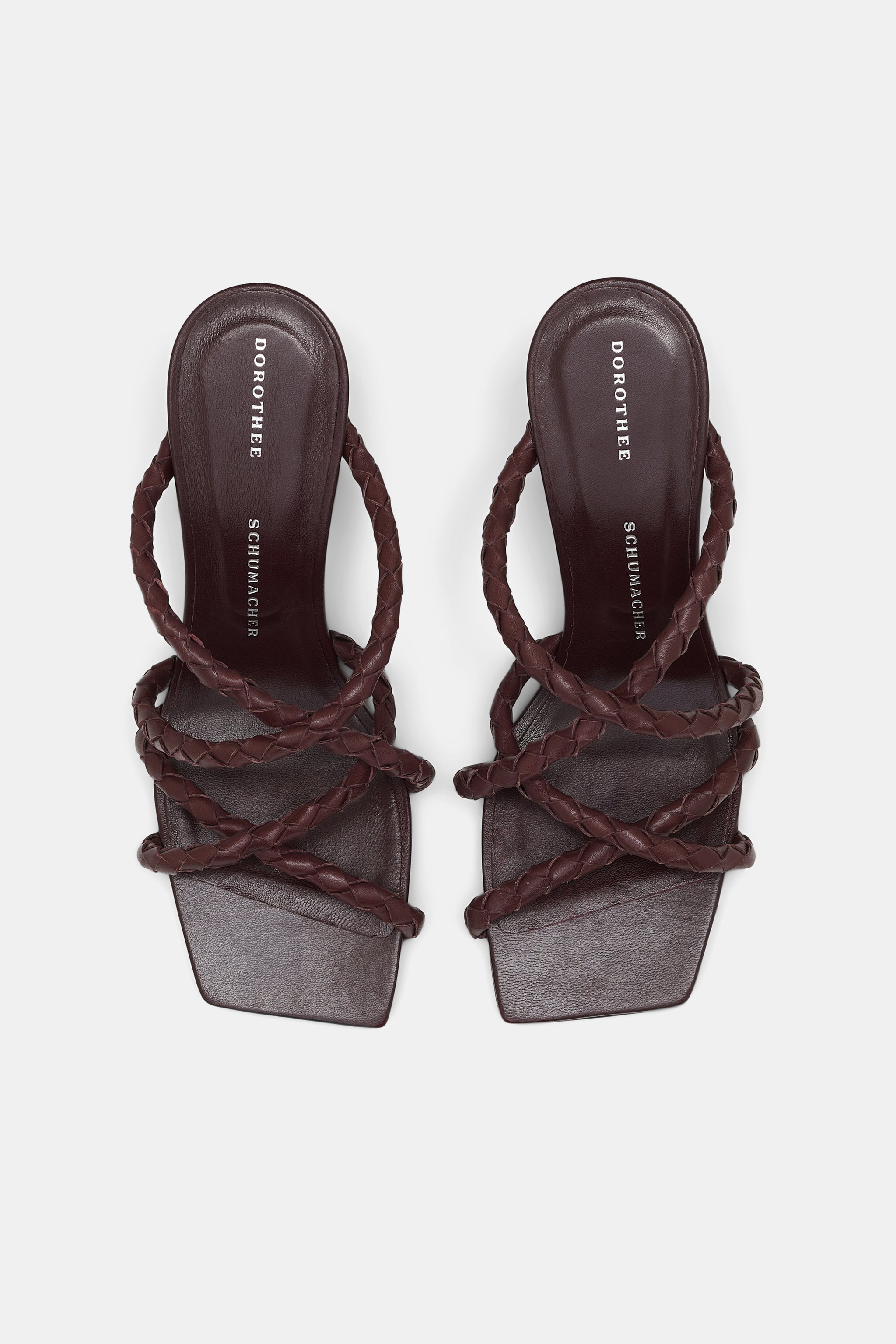 Die Sandalen aus weichem Leder haben eine quadratische Zehensilhouette und einen flared Absatz. Die bicolor Straps sind aus einer geflochtenen Lederkordel gefertigt.