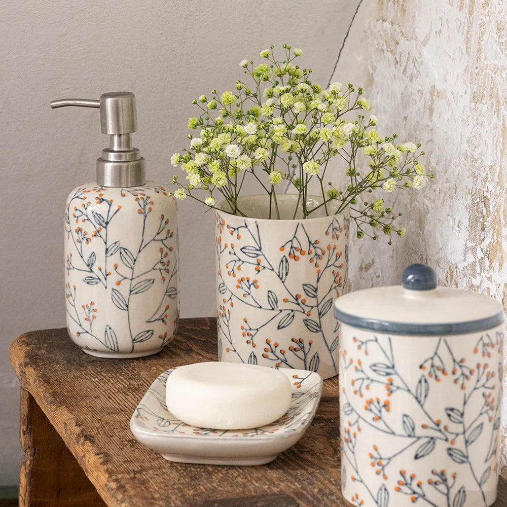 Verleihe deinem Badezimmer eine elegante Leichtigkeit mit unseren liebevoll handgestempelten Bad-Accessoires. Die Aufbewahrungsdose mit floralem Print ist nicht nur ein stilvoller Hingucker, sondern bietet Platz für Wattepads, Schmuck oder kleine Pflegeartikel. Ergänzt wird sie durch die passende Badablage, die Ordnung schafft und gleichzeitig mit zarten Mustern dekorative Akzente setzt. Gemeinsam sorgen sie für ein harmonisches, romantisches Ambiente – schön, praktisch und bis ins Detail durchdacht.