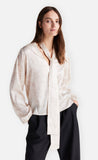 Dieses bedruckte Blusenshirt mit V-Ausschnitt und abnehmbarer Schluppe ist aus feinem Seidensatin gefertigt und hat dezente Ballonärmel, die das feminine Design unterstreichen.