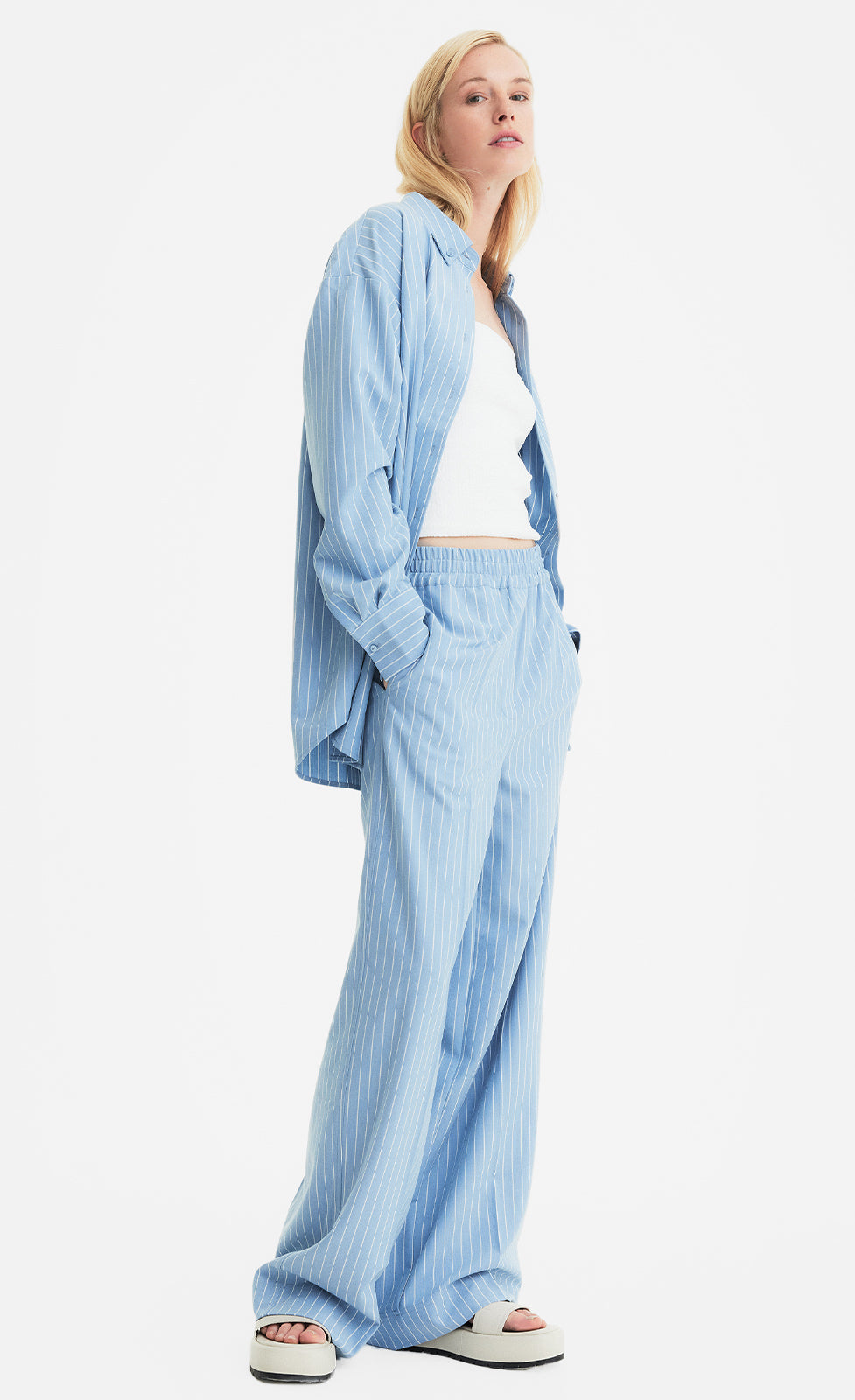 Mit dieser fein gestreiften Hose wird der angesagte Pyjama-Look stilvoll umgesetzt. Die dazu passende Bluse komplettiert das Outfit.
