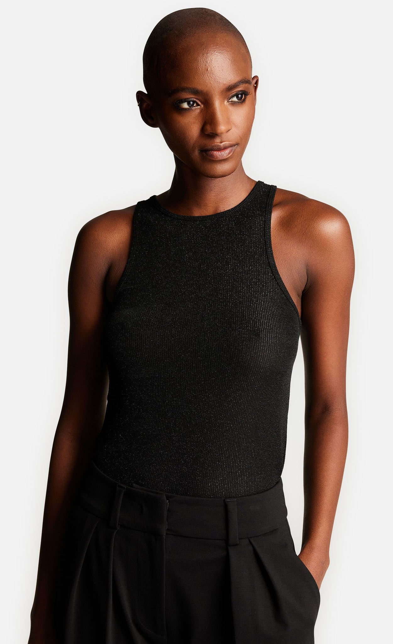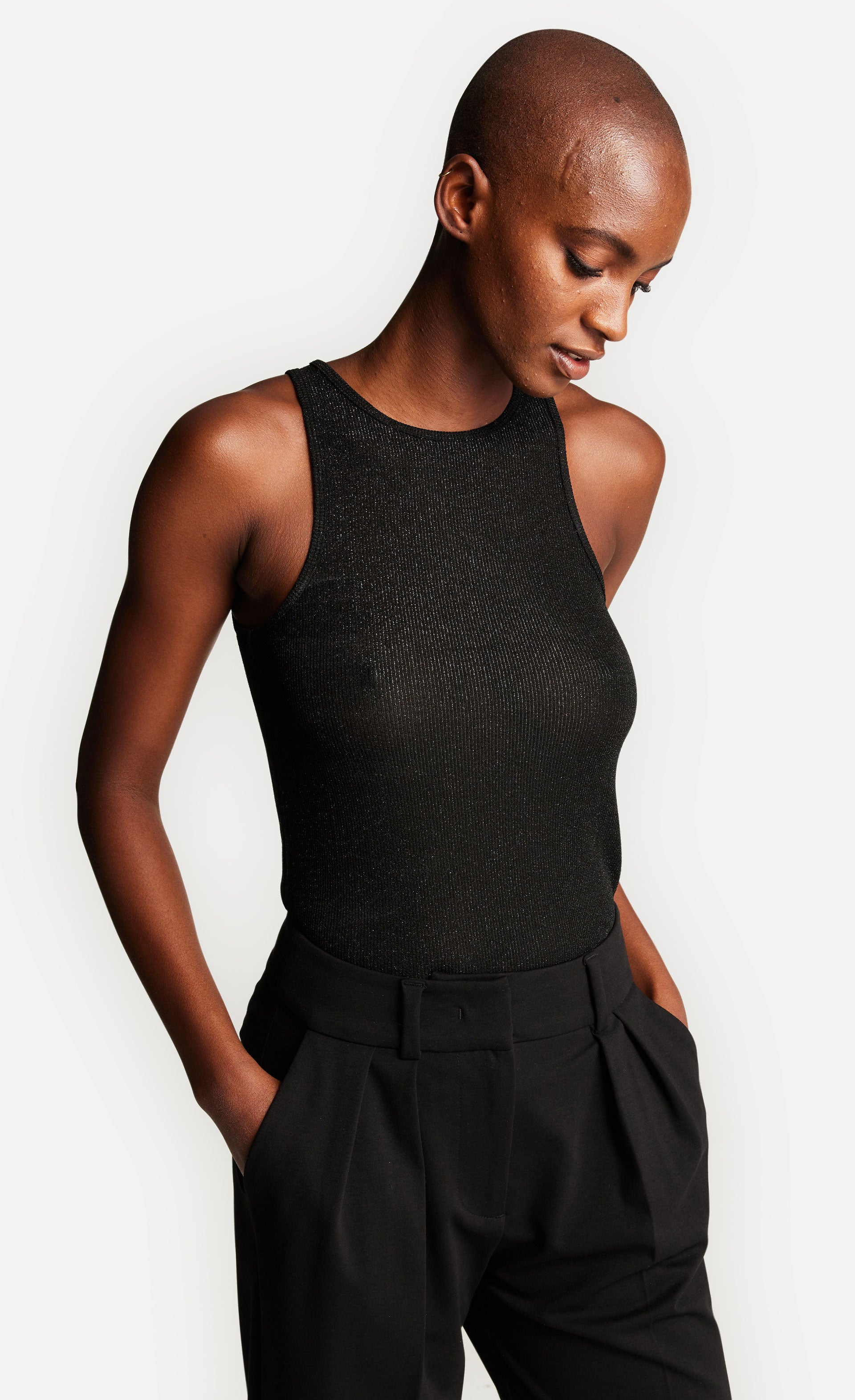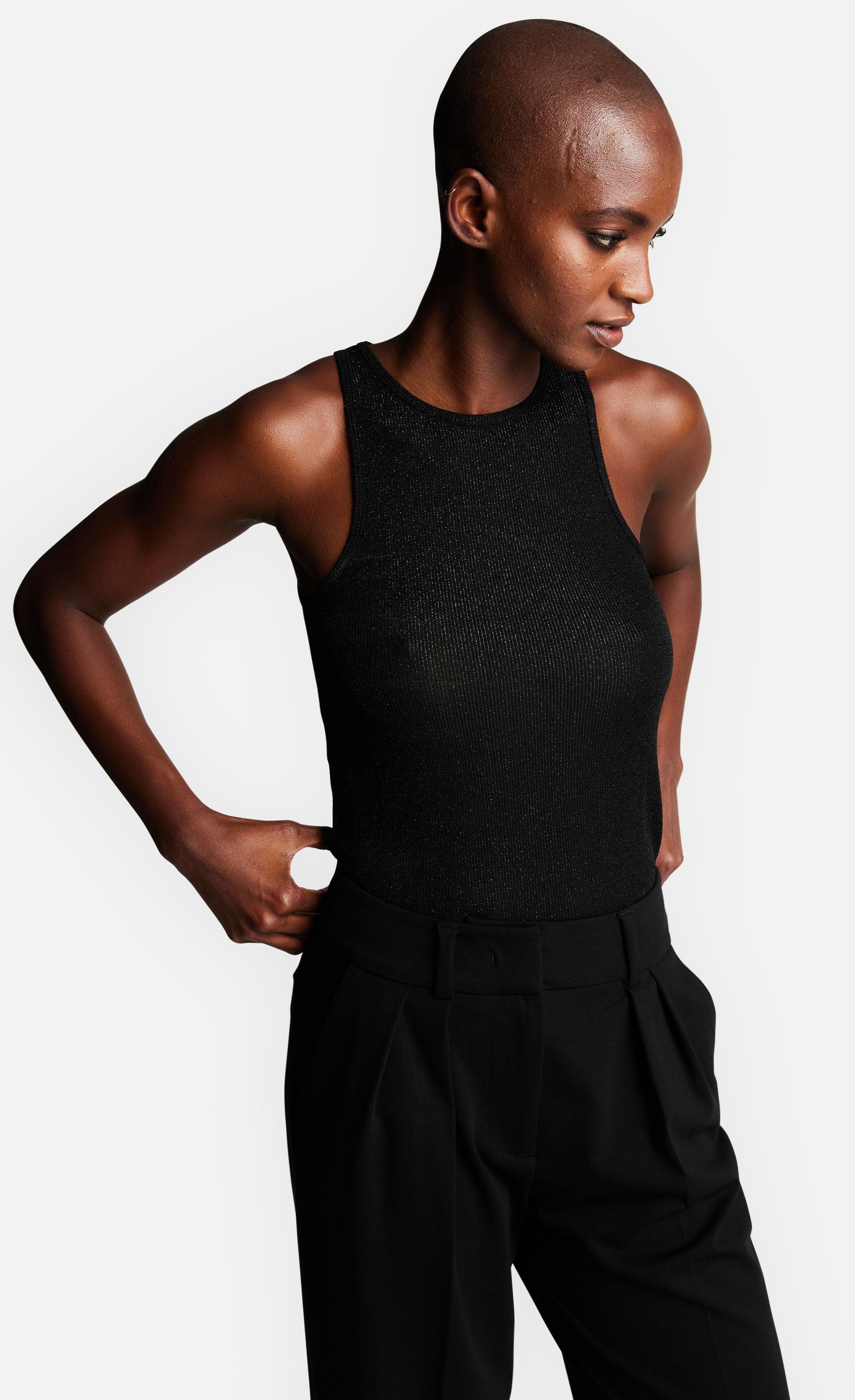 Durch das überraschende Material mit Glitzereffekt und den ansonsten sportlichen Look besticht das Top durch seine vielseitige Kombinierbarkeit.