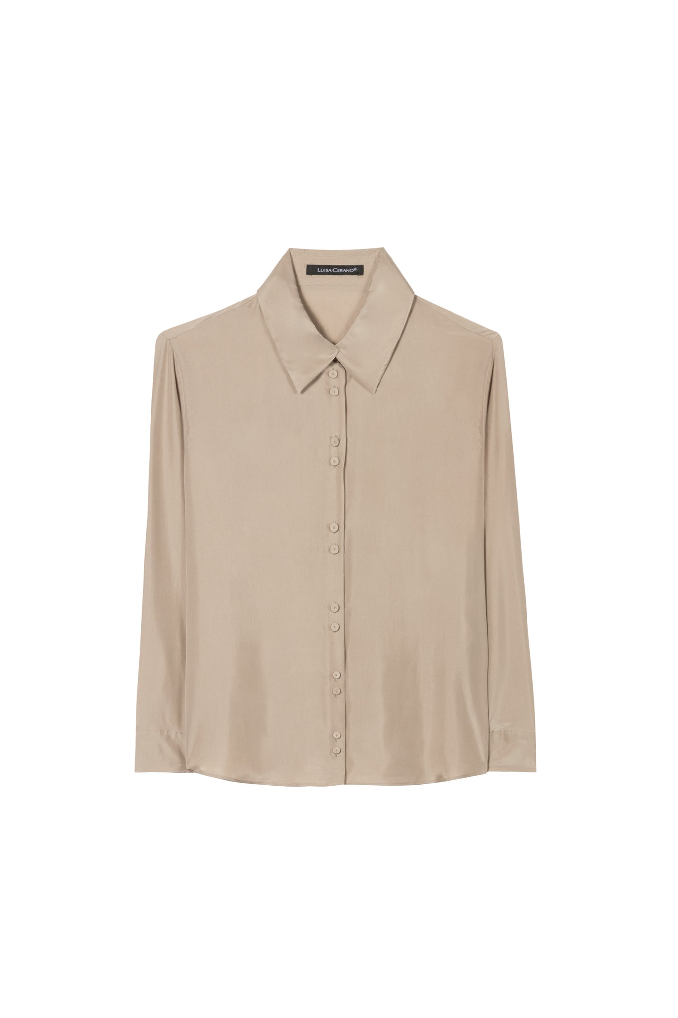 Leichte Hemdbluse aus matt schimmernder Seide. Die legere, schlichte Bluse besitzt einen spitz zulaufenden Hemdblusenkragen und ist auf der Vorderseite mit einer Leiste aus doppelten Knopfreihen versehen.