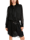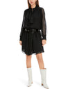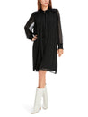 Kurzes Kleid aus semitransparentem Viskosecrêpe - partiell gefüttert. Das Kleid ist lässig weit und hat eine gerade Form. Der Halsausschnitt ist mit Schlitz und Knopf gearbeitet - die Schluppe ist fixiert. Die Ärmel schließen mit einem Smok ab. Effektvoll, die zarten Volants an Schulterpasse, Vorderteil und Ärmel. Ein tolles Kleid mit Wow-Effekt.