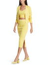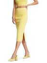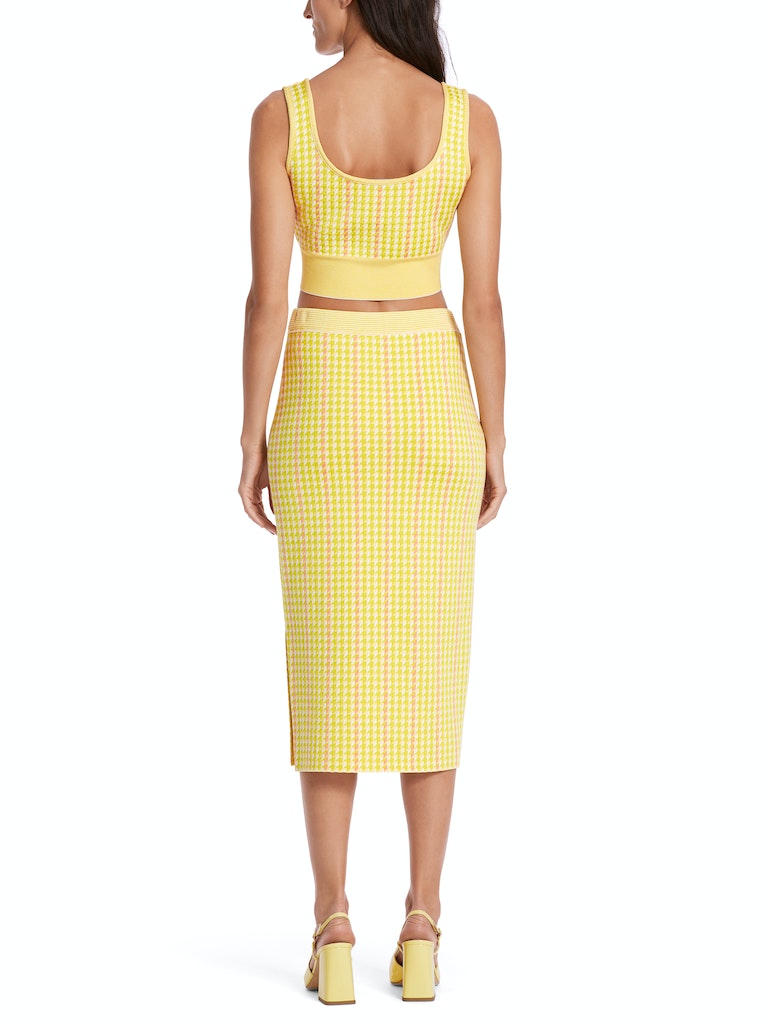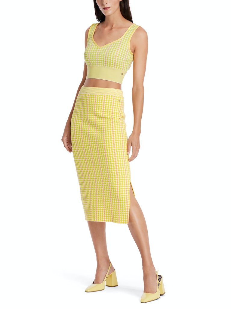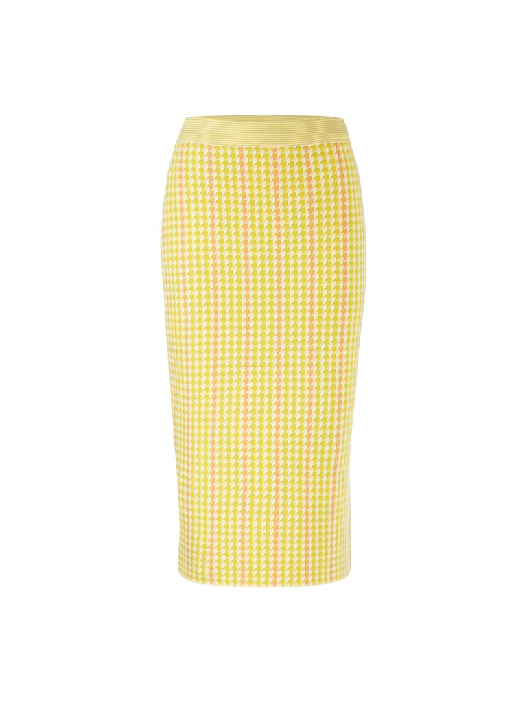 Der Rock zeigt ein farbenfrohes Karomuster aus einer Materialmischung mit Viskose und Baumwolle. Seine figurnahe Silhouette kommt in Midilänge und ist an der Seite geschlitzt. Ein komfortabler Gummibund erhöht den Tragekomfort. Der Rock wird am Standort Deutschland gestrickt und auch veredelt. Die Weiterverarbeitung der einzelnen Teile erfolgt in europäischen Partnerbetrieben. Damit ist das Modell „Knitted in Germany“.