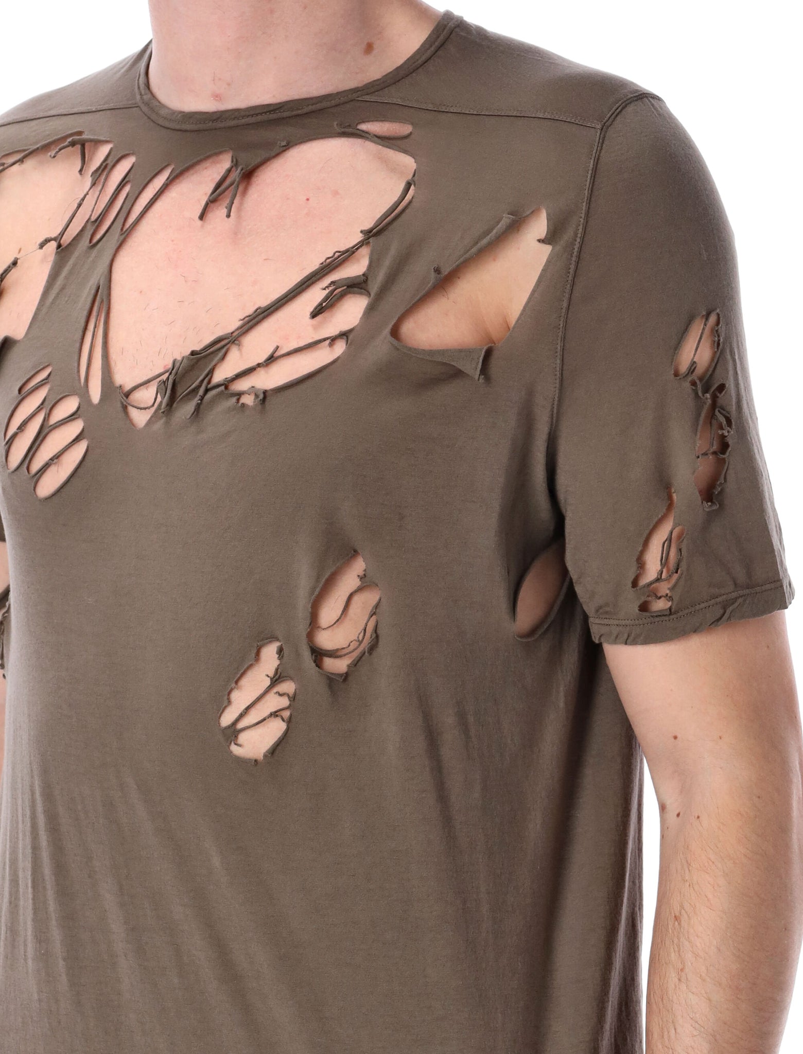 Crafted from 100% cotton, the Level T by Rick Owens DRKSHDW features a crew neck, short sleeves, and unique ripped detailing. The below-hip length adds a modern touch, making it ideal for casual styling.