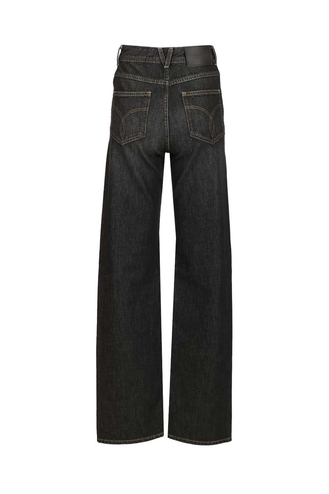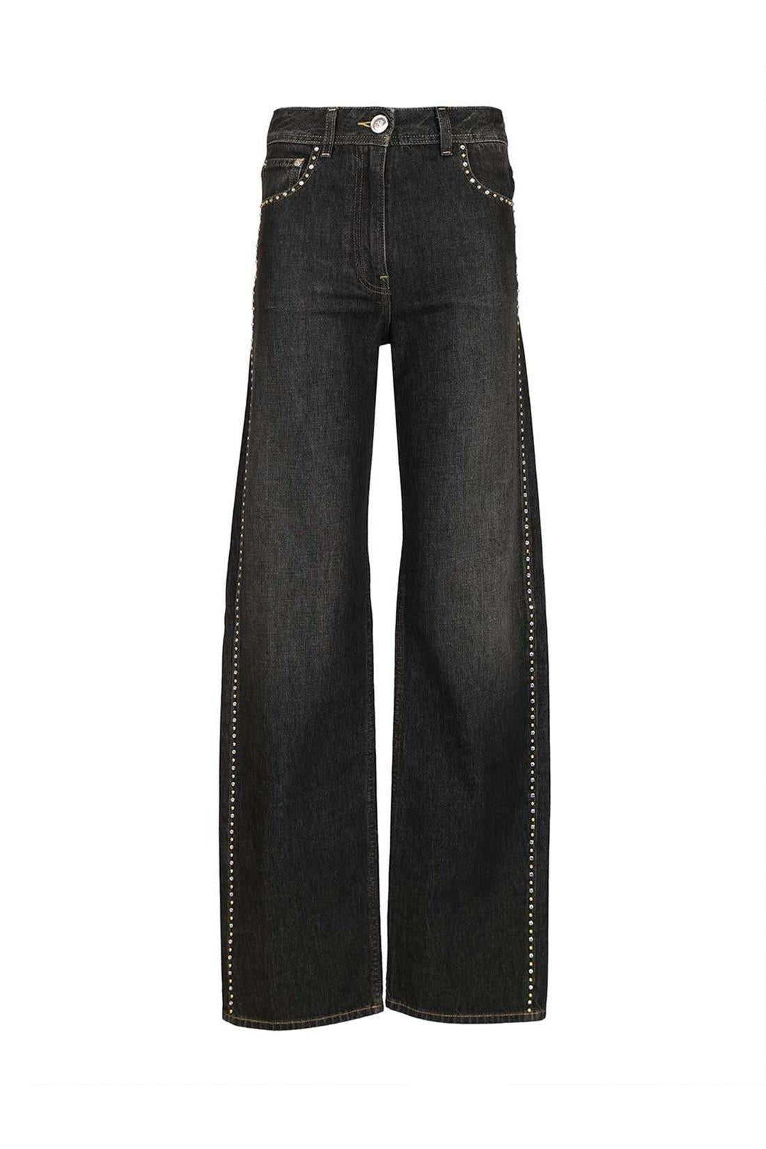 Black stone washed cotton denim jeans with studs detail. They feature belt loops, a front Medusa button closure and zip, a leather patch with logo on the back waist, mid rise, and straight legs. Regular fit.