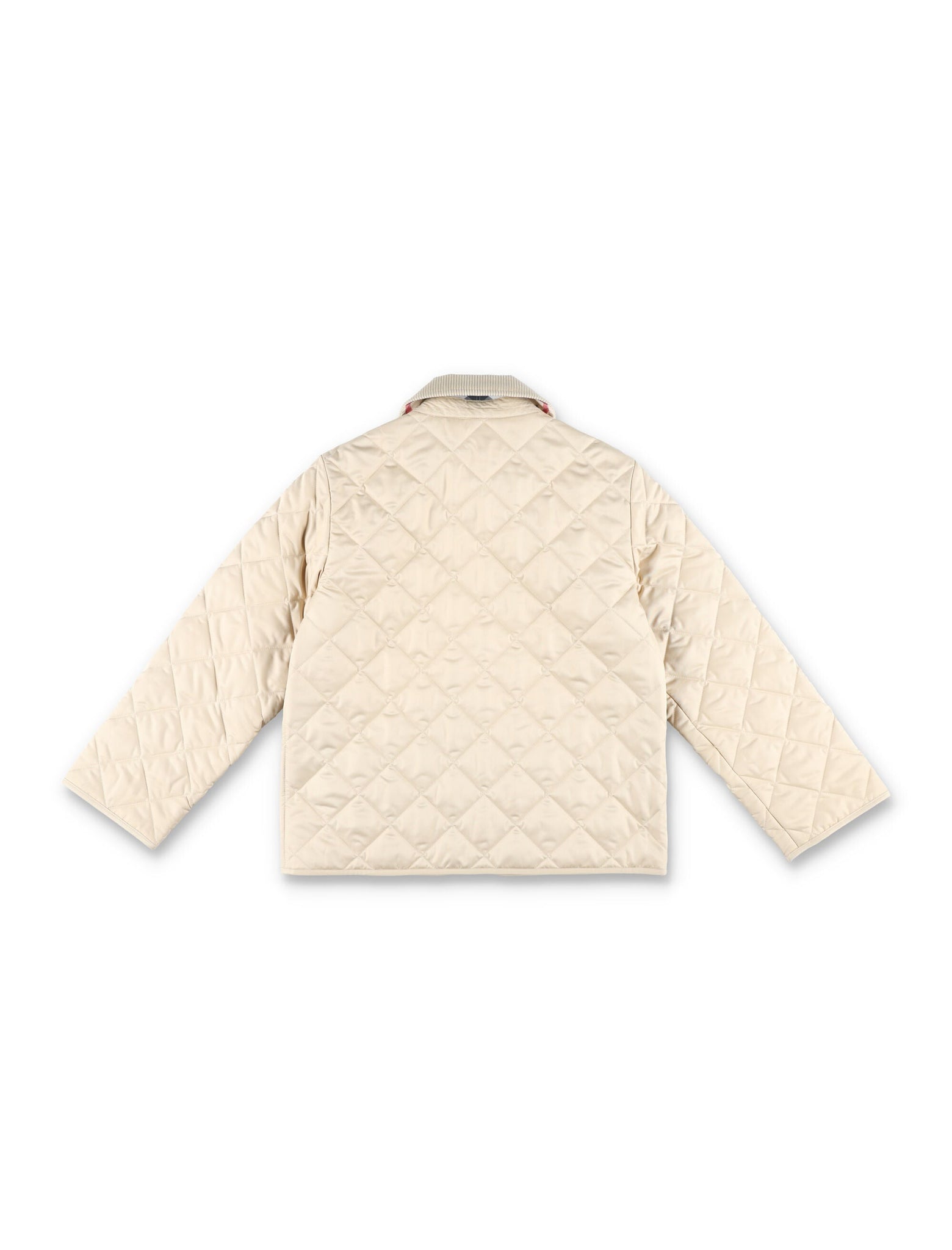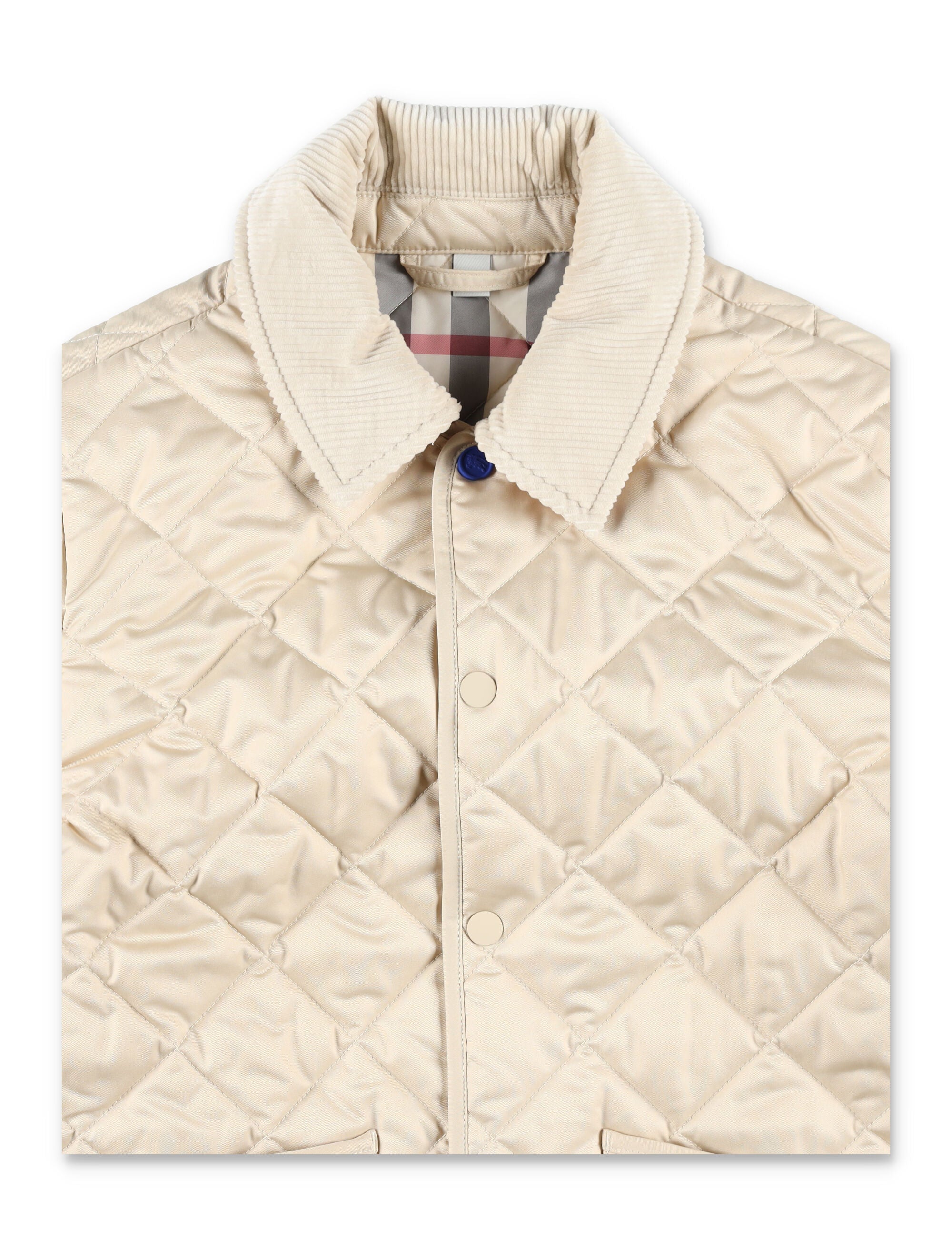 Elevate your child's wardrobe with this stunning Burberry Quilted Jacket in Pale Stone. Its classic fit, soft corduroy collar, and iconic check lining make it perfect for any occasion. Durable and stylish, this jacket is a must-have for winter!