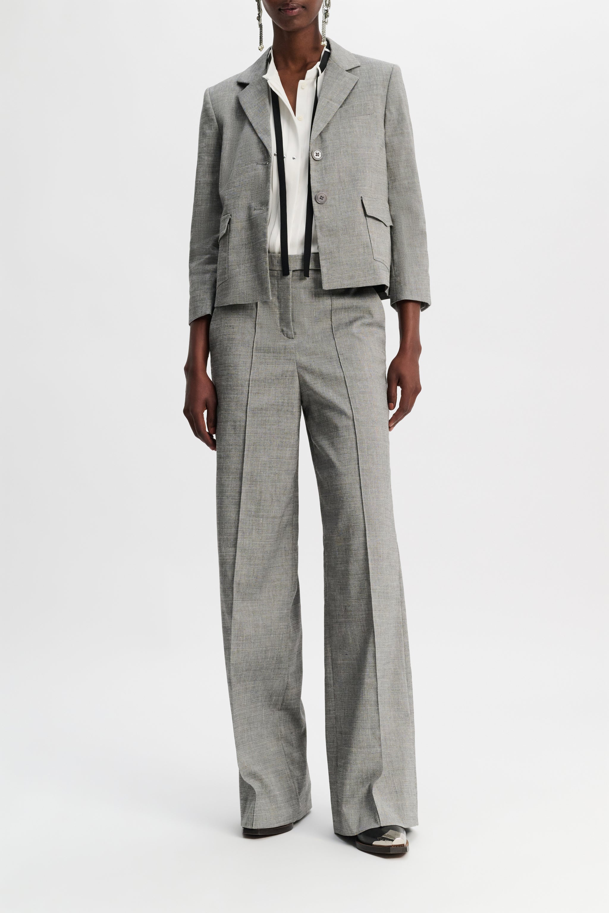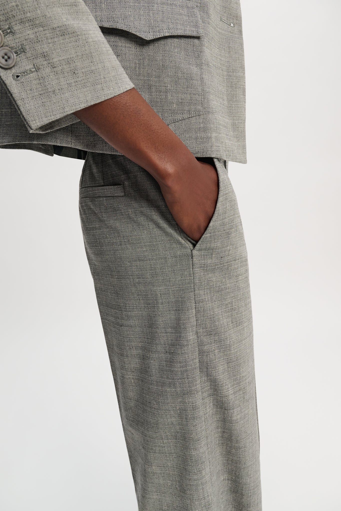 Zusammensetzung: 48 % Polyester, 16 % Schurwolle, 15 % Viskose, 7 % Leinen, Flachs, 7 % Polyamid, 5 % Wolle, 2 % Elasthan