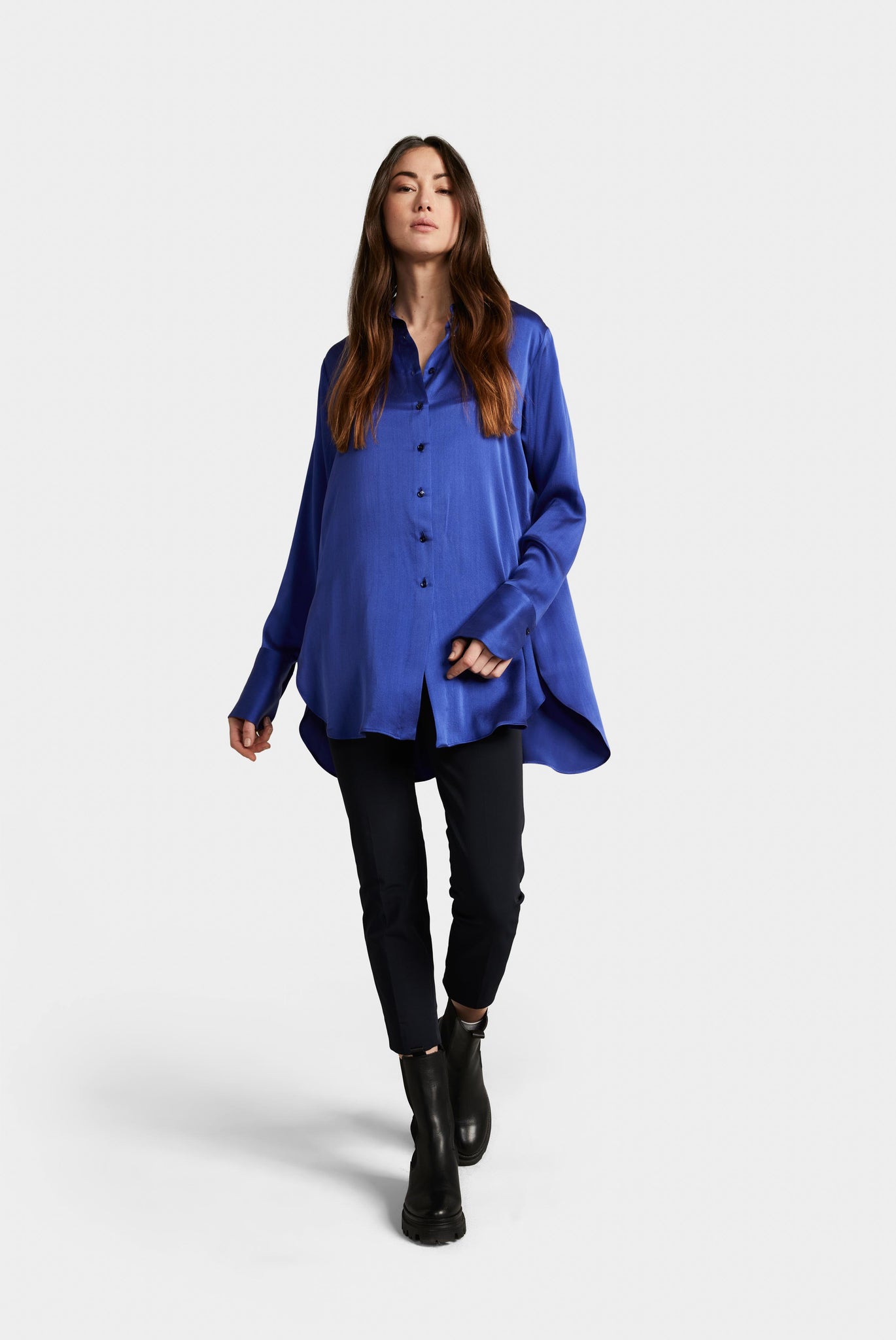 Lange Bluse mit Seide und Stretch-Anteil, Perlmuttknöpfen, großen Manschetten und Hemdblusenkragen.