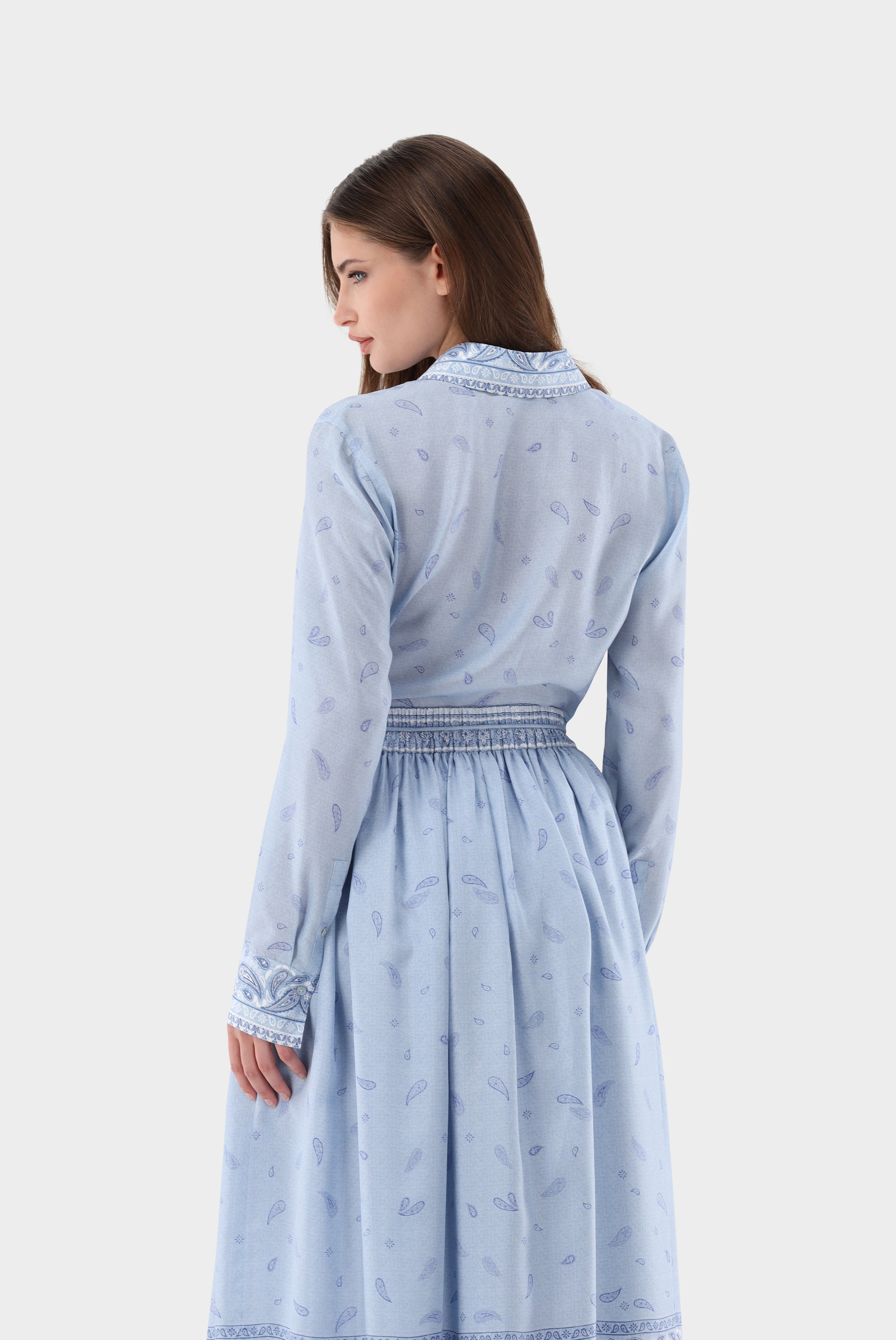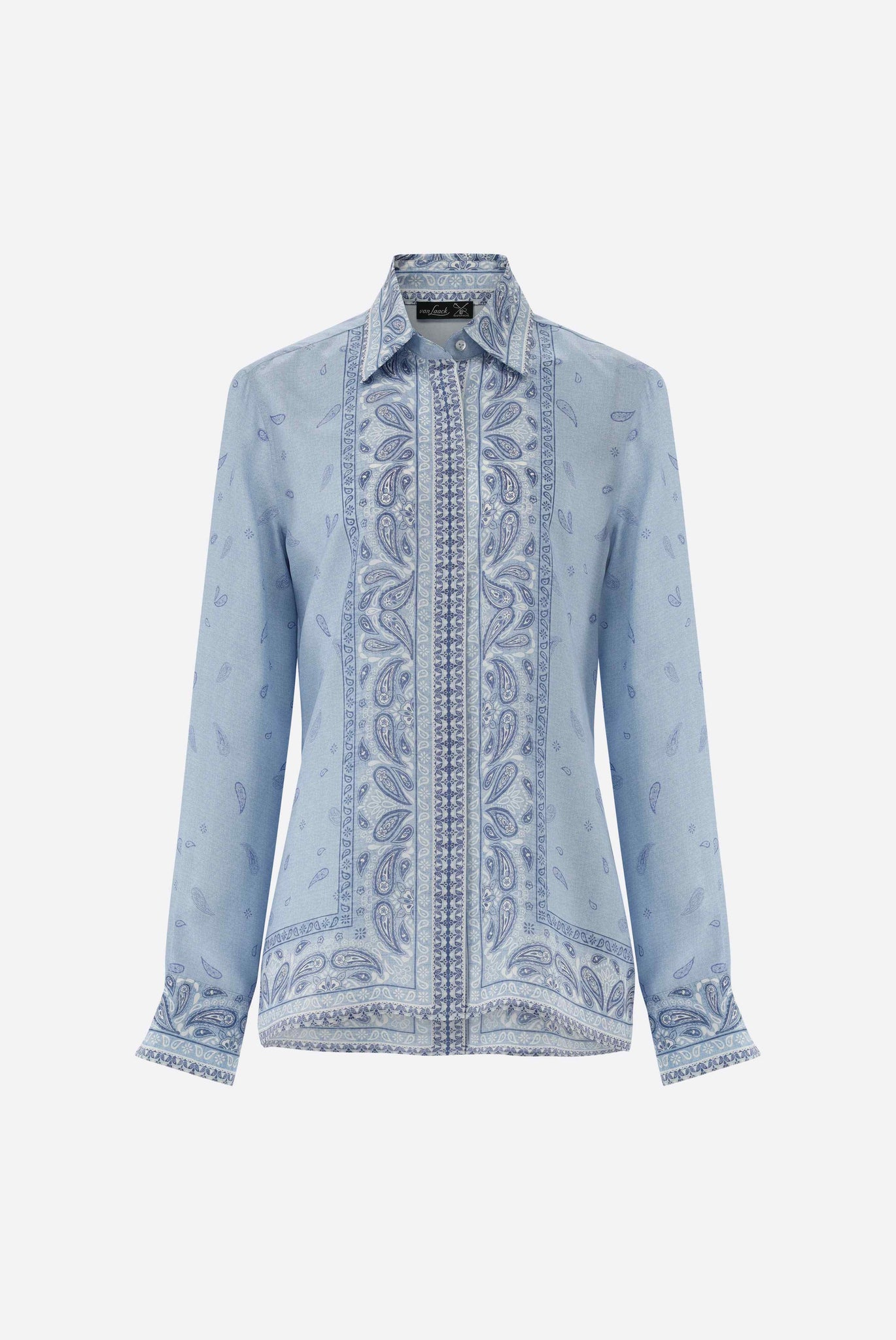 Diese taillierte Hemdbluse aus feinem Seiden-Habotai besticht durch ihren platzierten Bandana-Druck in Jeansoptik. Der leichte, weiche Stoff sorgt für luxuriösen Tragekomfort, während eine verdeckte Knopfleiste und Perlmuttknöpfe das Design abrunden. Ideal für elegante Business- und Casual-Looks. Zusammen mit dem Rock REJA-PX, kann die Bluse als total Look kombiniert werden.