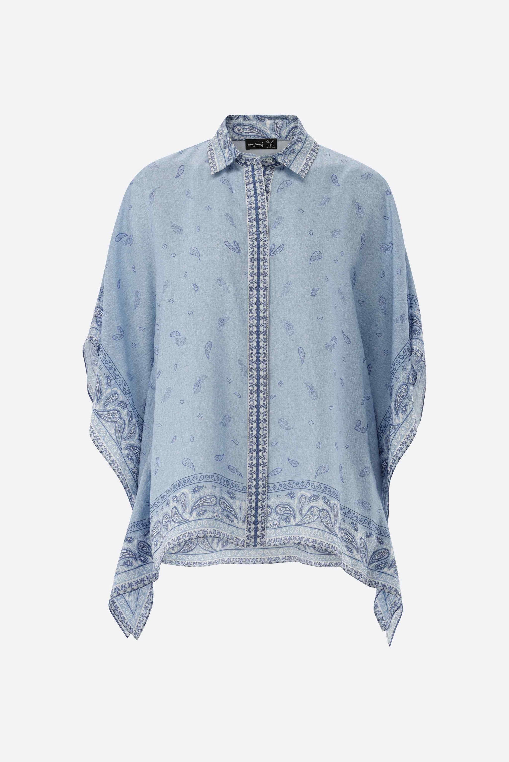 Diese lockere Tunika aus feinstem Seiden-Habotai besticht durch einen Bandana-Druck in Jeansoptik. Der leichte Stoff bietet luxuriösen Tragekomfort, während die verdeckte Knopfleiste und Perlmuttknöpfe das Design abrunden. Perfekt für Casual-Looks und Sommerpartys.