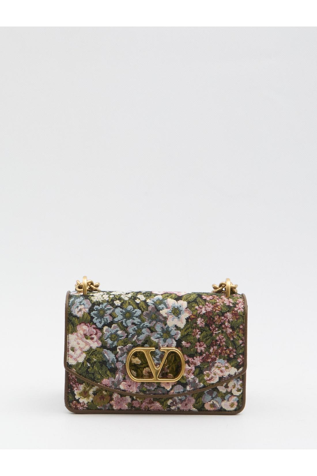Valentino Garavani bag in jacquard fabric with an Après L'Hiver motif. It features an antique gold-tone metal sliding chain shoulder strap, a VLogo Signature in metal on the front, a snap button closure on the front, two internal compartments, one zip pocket, and one flat pocket inside, with a brown leather lining. Dustbag included. Any imperfections in the leather should not be considered manufacturing defects but rather a characteristic of the material.