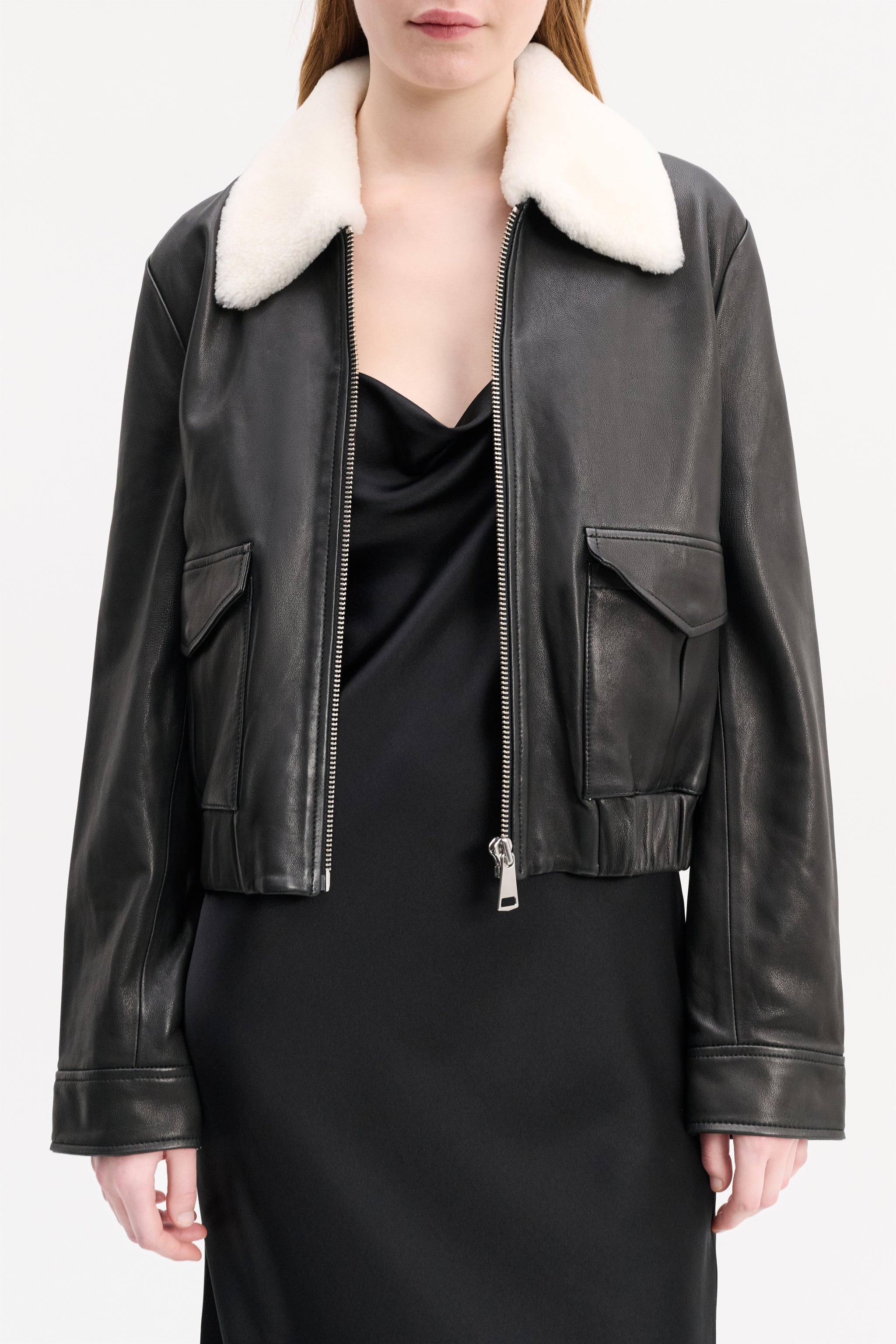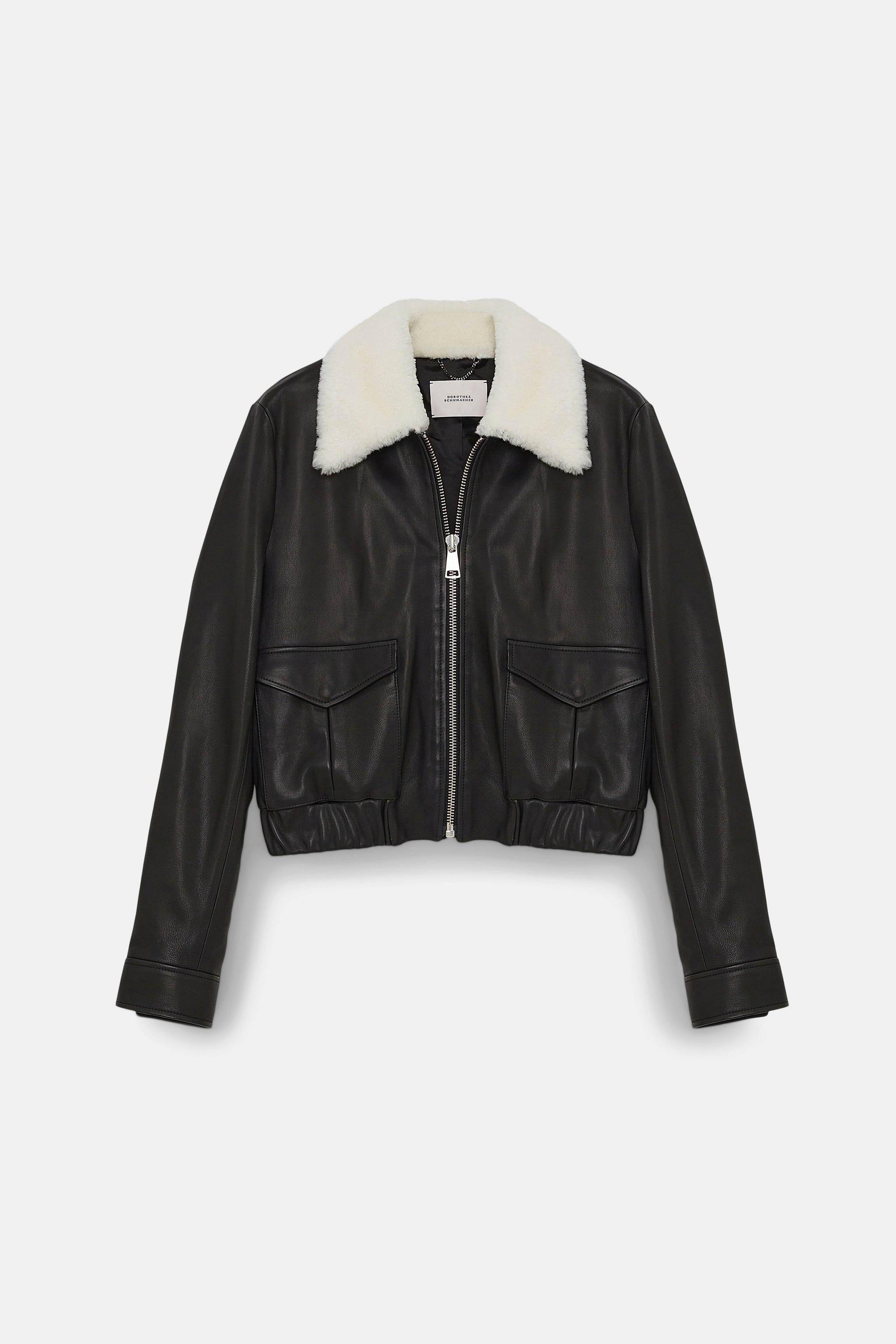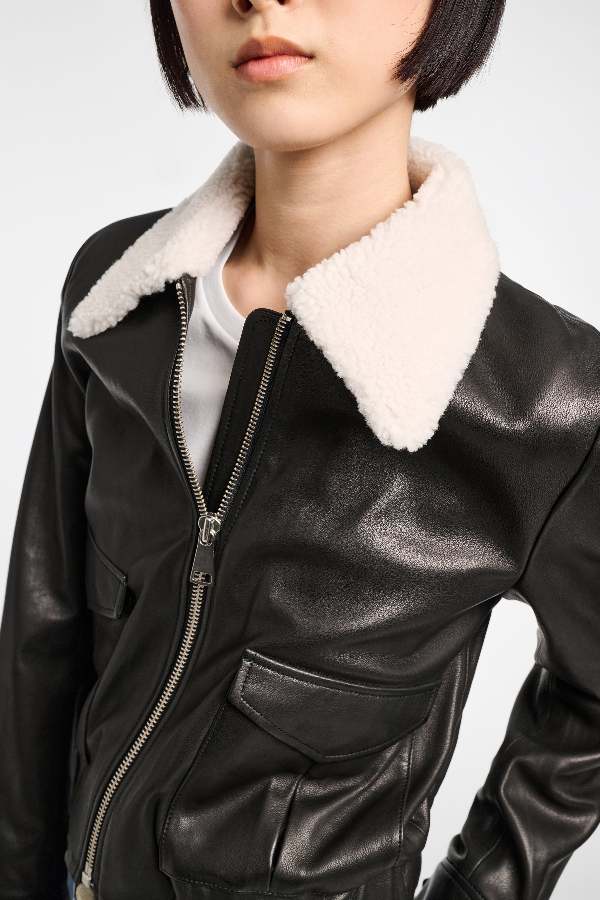 Die Lederjacke ist aus softem Lammleder gefertigt und hat einen kontrastierenden Kragen aus Lammfell. Die verkürzte Silhouette trifft auf aufgesetzte Taschen und Druckknöpfe an den Manschetten. Die Jacke hat einen elastischen Bund und einen boxy Fit.