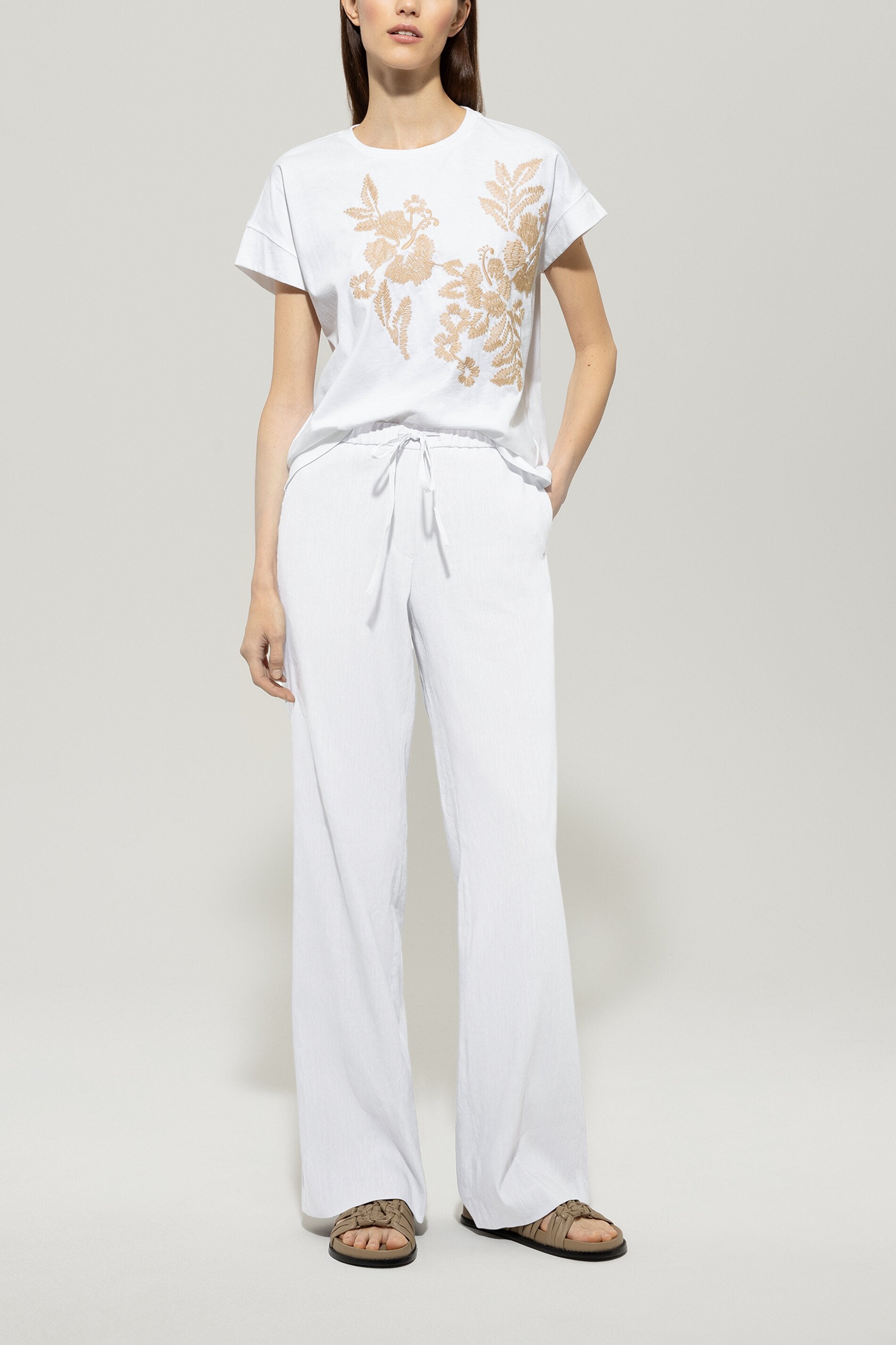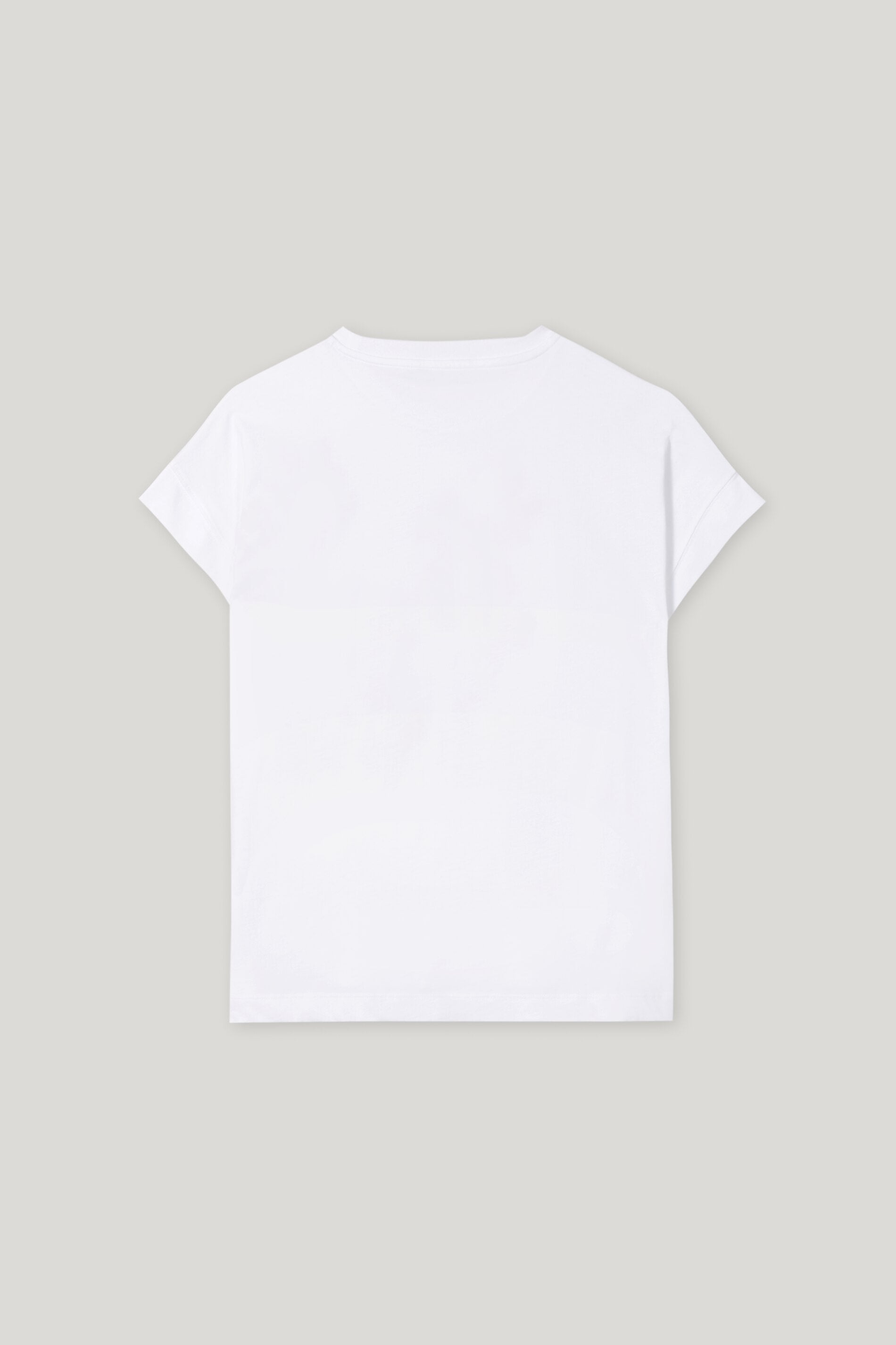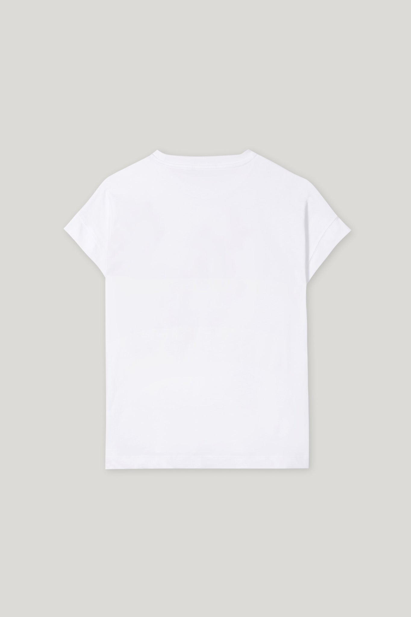 T-Shirt aus Bio-Baumwolle mit Rundhalsausschnitt, überschnittener Schulterpartie und Cap-Sleeve. Die Vorderseite zeigt eine aufwendige florale Stickerei in Kontrastfarbe.