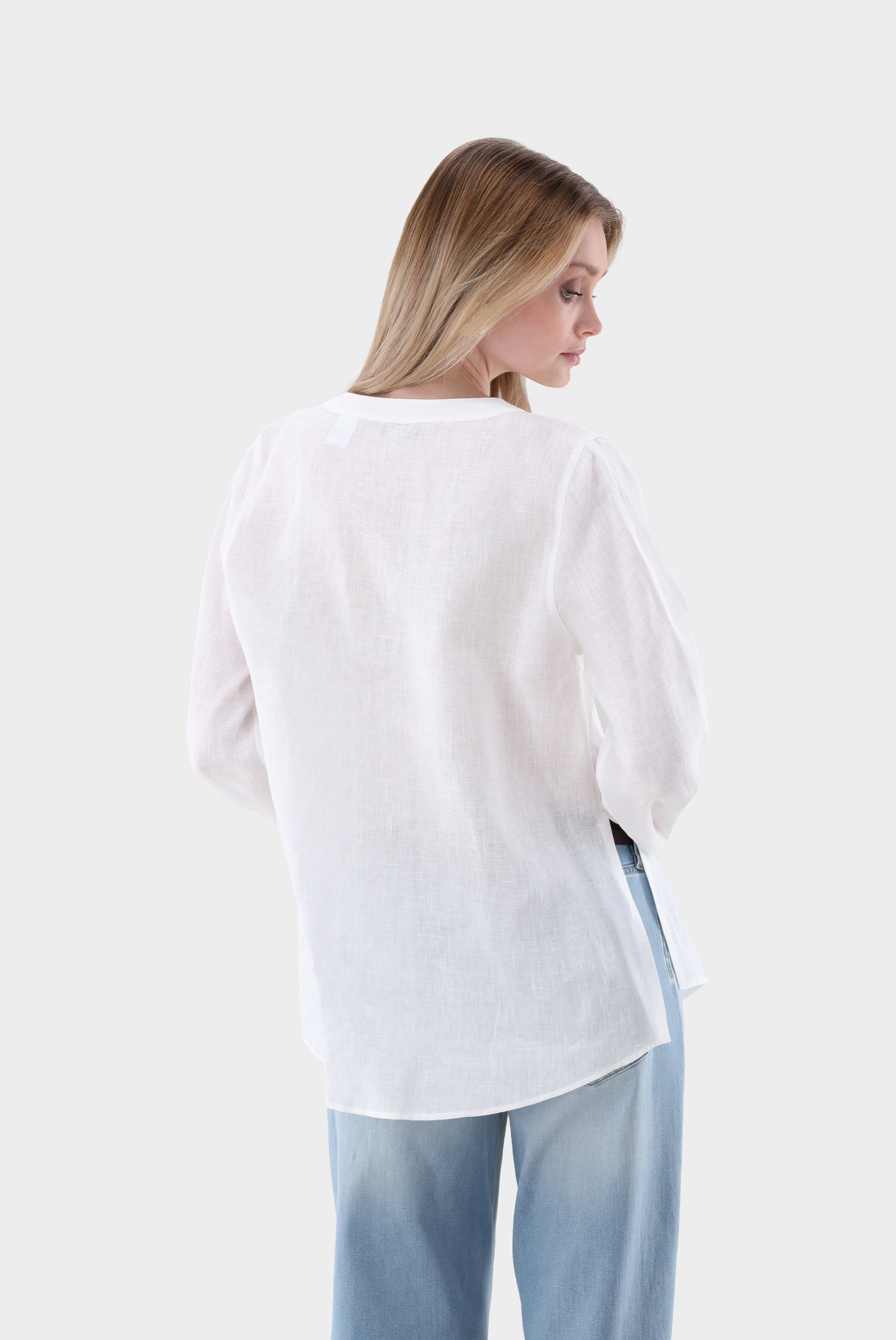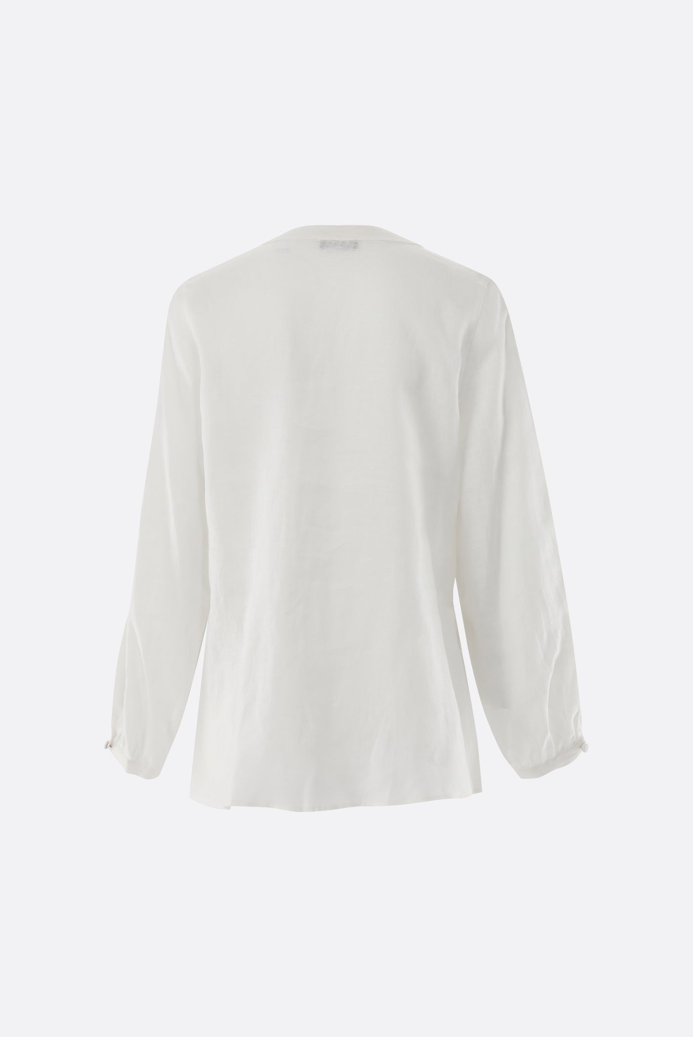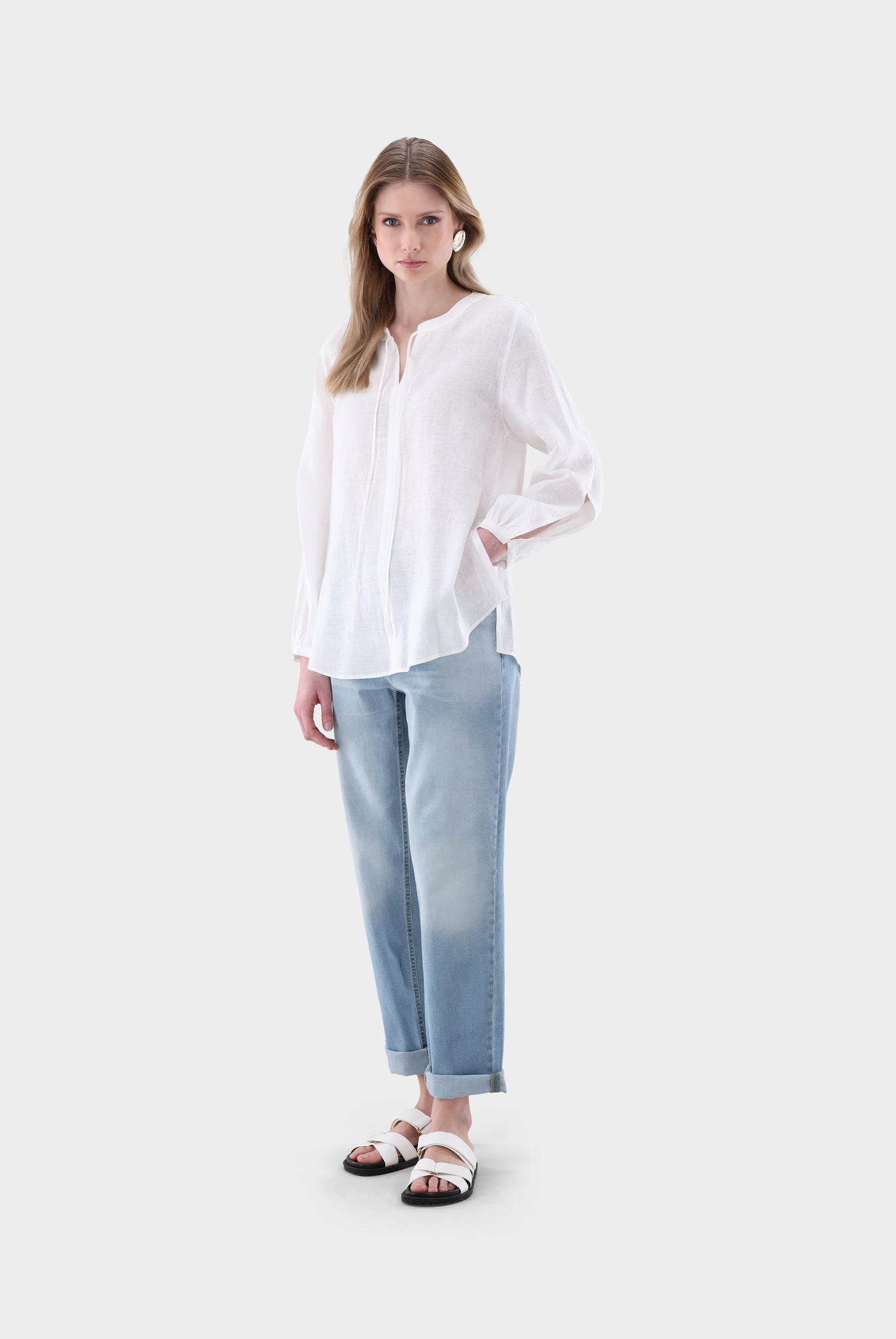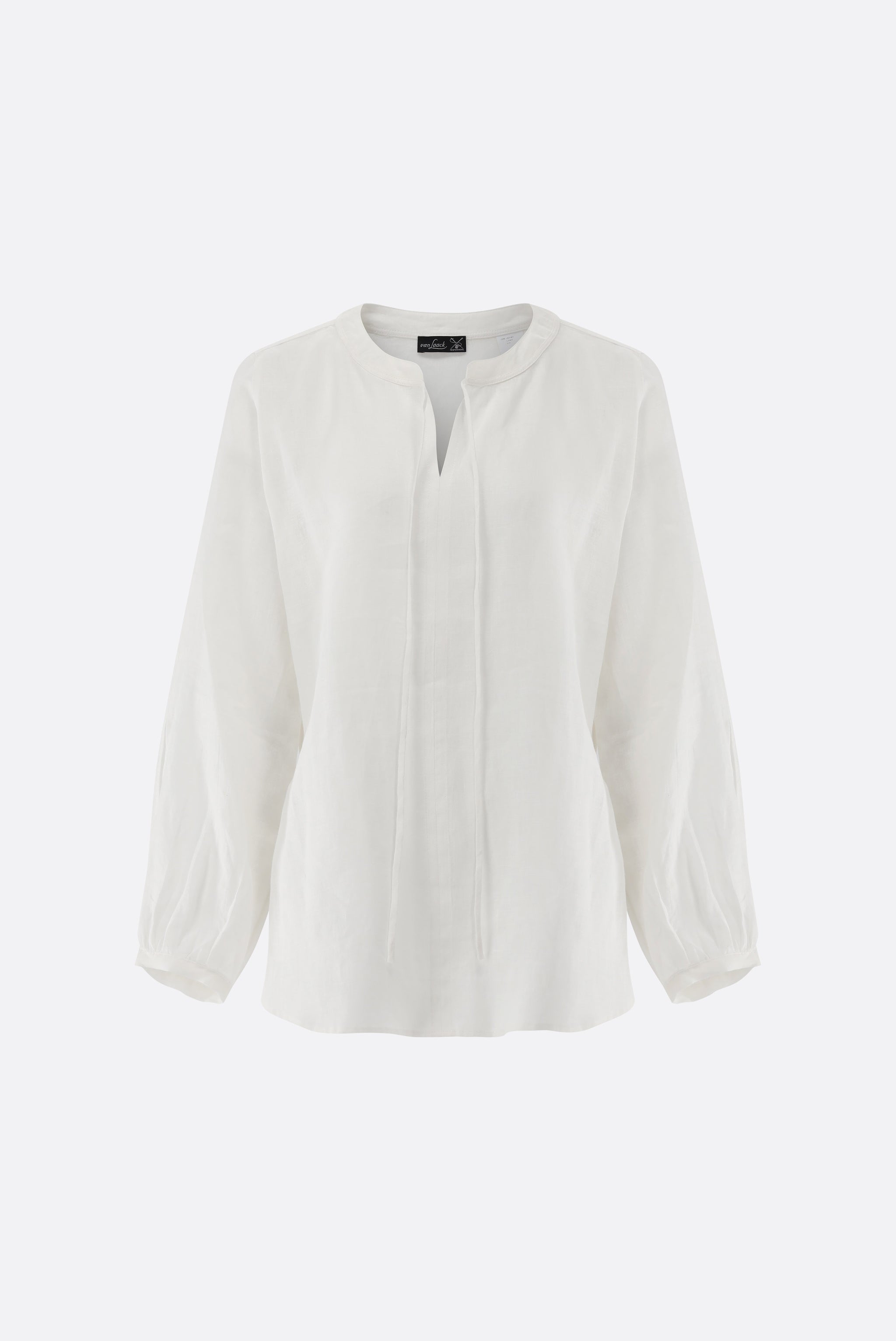 Diese Tunika Bluse wird aus hochwertigem und weichem Leinen gefertigt. Sie verfügt über lange Ärmel mit Schlitzen, einen Stehkragen, Manschetten mit Stoffbezogenem Ösenknopf und ein Bindeband am Kragen. Ideal für legere Sommerpartys oder elegante Casual-Looks.