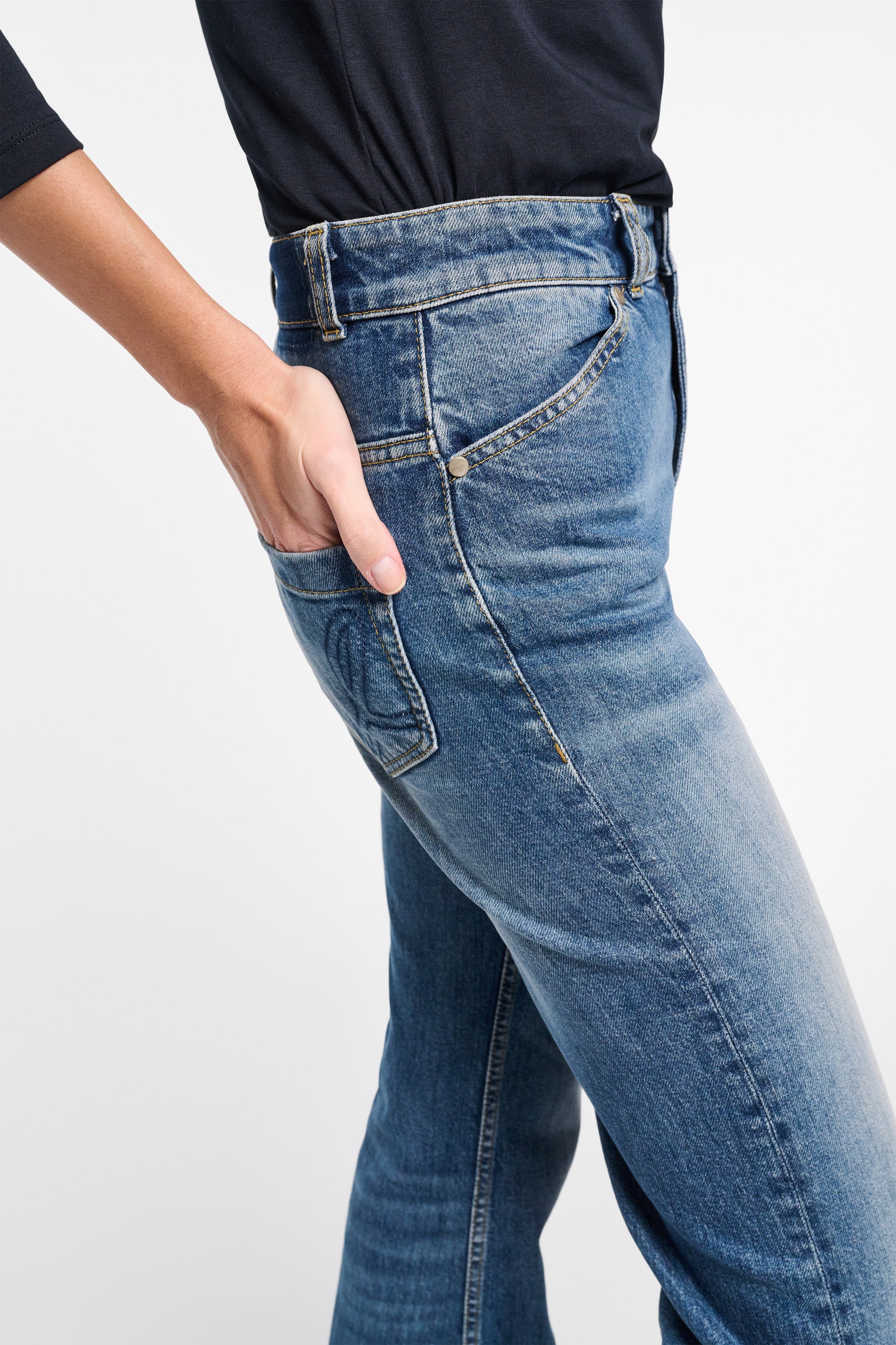 Die Jeans ist aus blue Denim gefertigt. Der klassische 5-Pocket-Style hat eine LOVE-Embroidery auf den Back Pockets und ein ausgestelltes Bein.