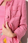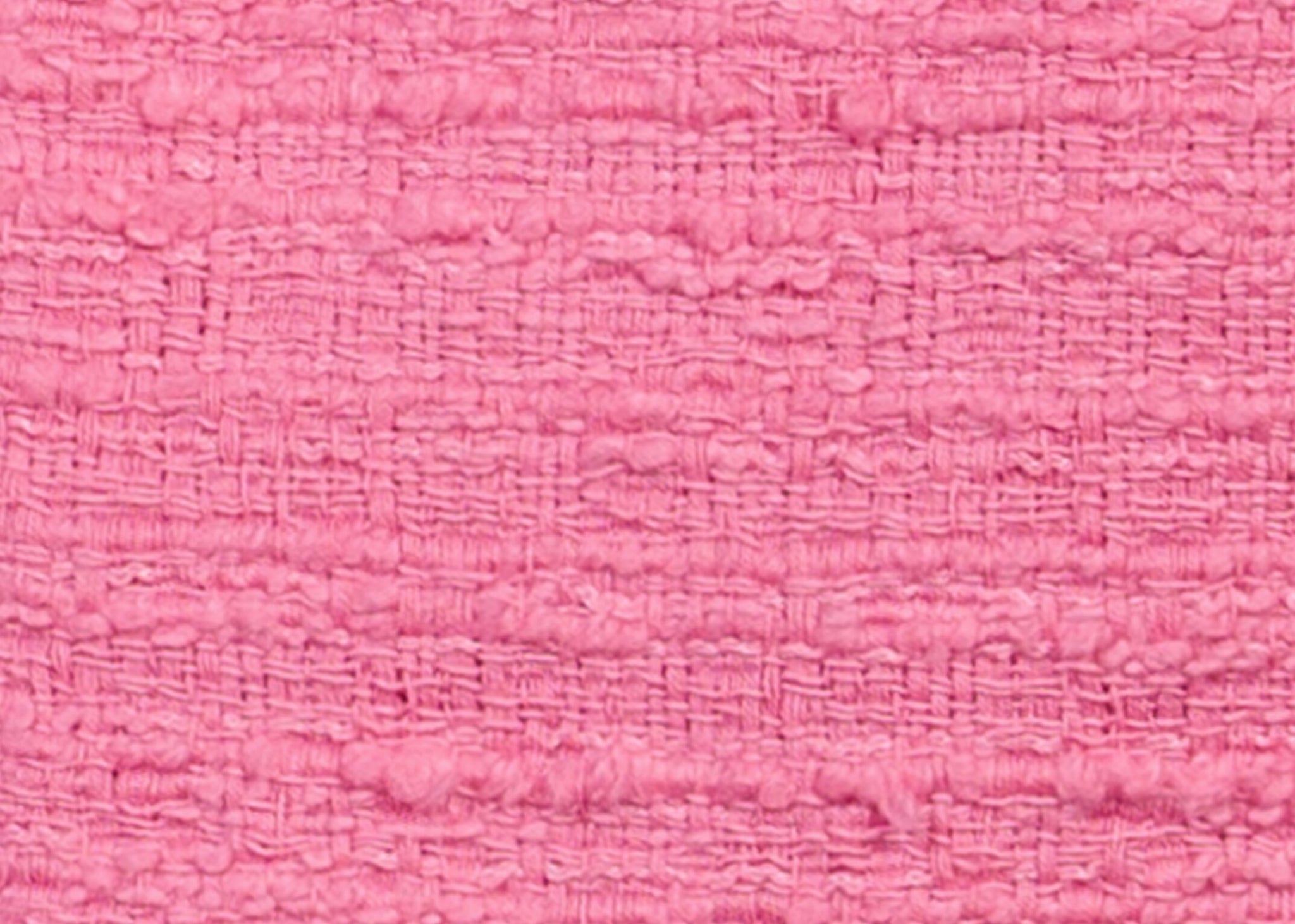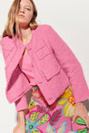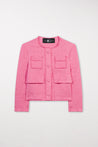 Kurze, kragenlose Jacke aus weichem Baumwoll-Tweed mit vier aufgesetzten Taschen und offenen, ausgefransten Saumkanten. Die Jacke besitzt stoffbezogene Knöpfe und ist an den Ärmeln gefüttert.