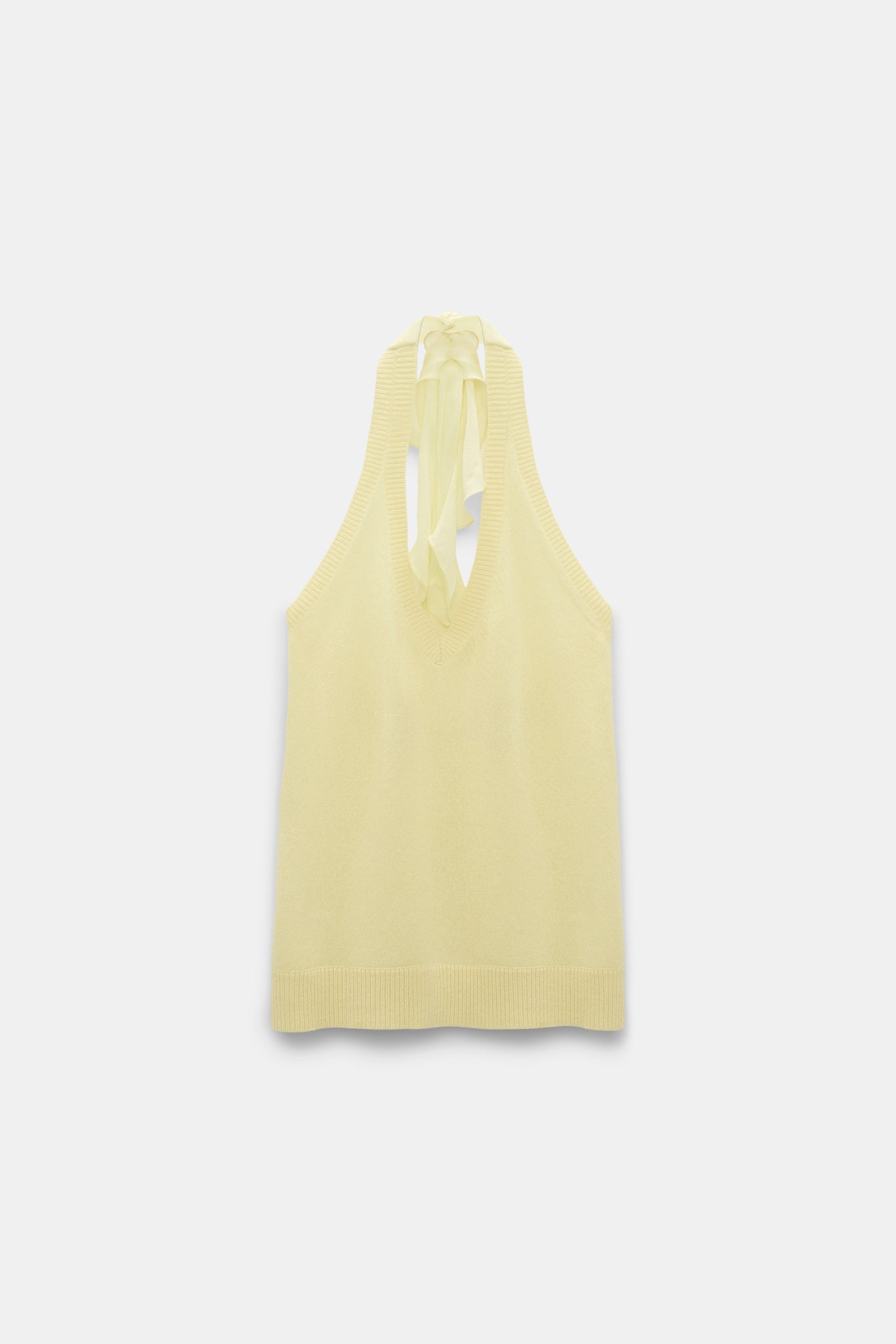 Das Halterneck-Top ist aus Merino und Kaschmir gefertigt und fühlt sich auf der Haut unglaublich weich an. Das Top wird durch Volants aus Seidengeorgette ausgezeichnet, die im Nacken gebunden werden. Der V-Ausschnitt vorne und hinten kreiert eine
