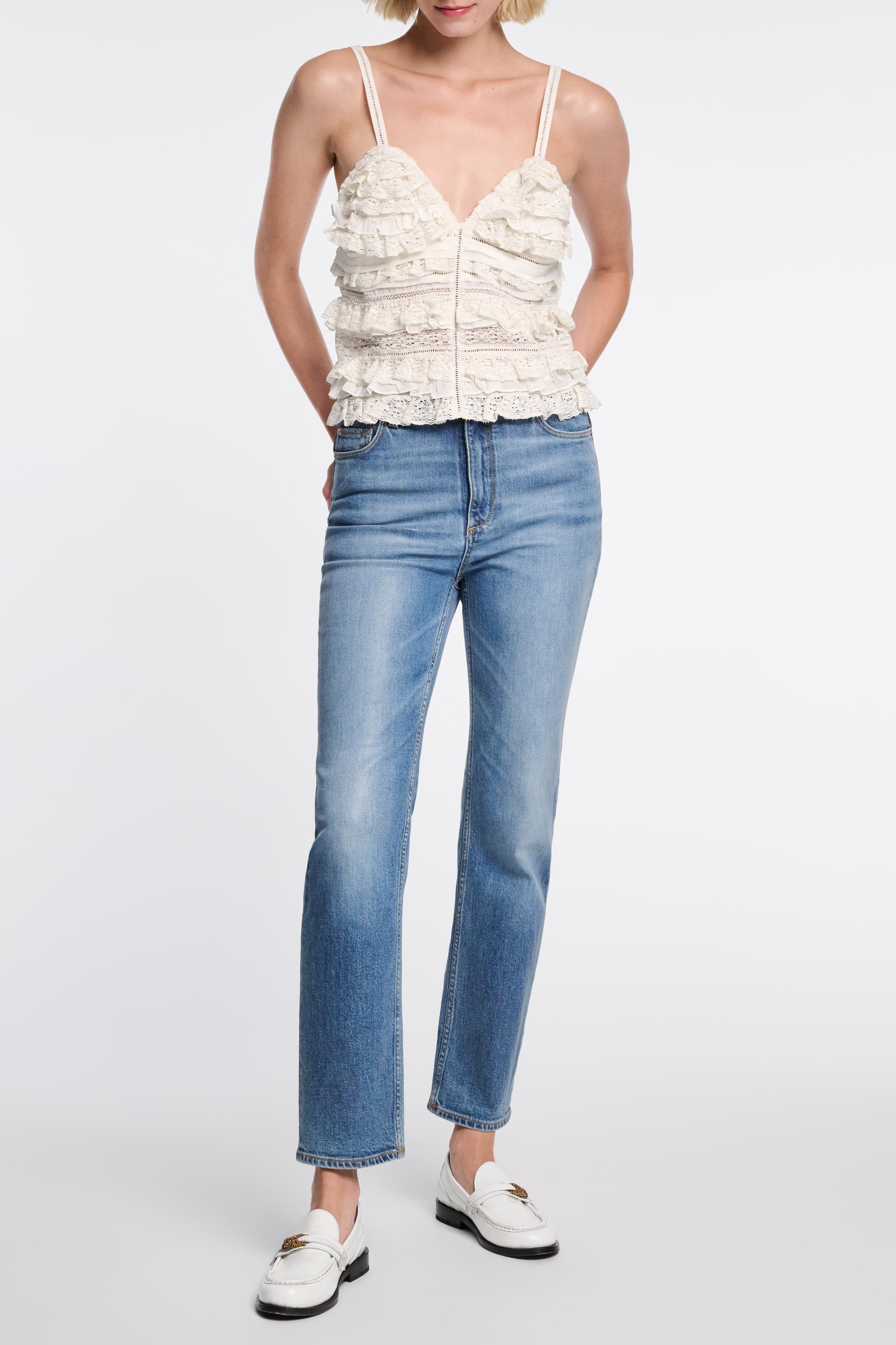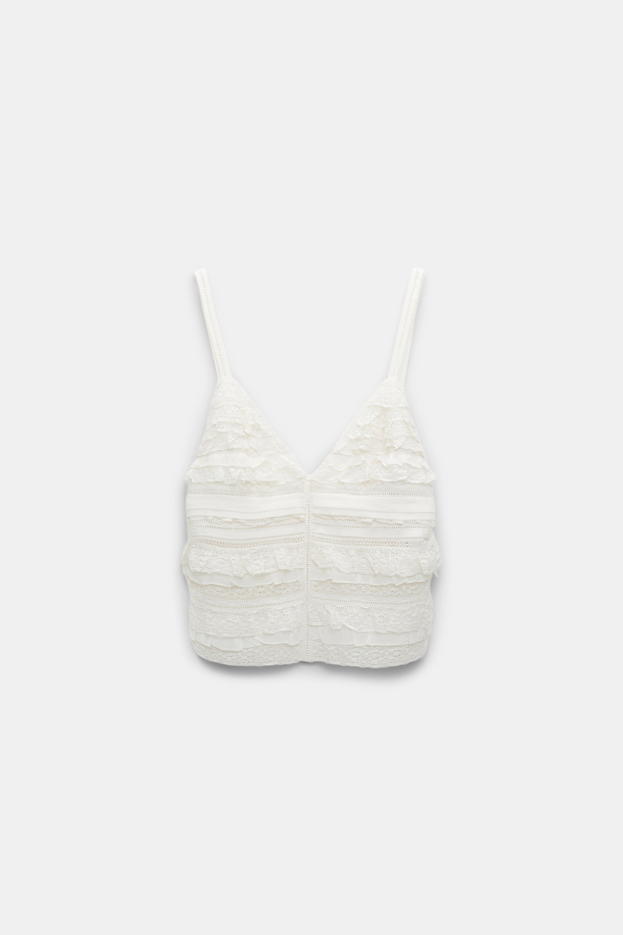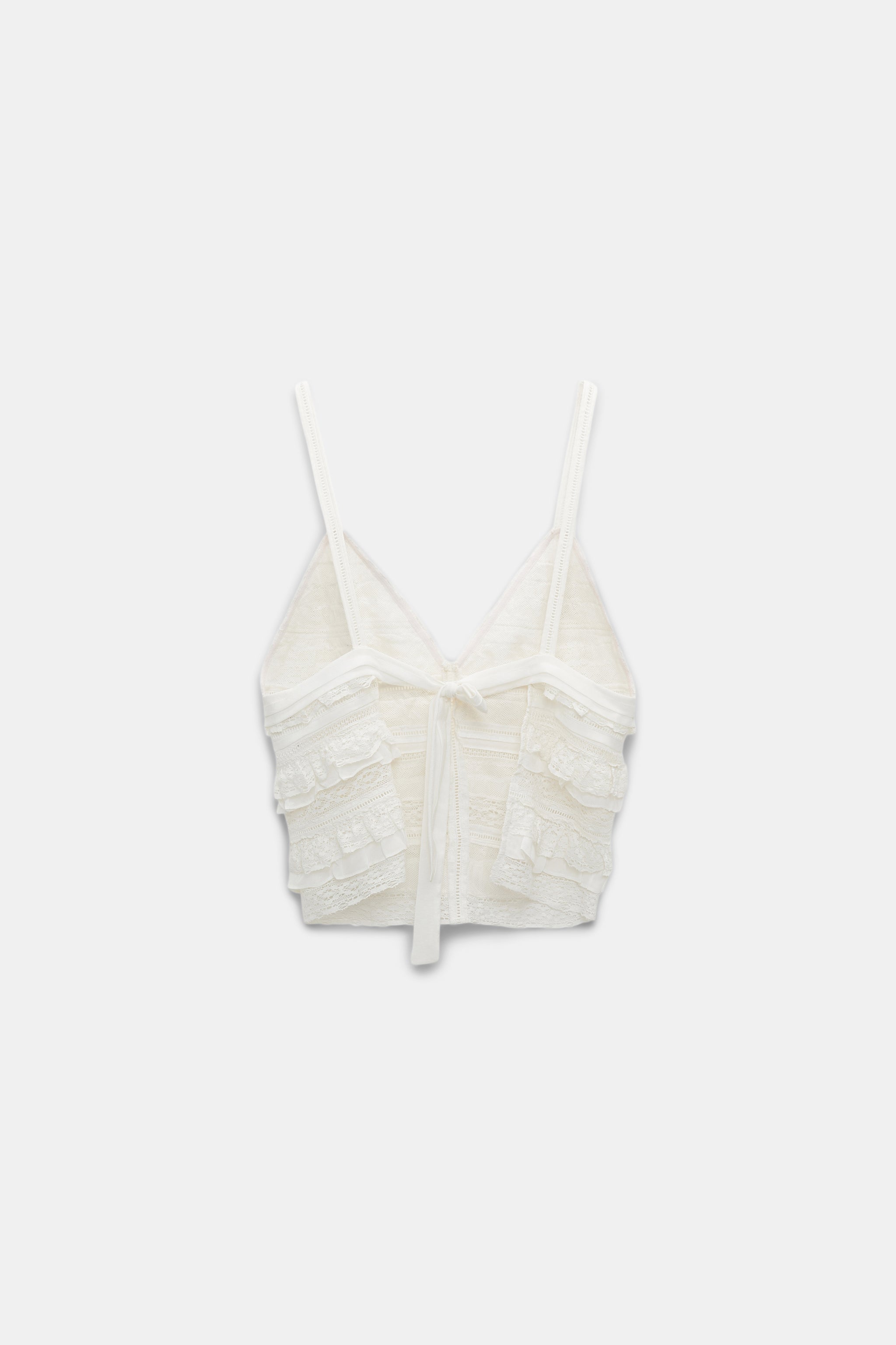 Daydreaming? No, this top is for real: Schmale Träger treffen auf einen offenen Rückenausschnitt mit Bindeband. Das V-Neck Top ist unglaublich aufwendig mit Bändern aus Spitze, Tüll und Seiden Crêpe de Chine gefertigt.