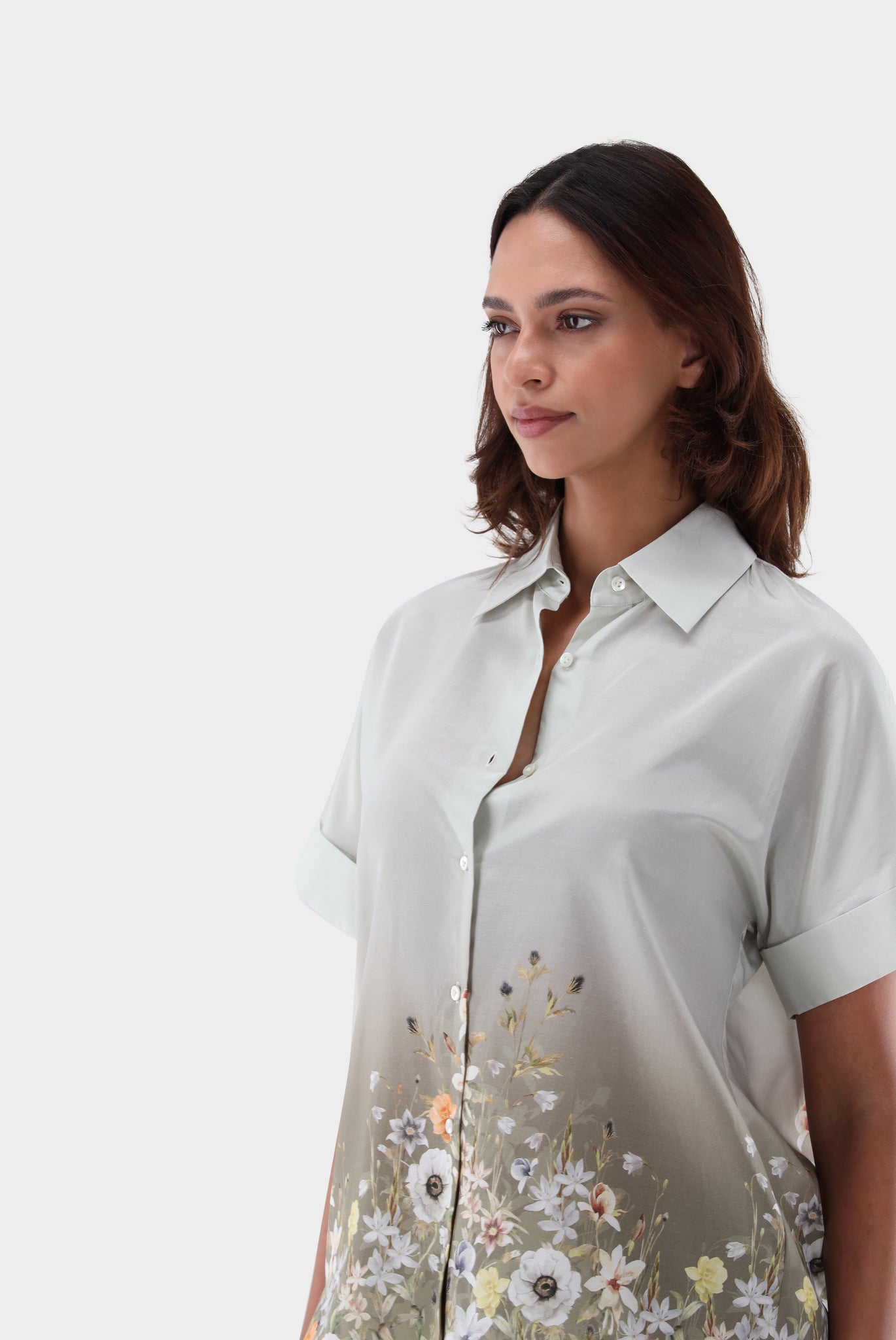 Diese lockere Hemdbluse vereint elegantes Design mit hohem Tragekomfort. Der angeschnittene Halbarm mit kleinem Aufschlag sorgt für einen modernen Look, während der "Flower Field"-BlumenDruck am Saum mit einem leichten Fade-out-Effekt im Uni-Bereich das Design harmonisch ergänzt. Gefertigt aus einer luxuriösen Seiden-Baumwoll-Mischung bietet die Bluse ein angenehmes Tragegefühl. Perlmuttknöpfe runden das edle Erscheinungsbild ab. Ideal für legere Outfits oder stilvolle Business-Looks.