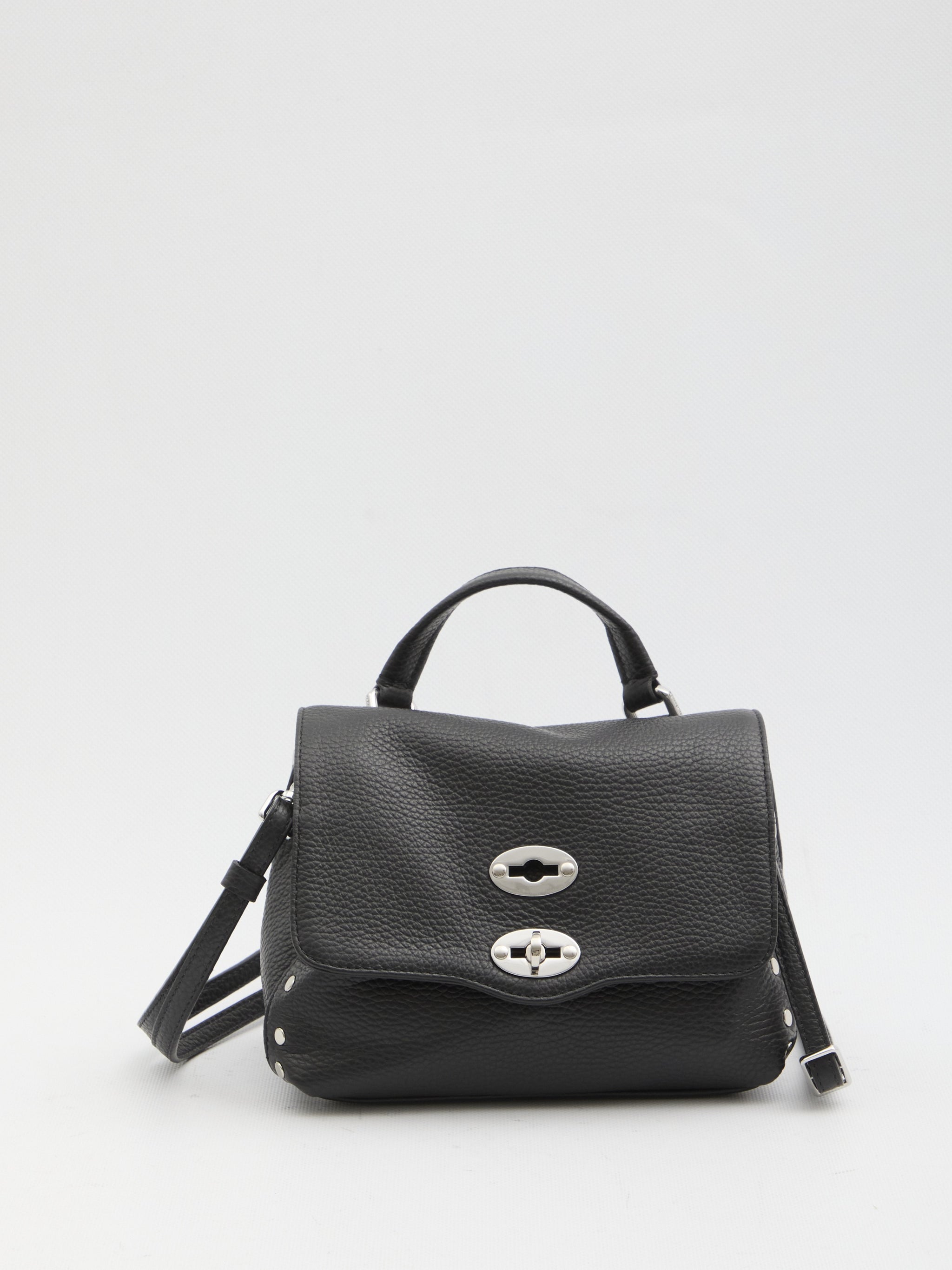 Black hammered calf leather bag. It features a fixed top handle, an adjustable and removable shoulder strap, a double turn-lock closure, metal feet, one main compartment, one internal flat pocket, and a cotton lining. Dustbag included. Any imperfections in the leather are not to be considered manufacturing defects, but a characteristic of the material.