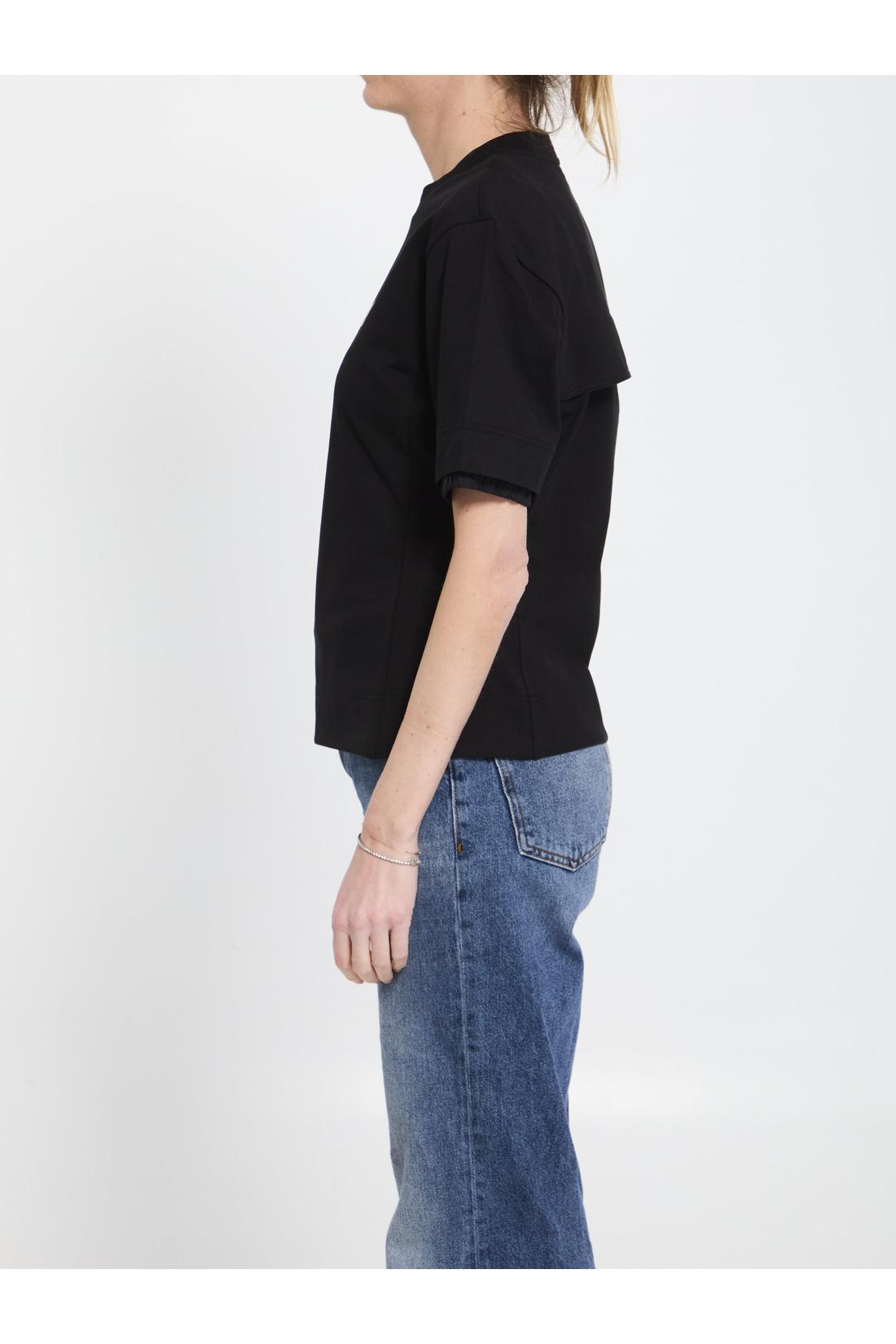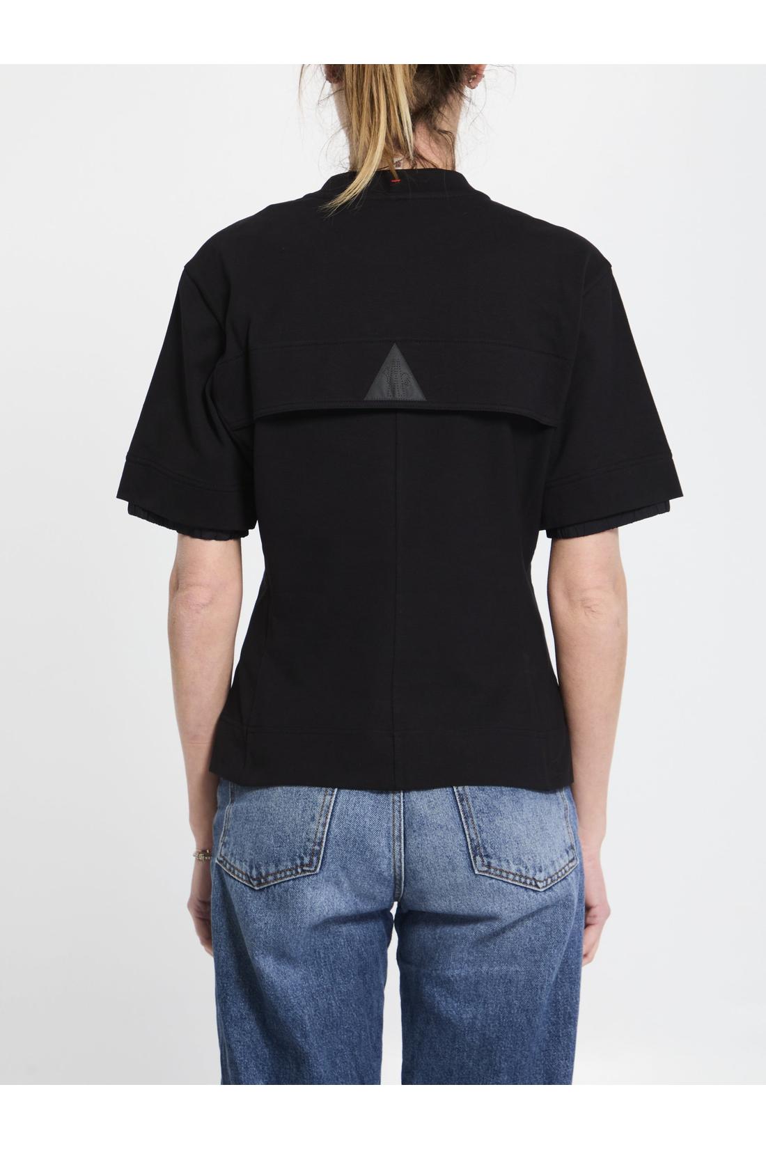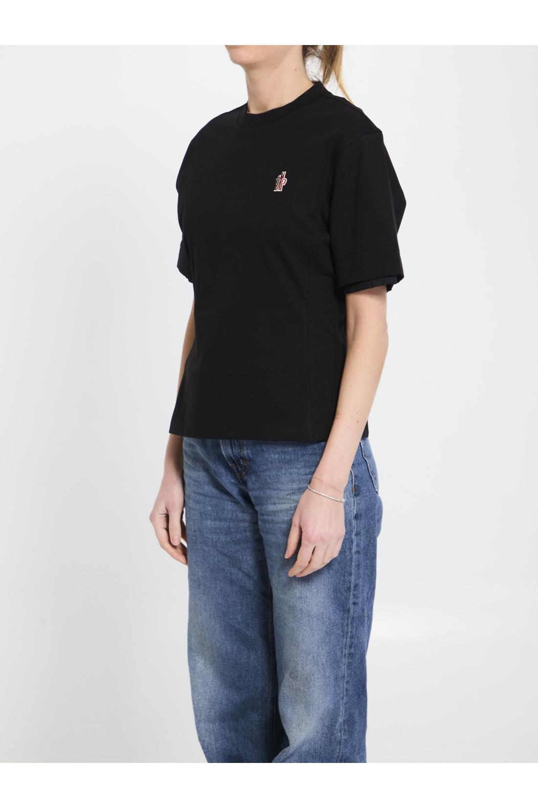 Black stretch cotton T-shirt. It features a ribbed crew neck, short sleeves with tonal nylon inserts, an applied logo patch on the chest, a breathable detail on the back, a narrower waist. Regular fit.