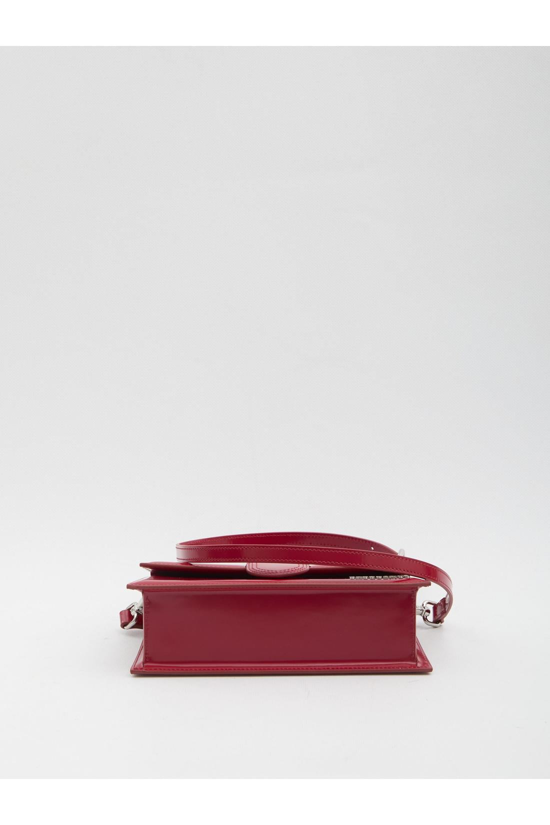 Le Grand Bambino bag in red patent leather. It features a fixed top handle, visible stitching, a gold metal logo on the front, an external flat back pocket, a removable and adjustable shoulder strap, a magnetic flap closure, one main internal compartment, one internal flat pocket, and cotton lining. Dust bag included. Any leather imperfections should not be considered manufacturing defects, but a characteristic of the material.