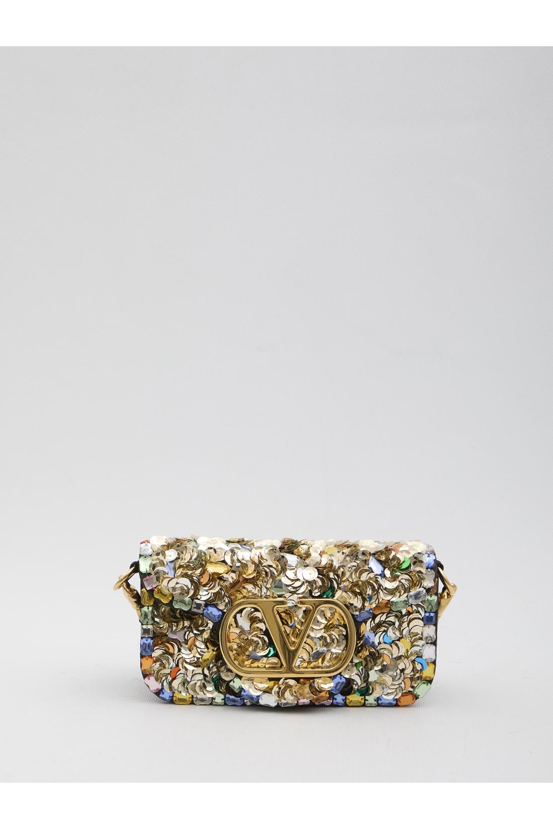 Black moiré fabric bag with multicolor sequins applied. It features a removable handle, removable chain shoulder strap, metal VLogo Signature on the front, snap button closure, one internal compartment, one internal flat pocket, and fabric lining. Dustbag included.