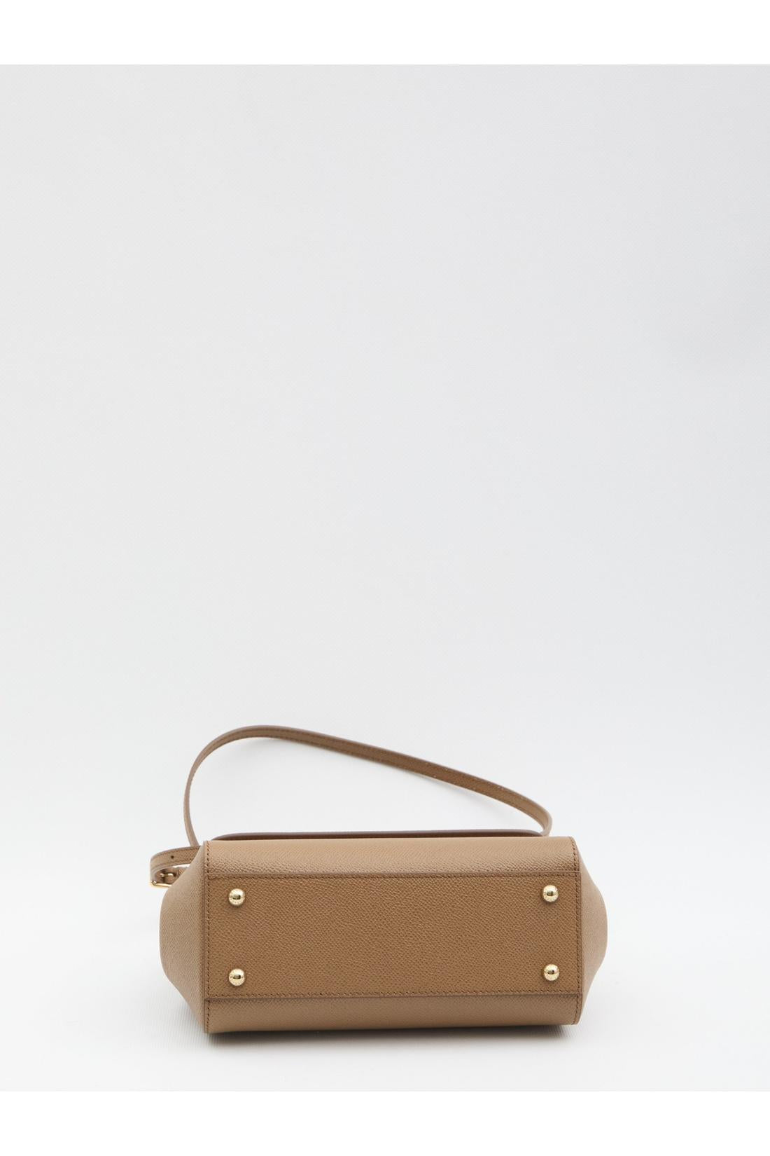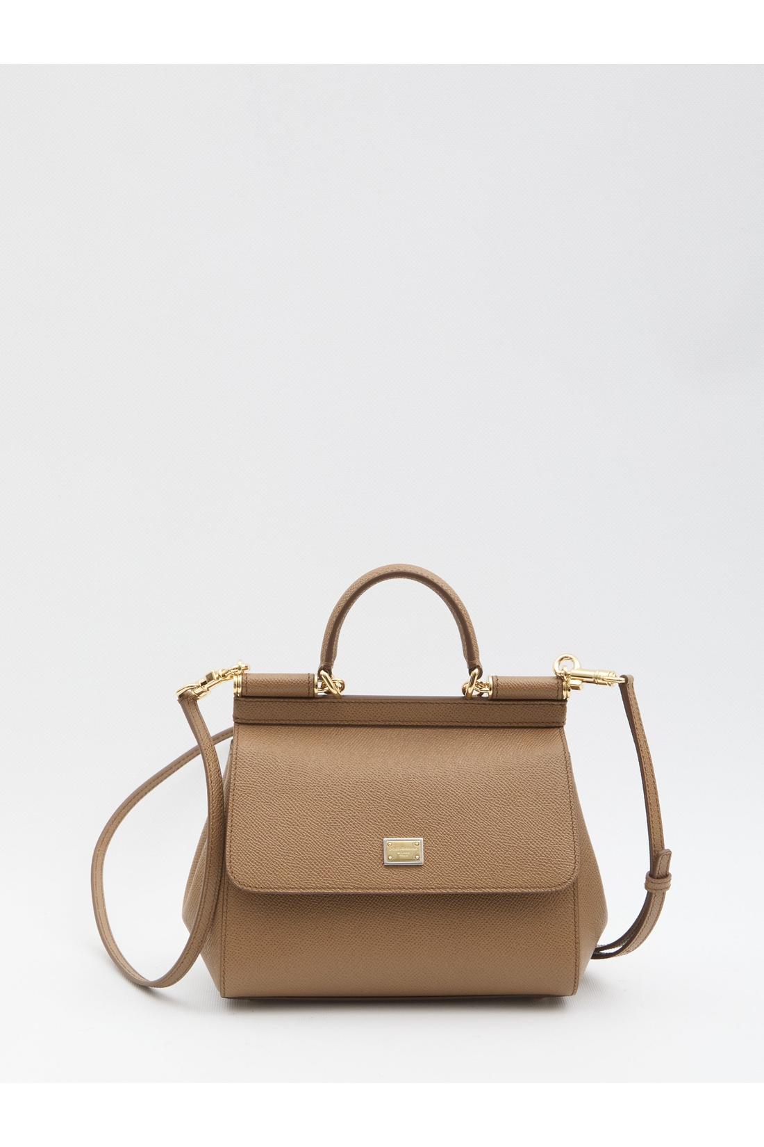 Top-handle bag in caramel brown calfskin. Features a front flap with hidden closure, bi-metal logo tag, top handle, and a removable and adjustable shoulder strap. Lined with printed fabric, it has a single compartment with an open pocket and metal feet at the base. Dust bag included.