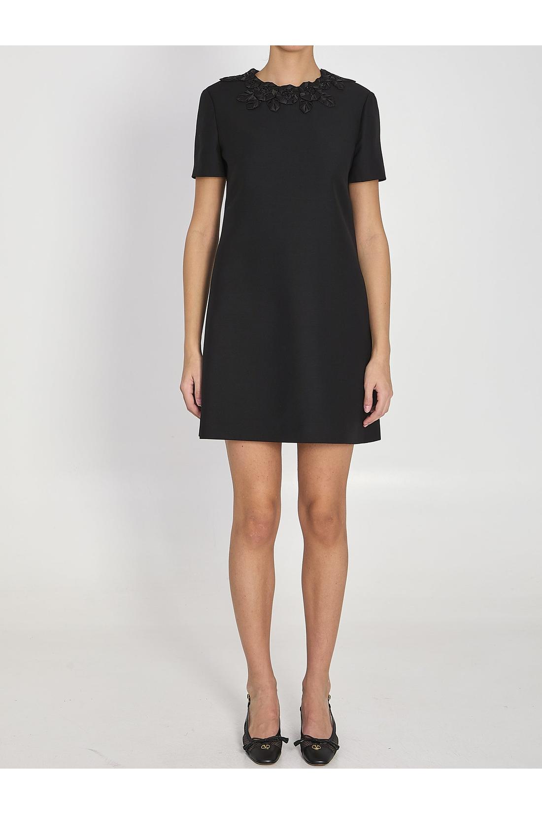 Black short dress in virgin wool and silk. Featuring a tonal embroidered crewneck, short sleeves, rear zip closure, and a silk lining. Regular fit.