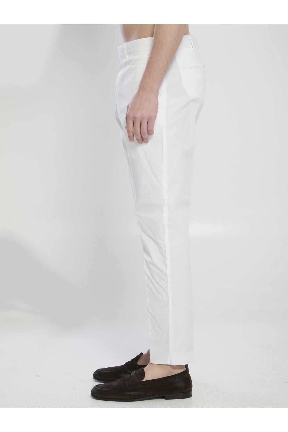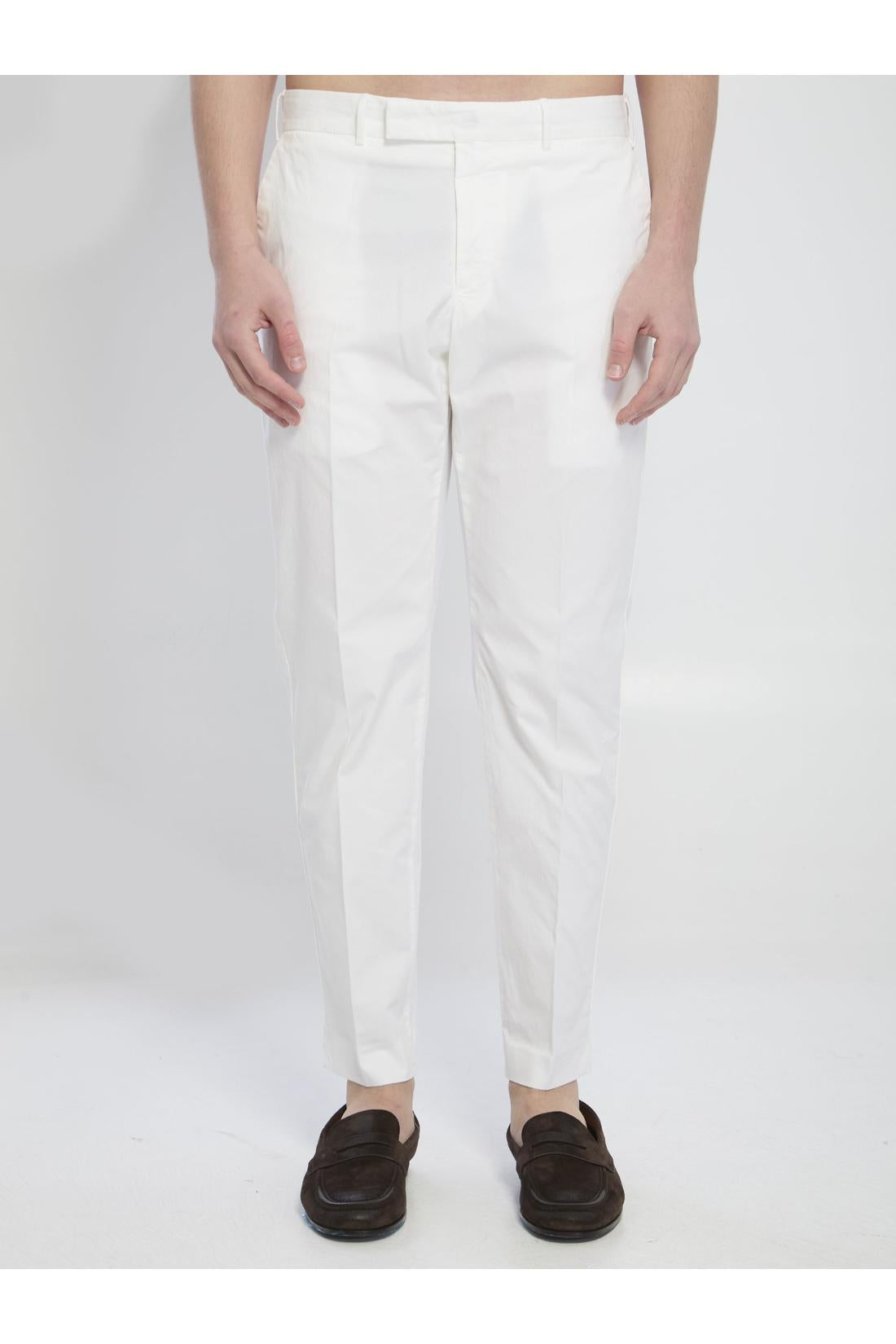 White stretch cotton trousers. They feature belt loops, a zip, hook and button closure, two side pockets, two rear welt pockets, pressed front and back creases, a mid-rise waist, and a straight leg. Regular fit.