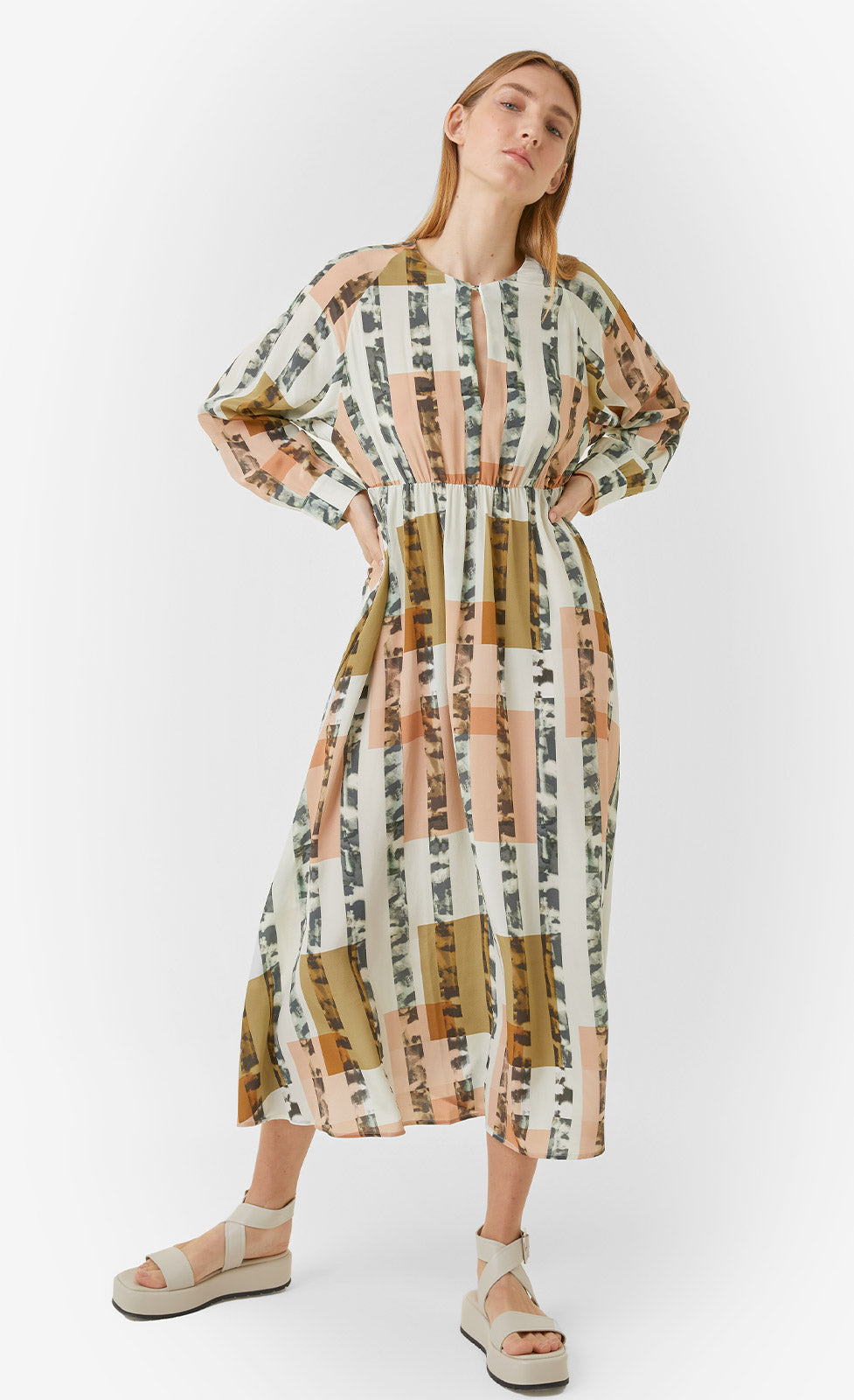 Elegantes Design mit aufregendem Alloverprint. Dieses Midikleid aus reiner Seide hat einen Rundhalsausschnitt mit knöpfbarem Schlitz, Raglanärmel und eine elastische Taillennaht.