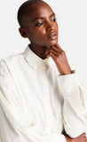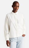 Der Hemdblusenkragen sorgt zusammen mit den voluminösen Ärmeln und den Faltendetails für einen coolen Look.