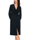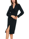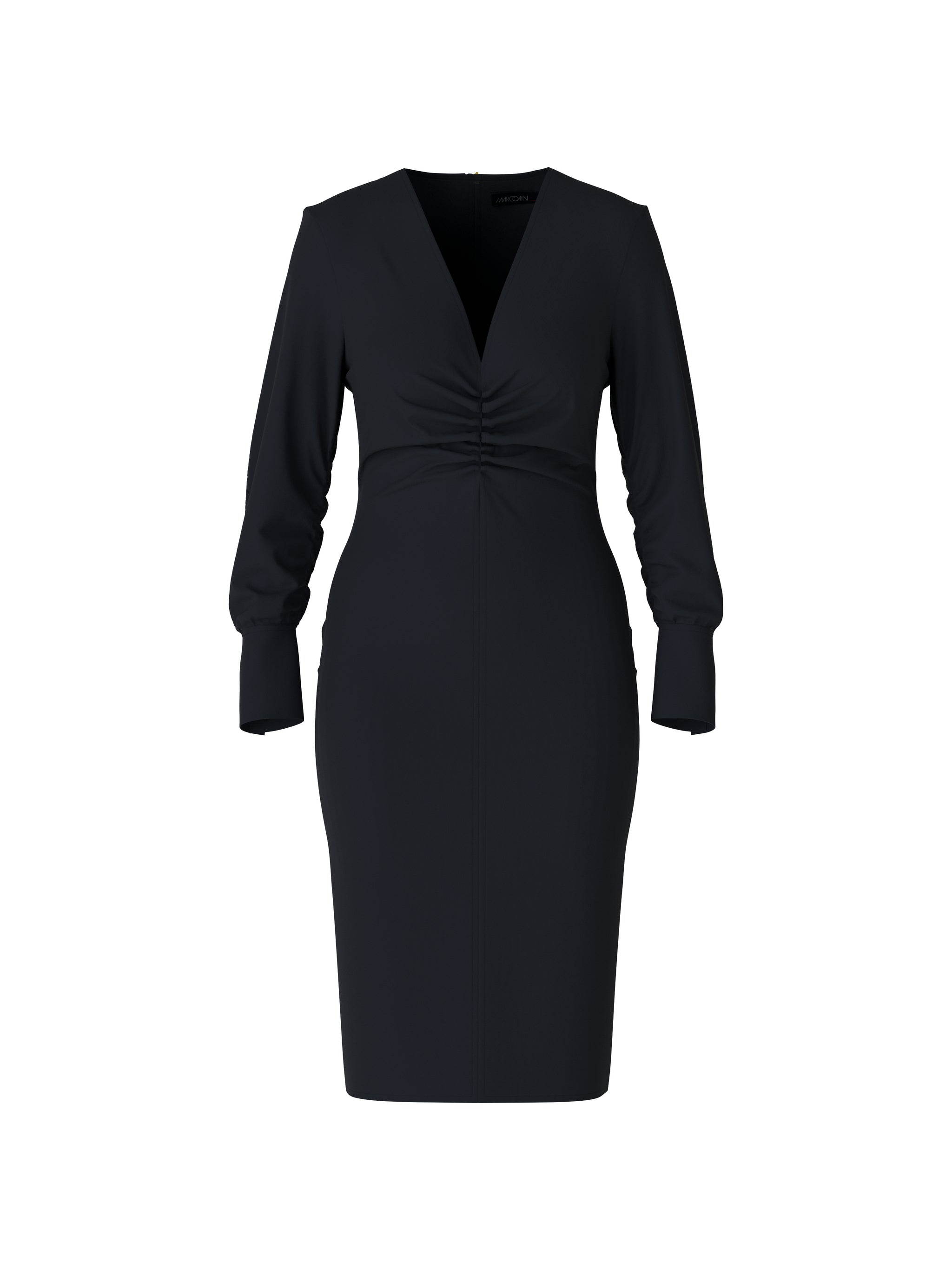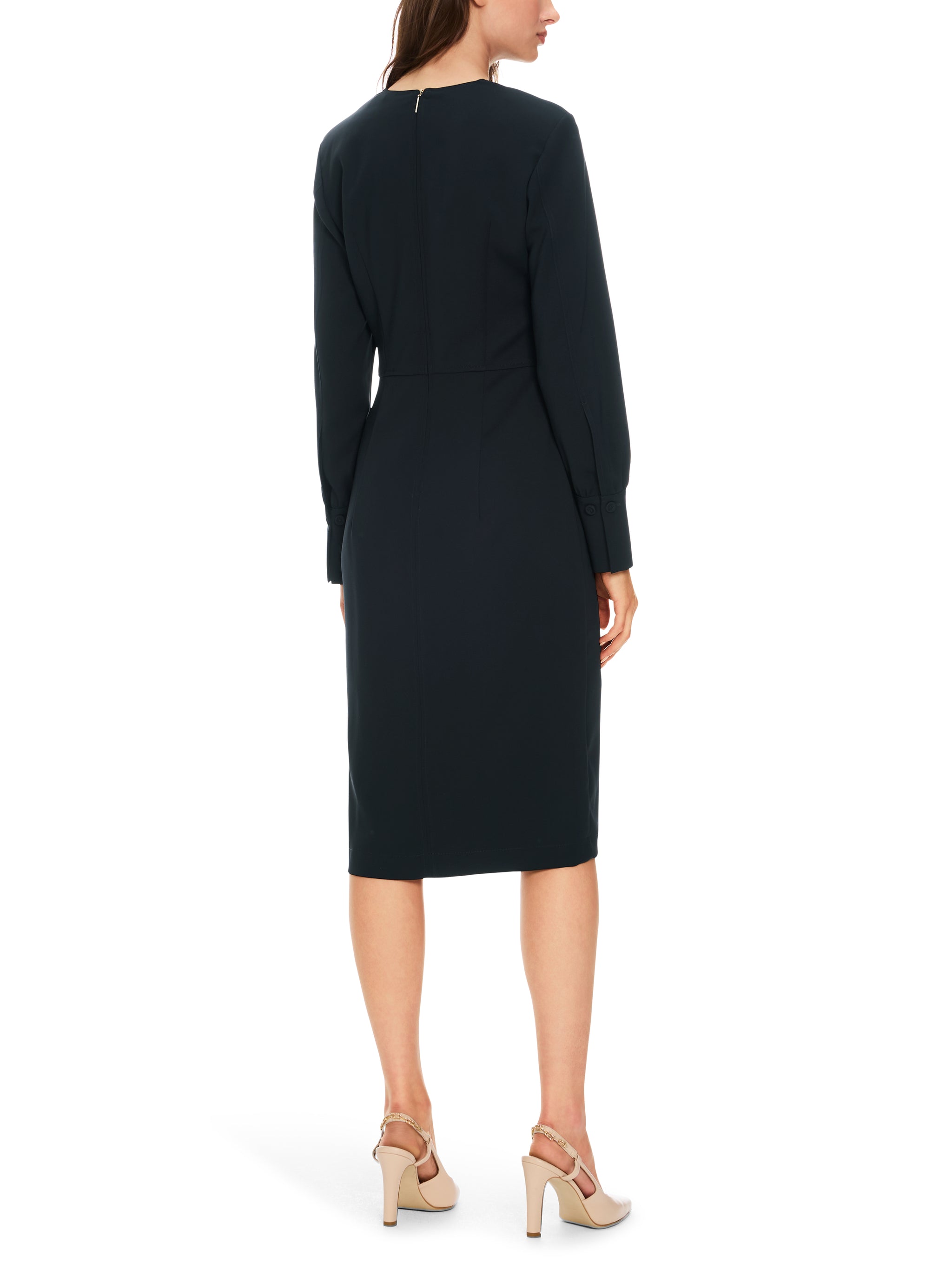 Der tiefe V-Neck von diesem Kleid sowie das geschlitzte Vorderteil ziehen garantiert die Blicke an. Es ist im Vorderteil gerafft, was das fließende Material gelungen unterstreicht. Die langen Ärmel kommen mit Manschetten und schmückenden Knöpfen. Abnäher im Rücken betonen die figurnahe Silhouette. Geschlossen wird das Kleid mit einem Rückenreißverschluss.