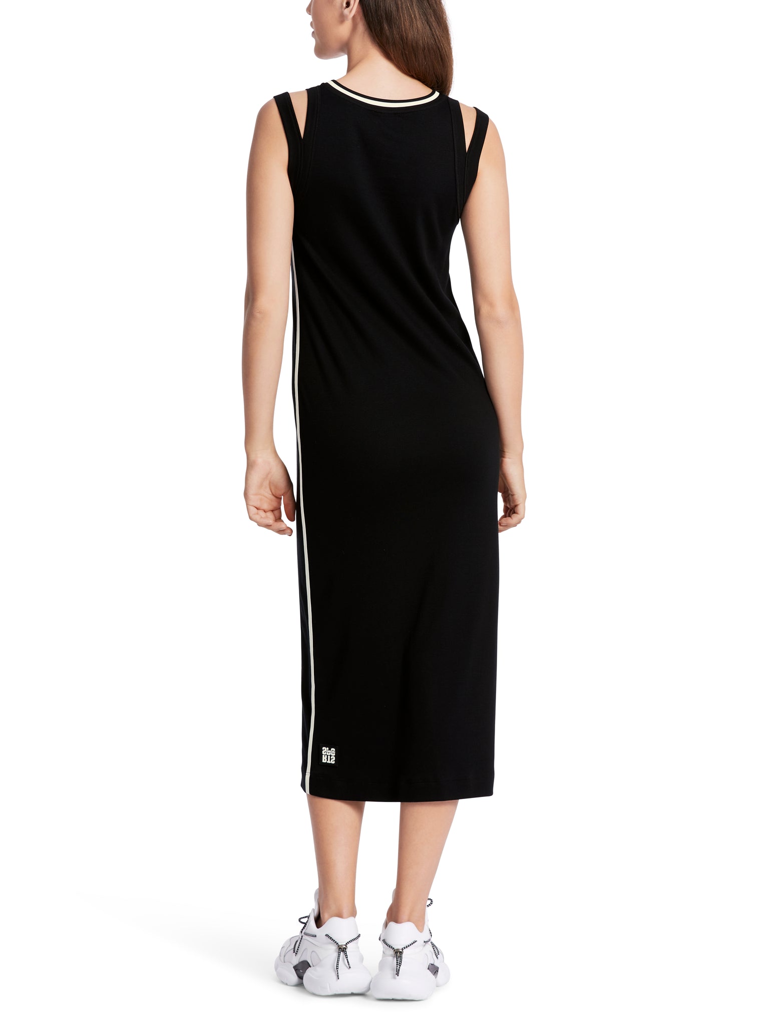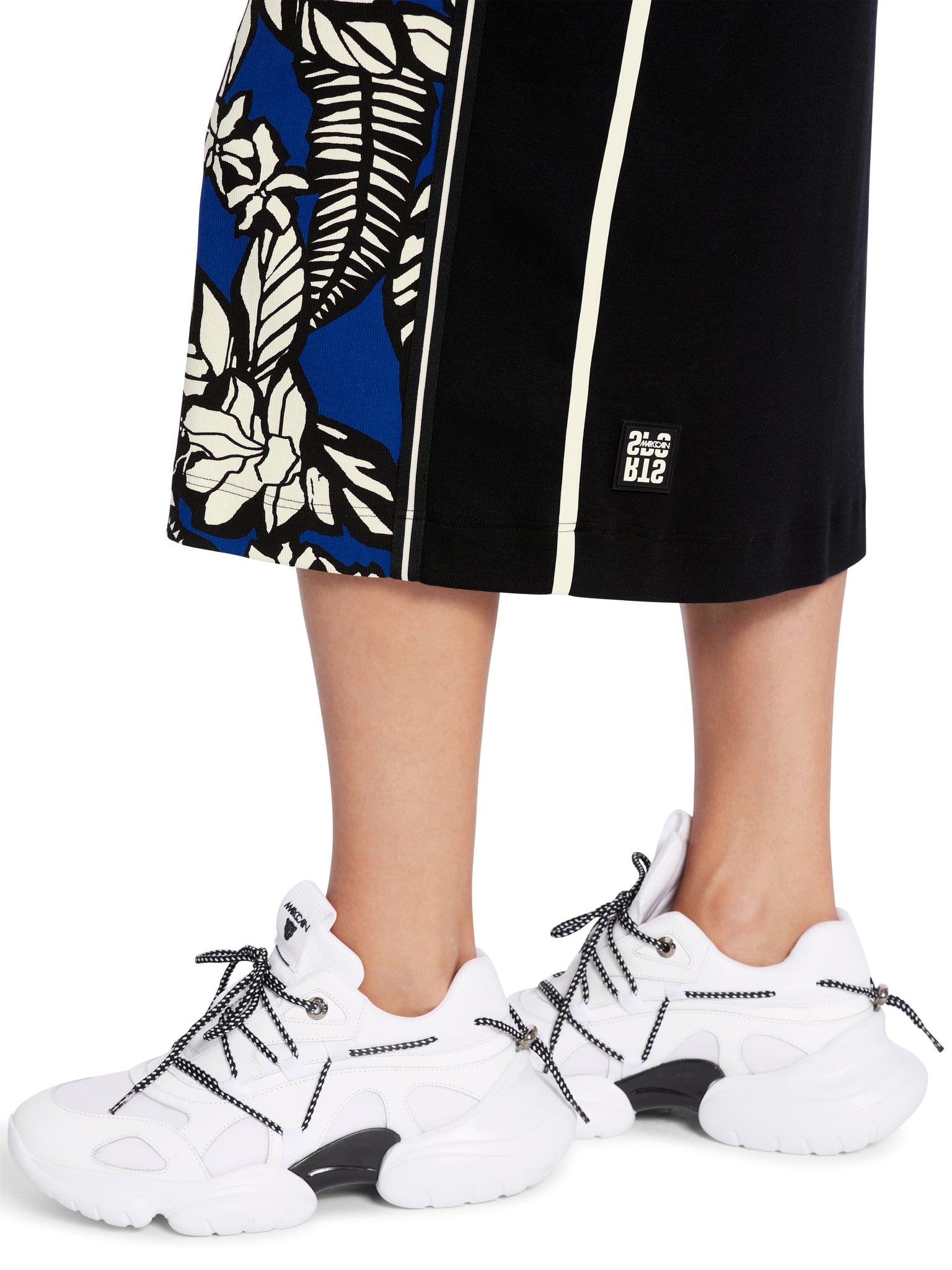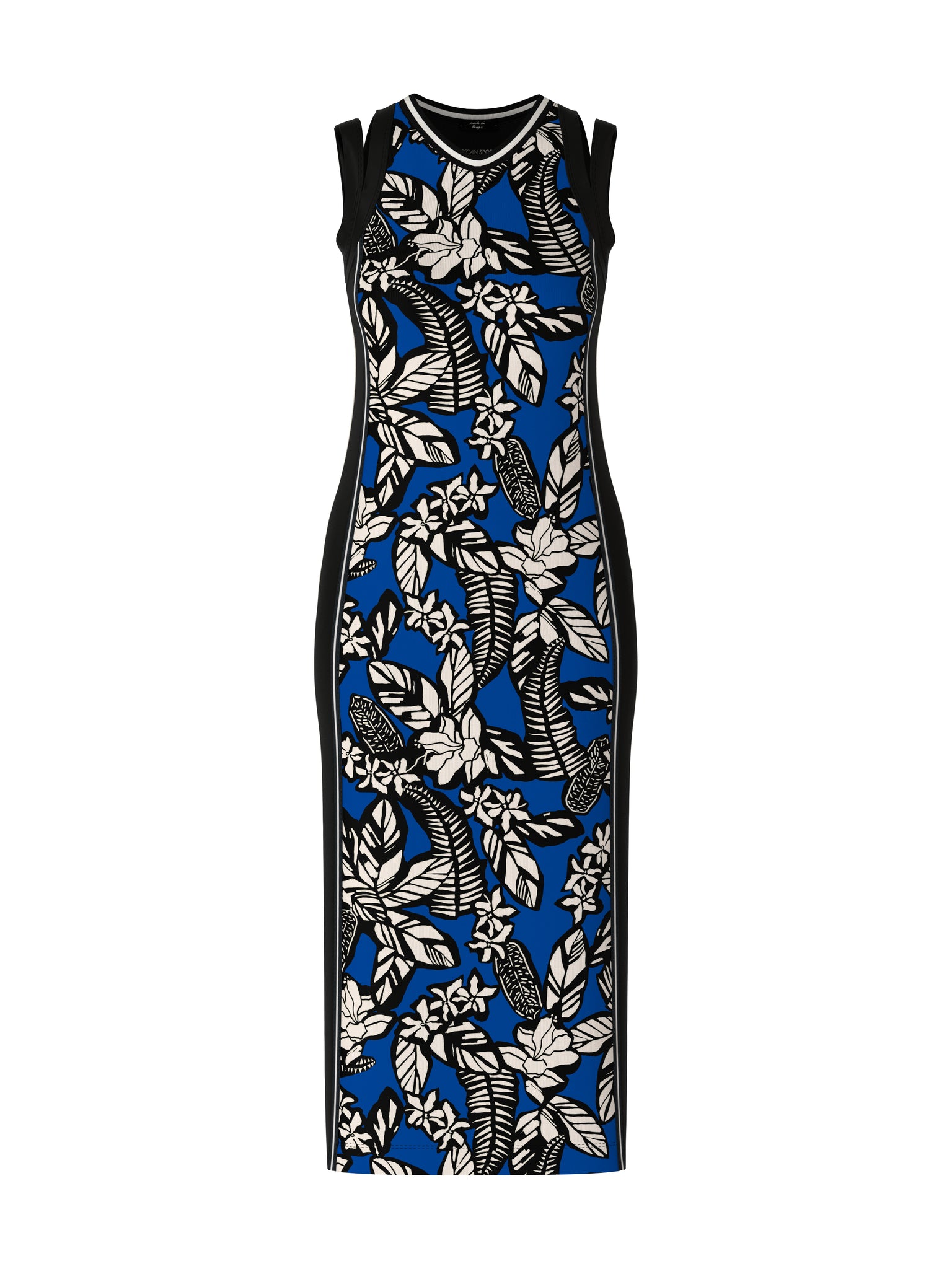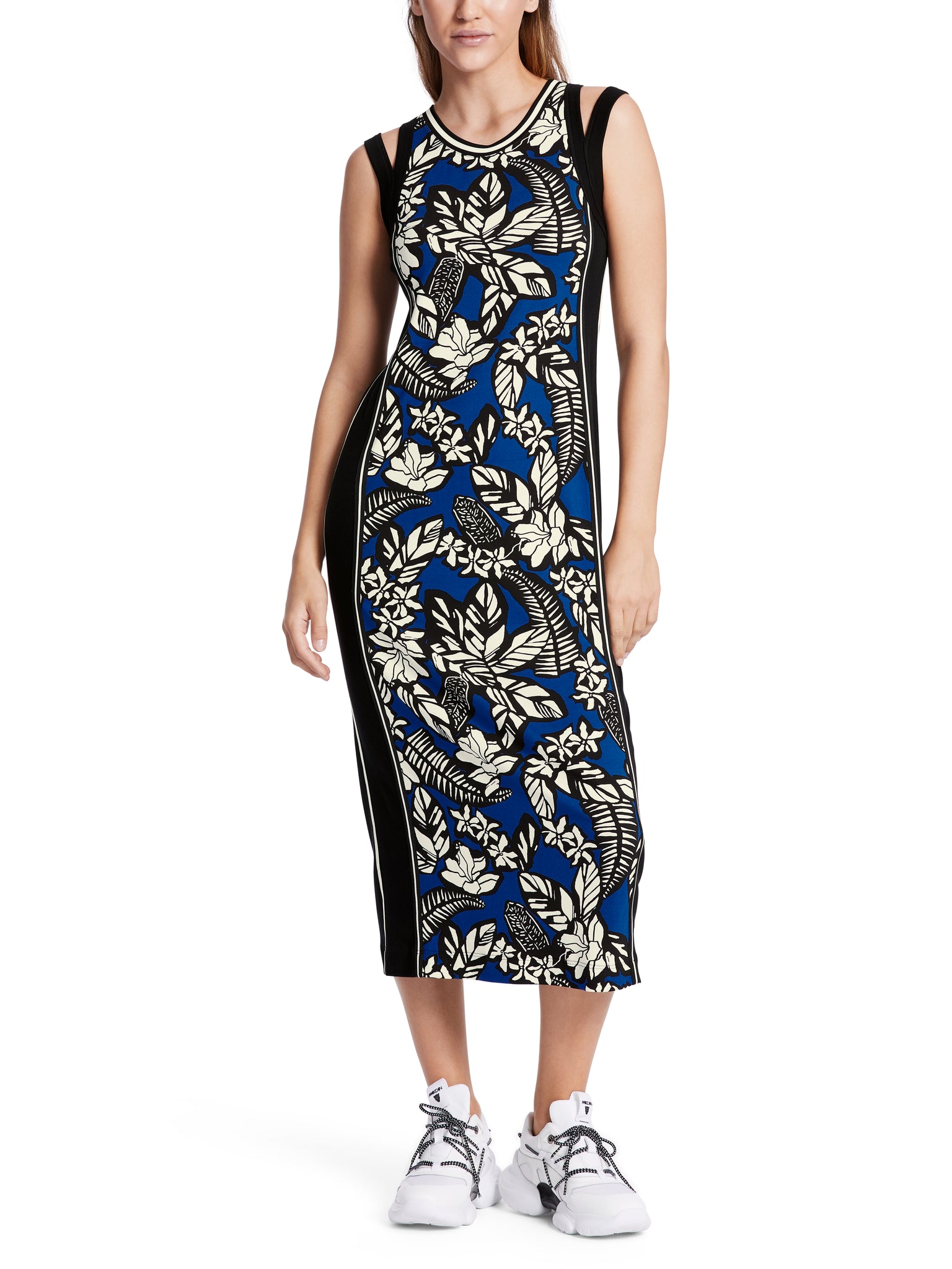 Das Kleid ist aus elastischem Baumwollripp. Das Vorderteil ist mit floralem Print und monochromen seitlichen Einsätzen gestaltet. Das Rückenteil ist uni. Am Armausschnitt findet sich ein zweilagiger Besatz.