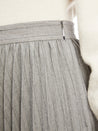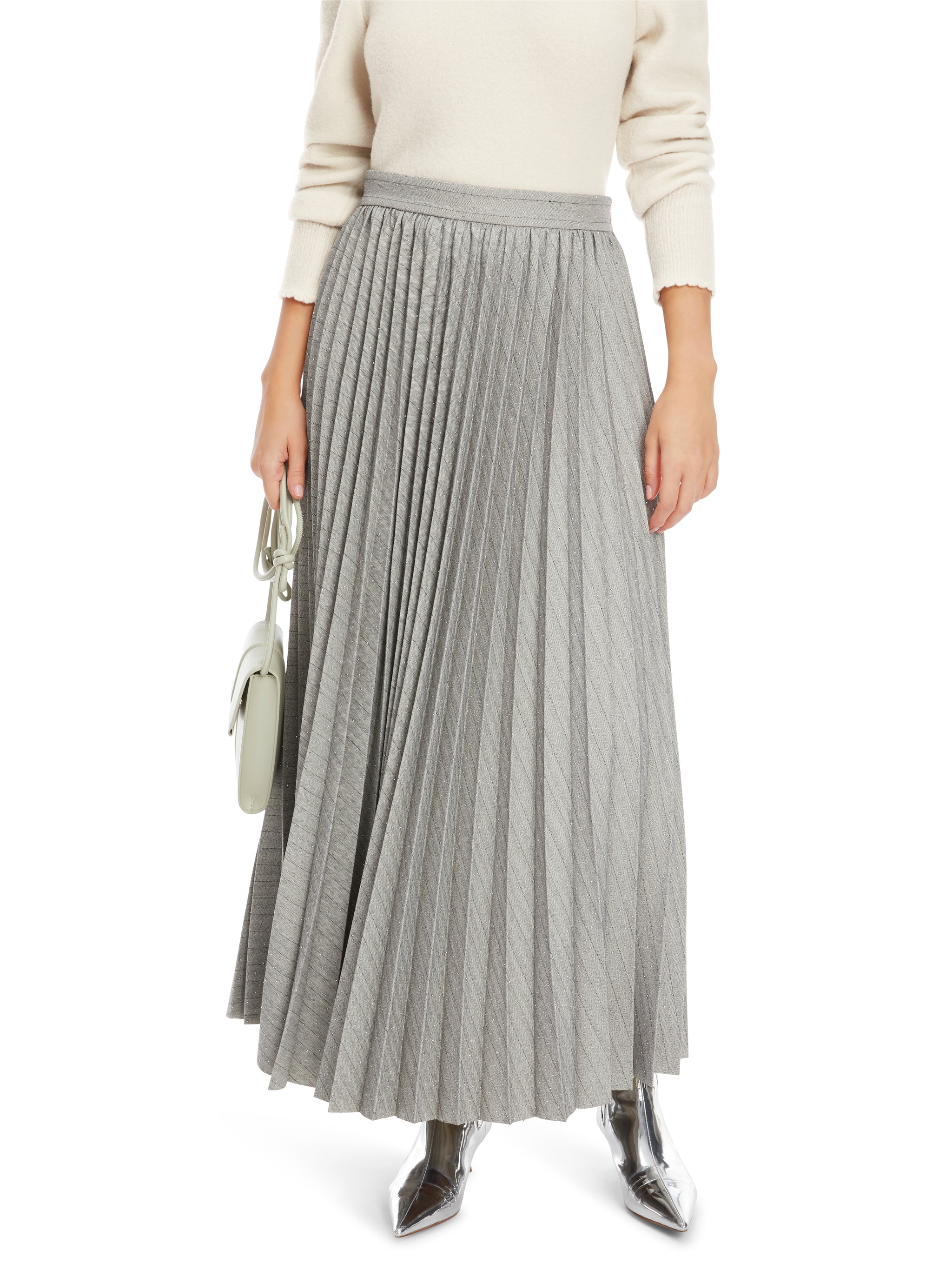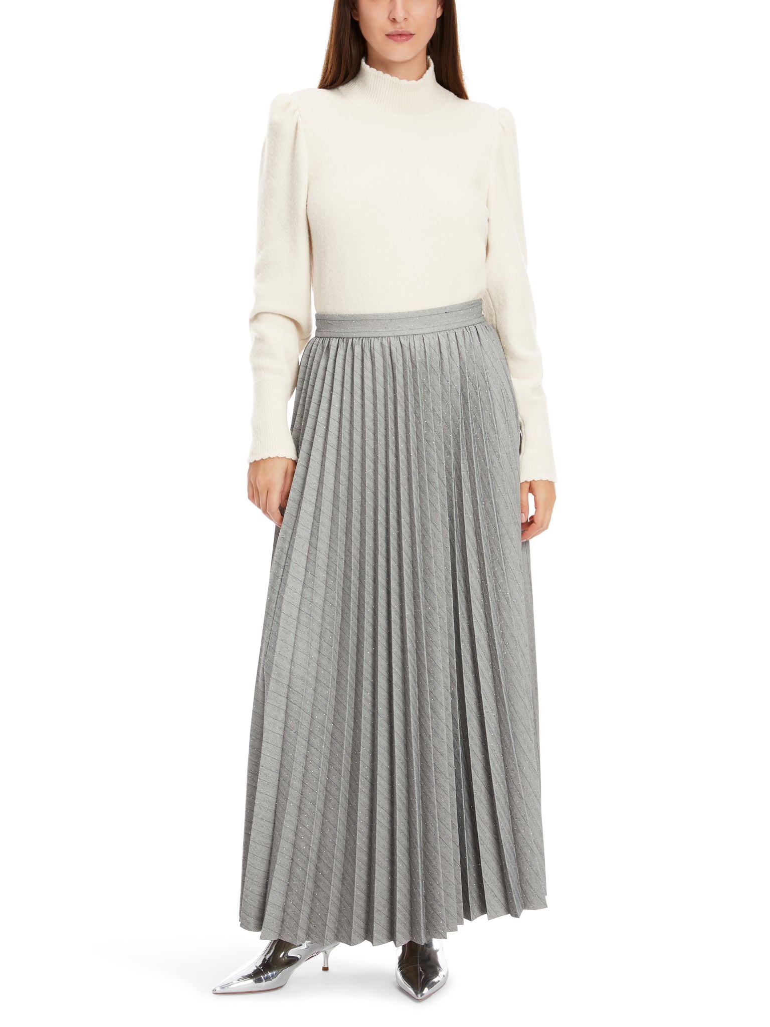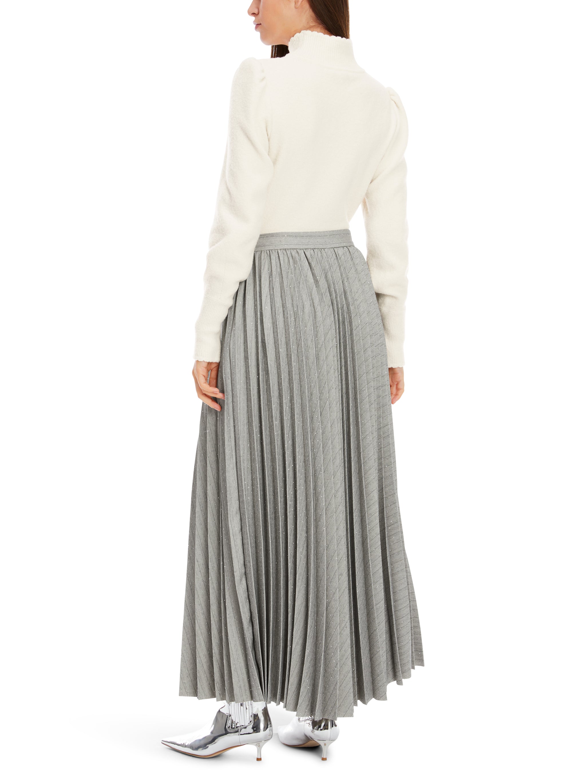 Langer, weit ausschwingender Plisseerock. Der Wow-Effekt kommt über den Kontrast von Fischgrat-Muster und Glitzersteinen. Das Modell hat einen aufgesetzten Bund und ist ungefüttert. Zu schließen ist es via Nahtzipp. Ein tolles Style-Statement für spezielle Momente.