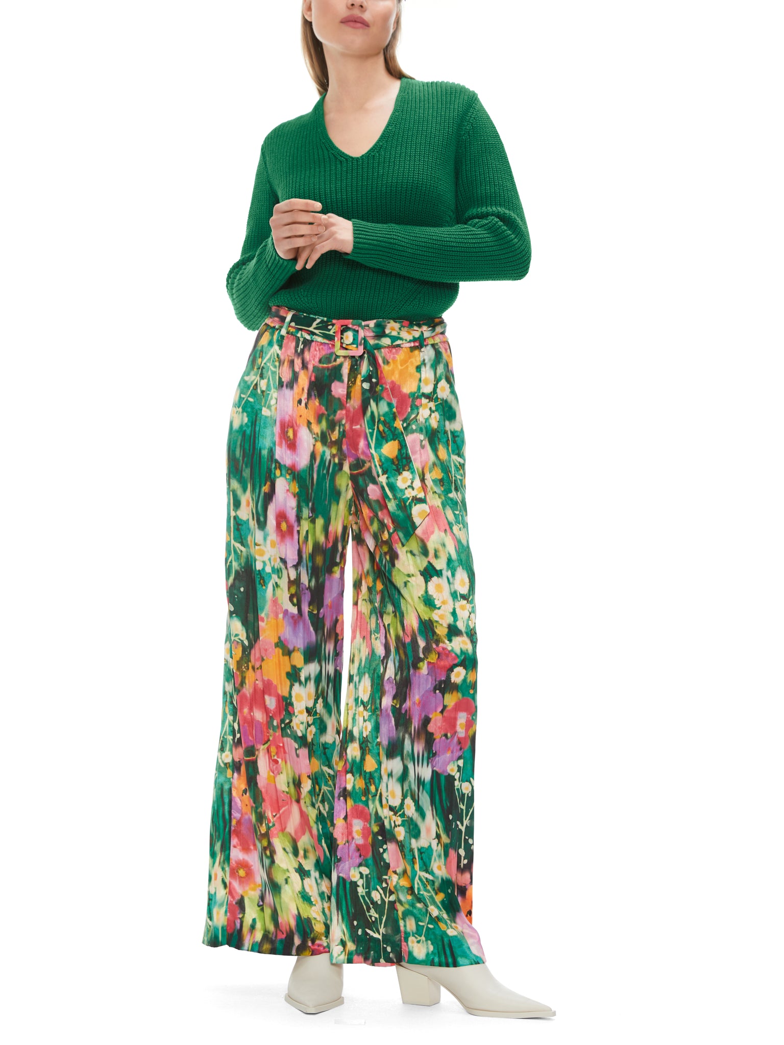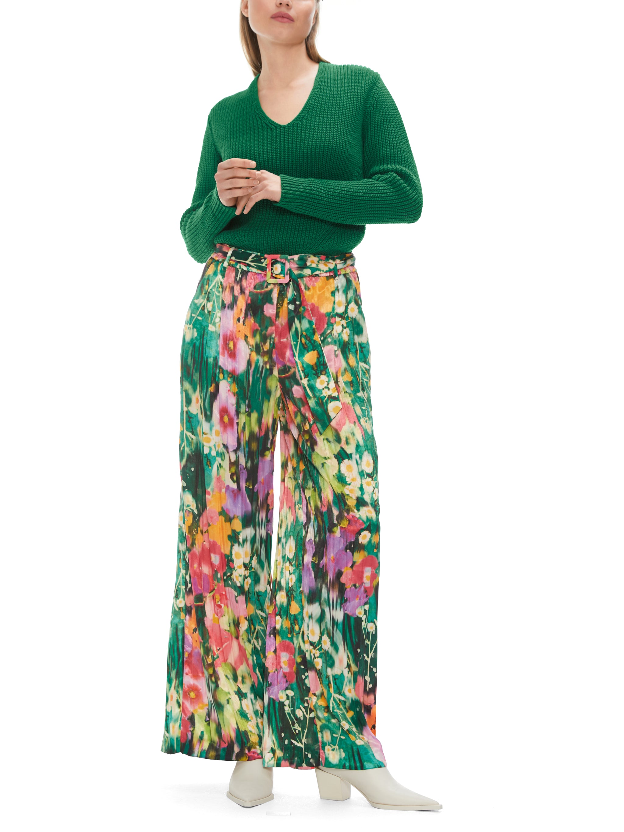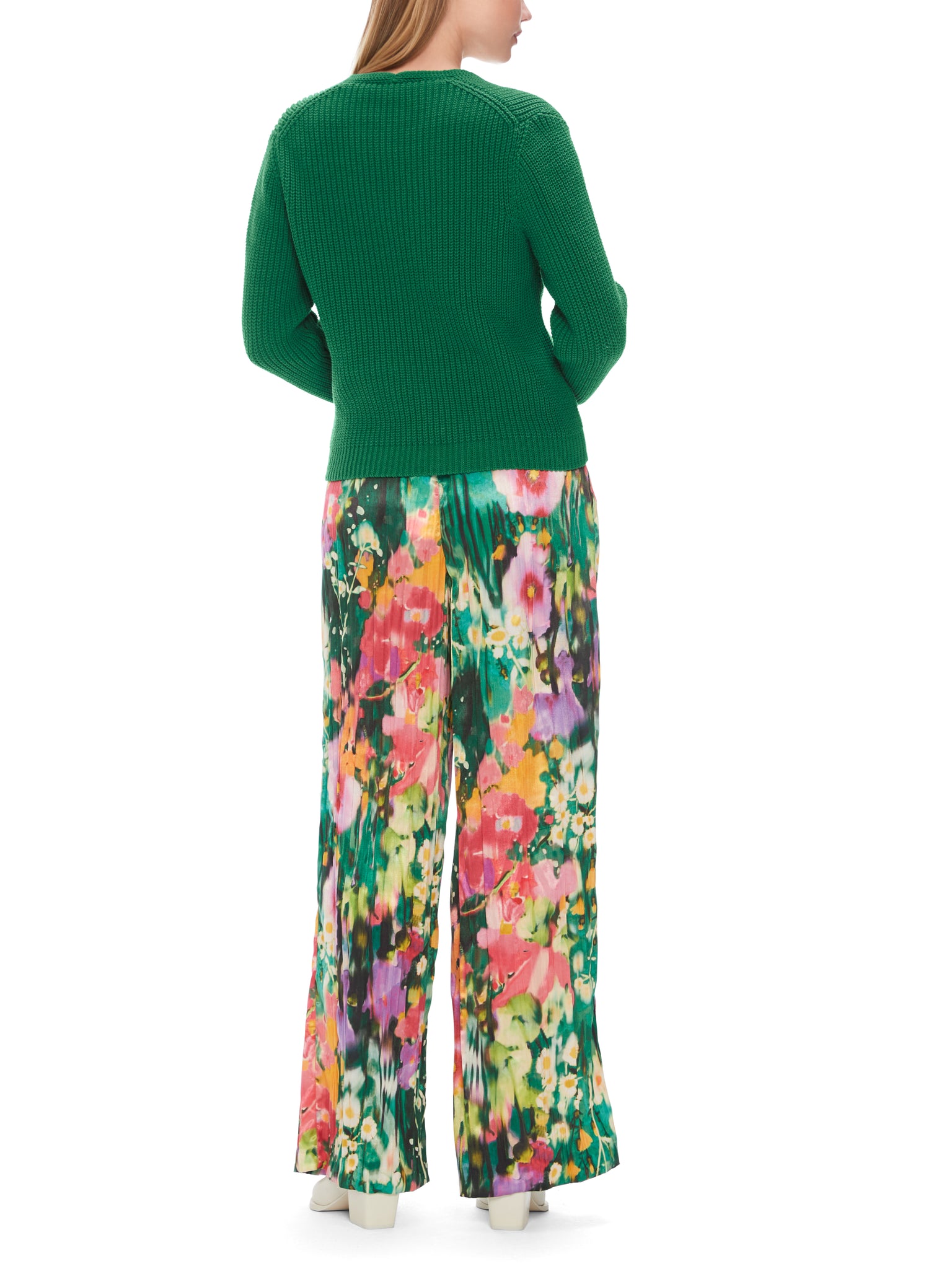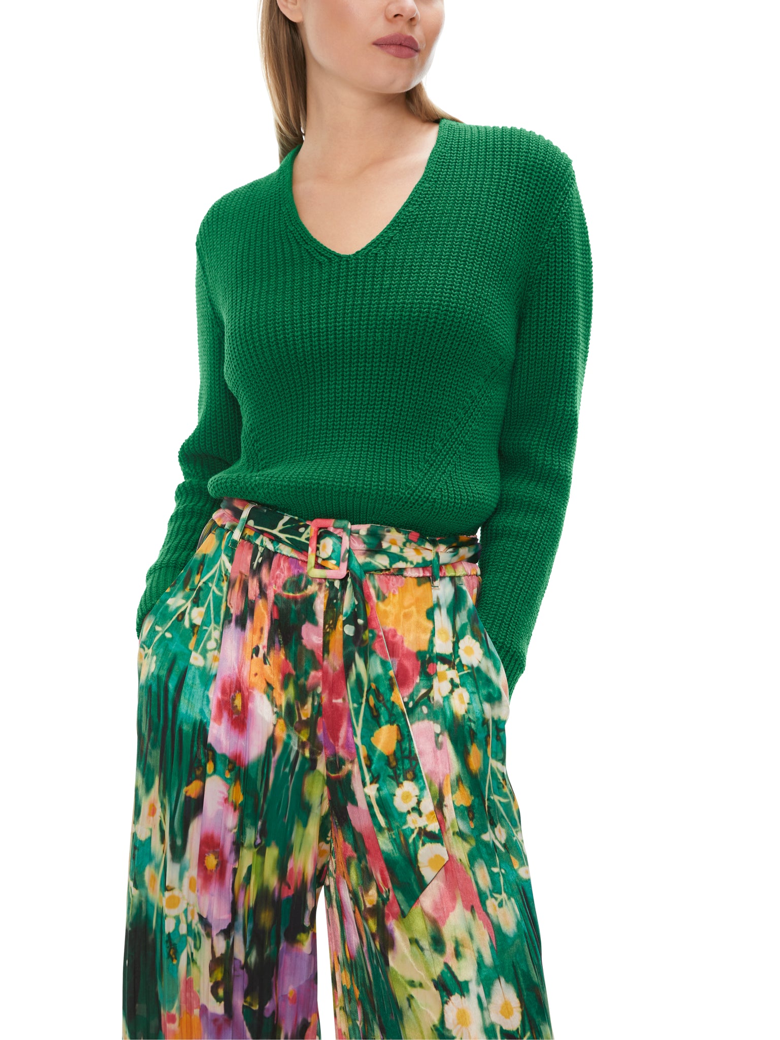 Der Pullover kommt im legeren Patentmuster, das durch diagonale Streifen interessante Akzente erhält. Er besitzt einen V-Neck und kleine Seitenschlitze. Die Silhouette ist gerade geschnitten. Der Pullover wird im Material-Mix mit Baumwolle am Standort Deutschland gestrickt und auch veredelt. Die Weiterverarbeitung der einzelnen Teile erfolgt in europäischen Partnerbetrieben. Damit ist das Modell „Knitted in Germany“.
