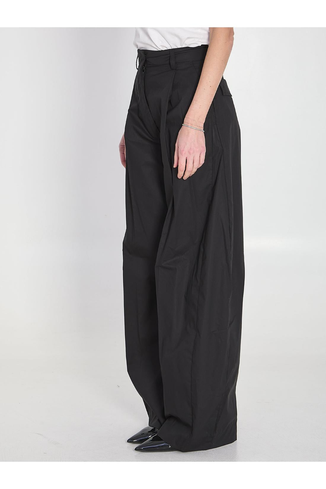Billie pants in lightweight black cotton blend. They feature a hook, button, and zip closure, belt loops, two side pockets, front pleats, two back pockets with flaps, and fluid wide legs.