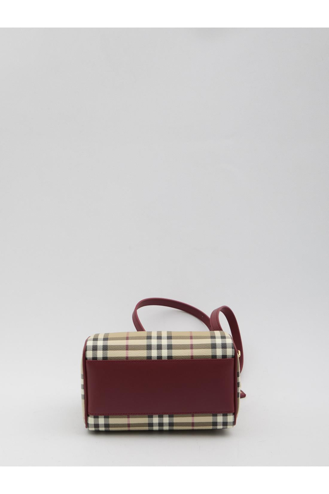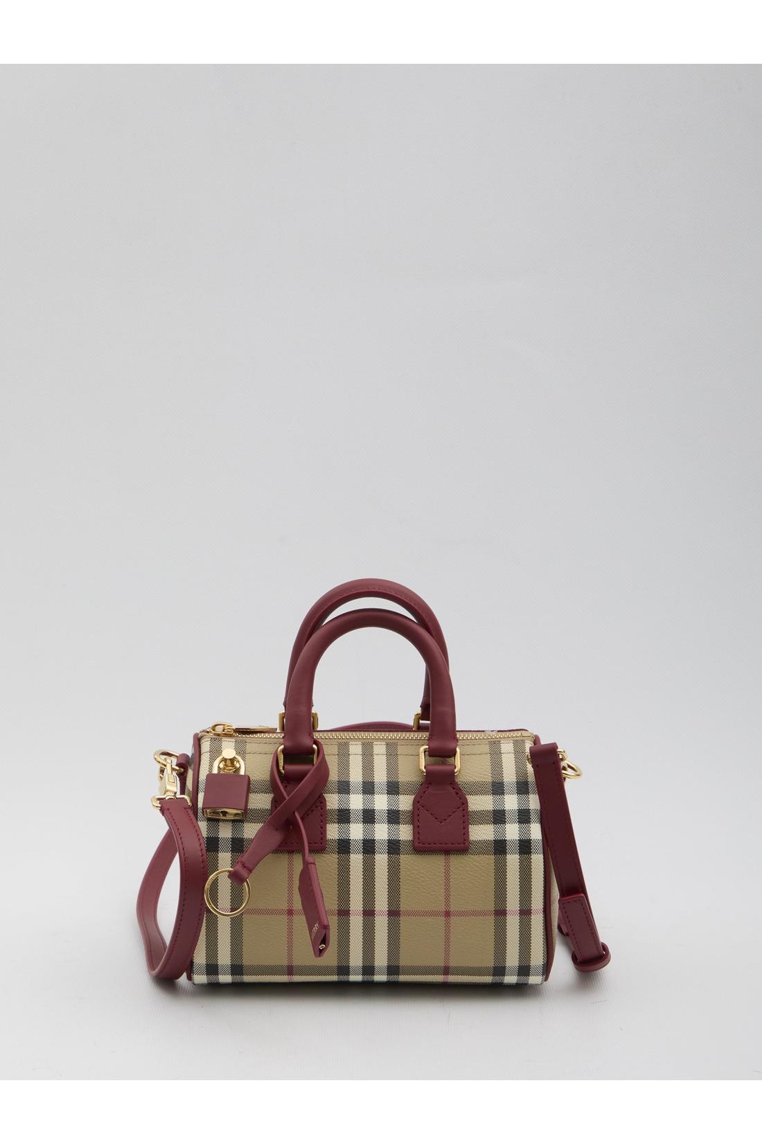 Bowling bag in coated cotton blend with Burberry Beige Archive Check print and Ruby Red leather inserts. It features two rounded top handles, an adjustable and removable shoulder strap, a leather-covered lock and key, a zip closure, one internal compartment, and a cotton lining. Dustbag included. Any imperfections in the leather are not to be considered manufacturing defects, but rather a characteristic of the material.