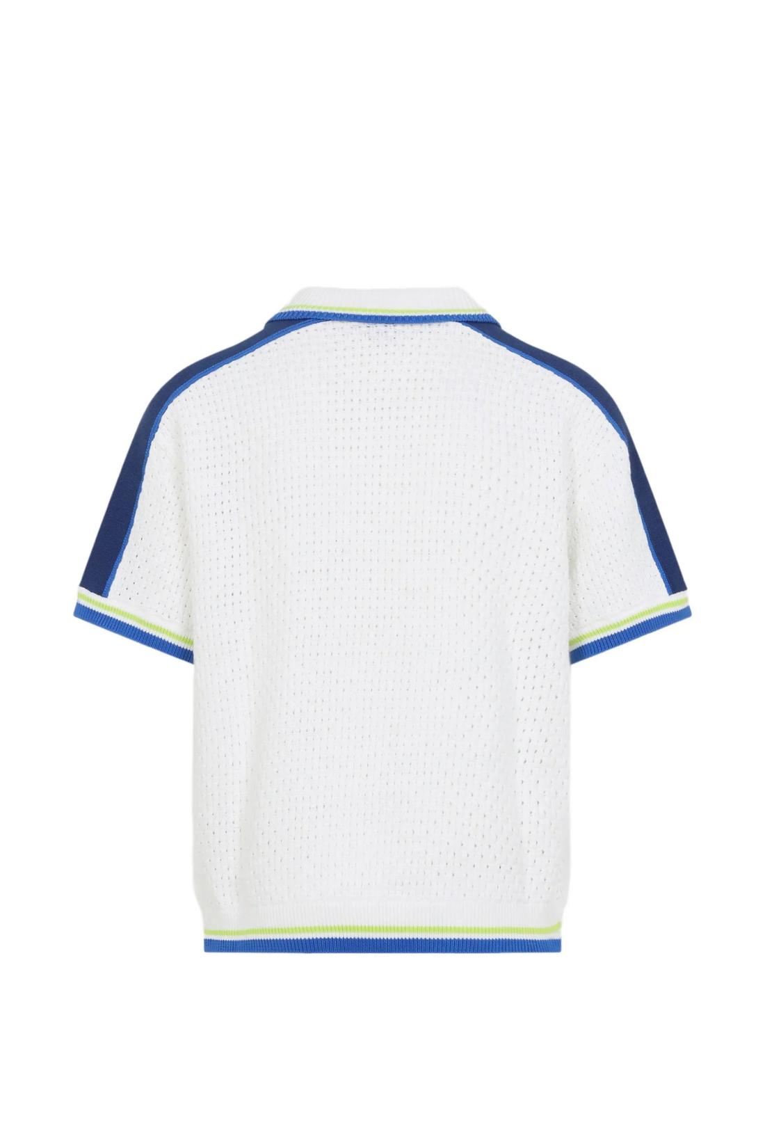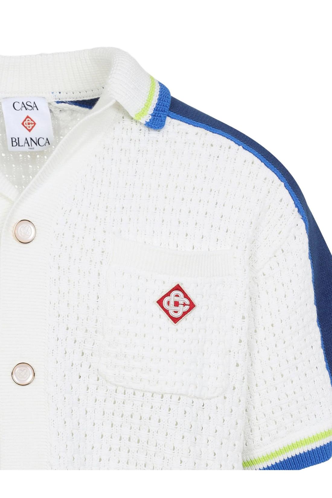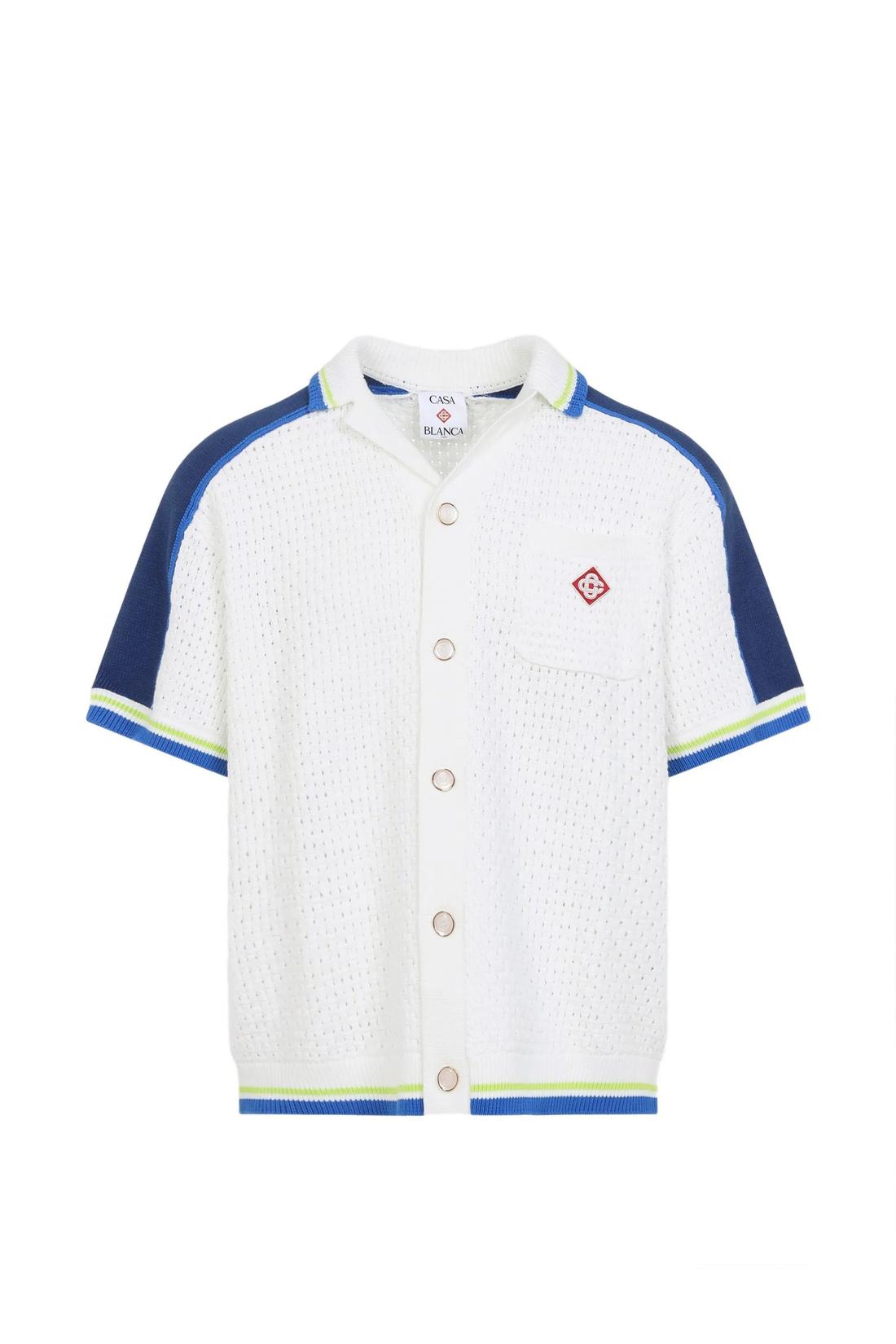 White and blue cotton-blend crochet shirt. It features a ribbed collar, short sleeves, a button-front closure, a patch chest pocket with an embroidered logo, and ribbed trims. Comfortable fit.