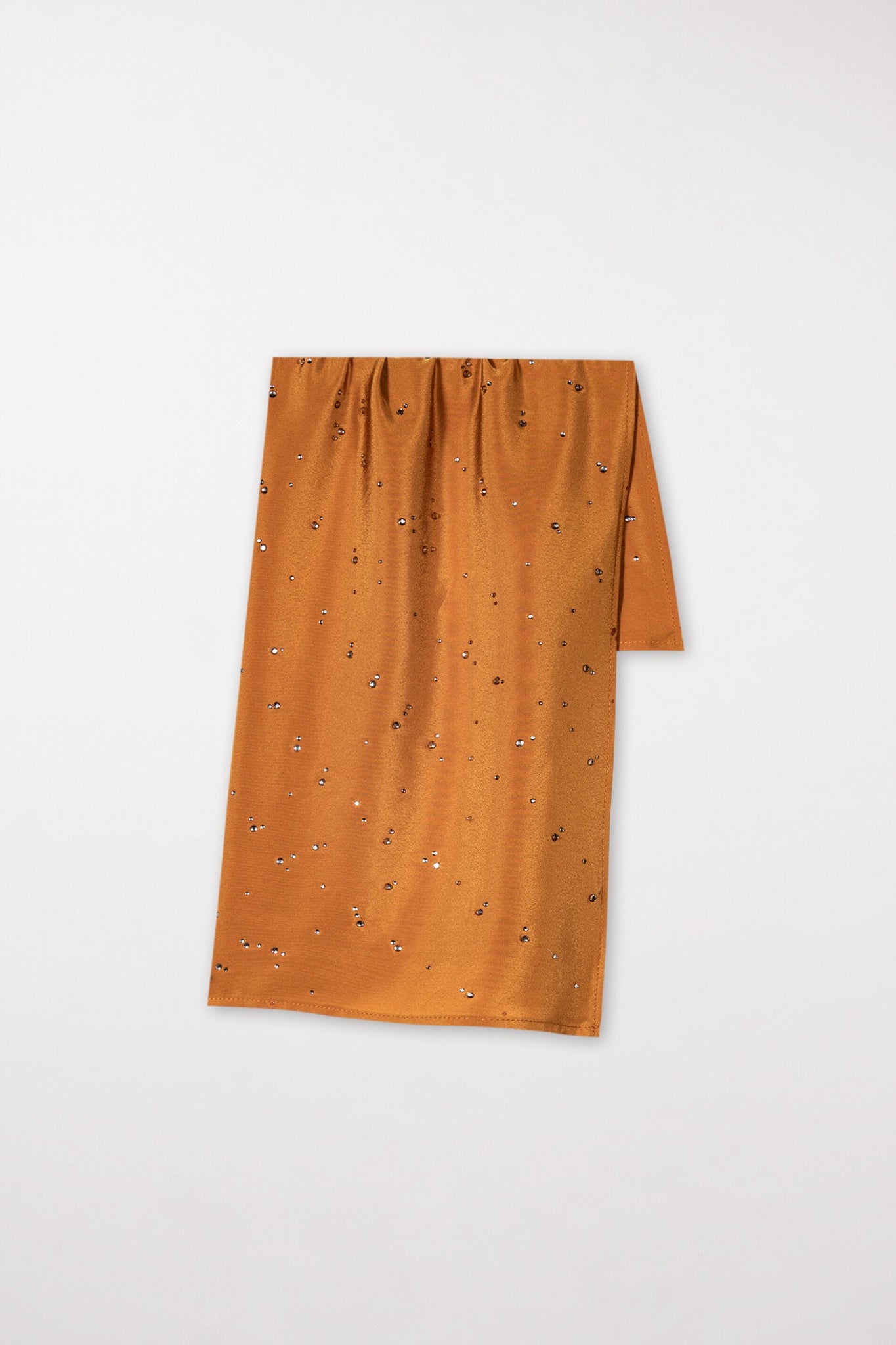 Kleines, quadratisches Tuch aus fließender Techno-Seide. Für eine Extraportion Glamour sorgen die aufgeklebten Glitzersteine in passender Farbe.