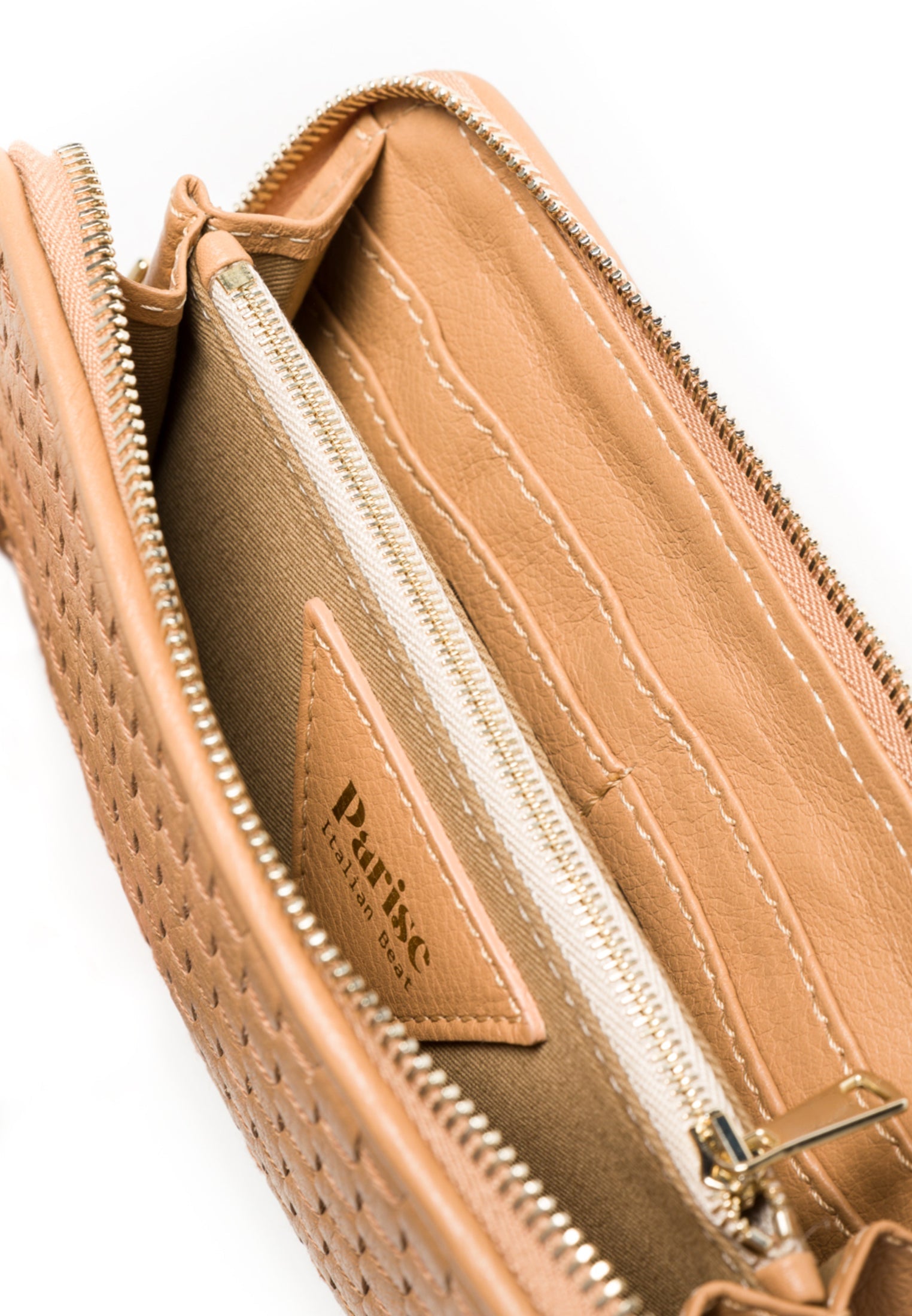 Product: '15' Continental Wallet Camel- Compact but generous size, which also allows it to be used as a small clutch bag - Zip around closure - Coin zip compartment - 8 credit cards pockets - 4 cash compartments - White gold colored hardware - Soft and durable 100% cotton lining - Made in Italy - Protective dust bag included for lasting beauty - Premium 100% bovine leather woven with 100% cotton yarn on 18th century treadle looms