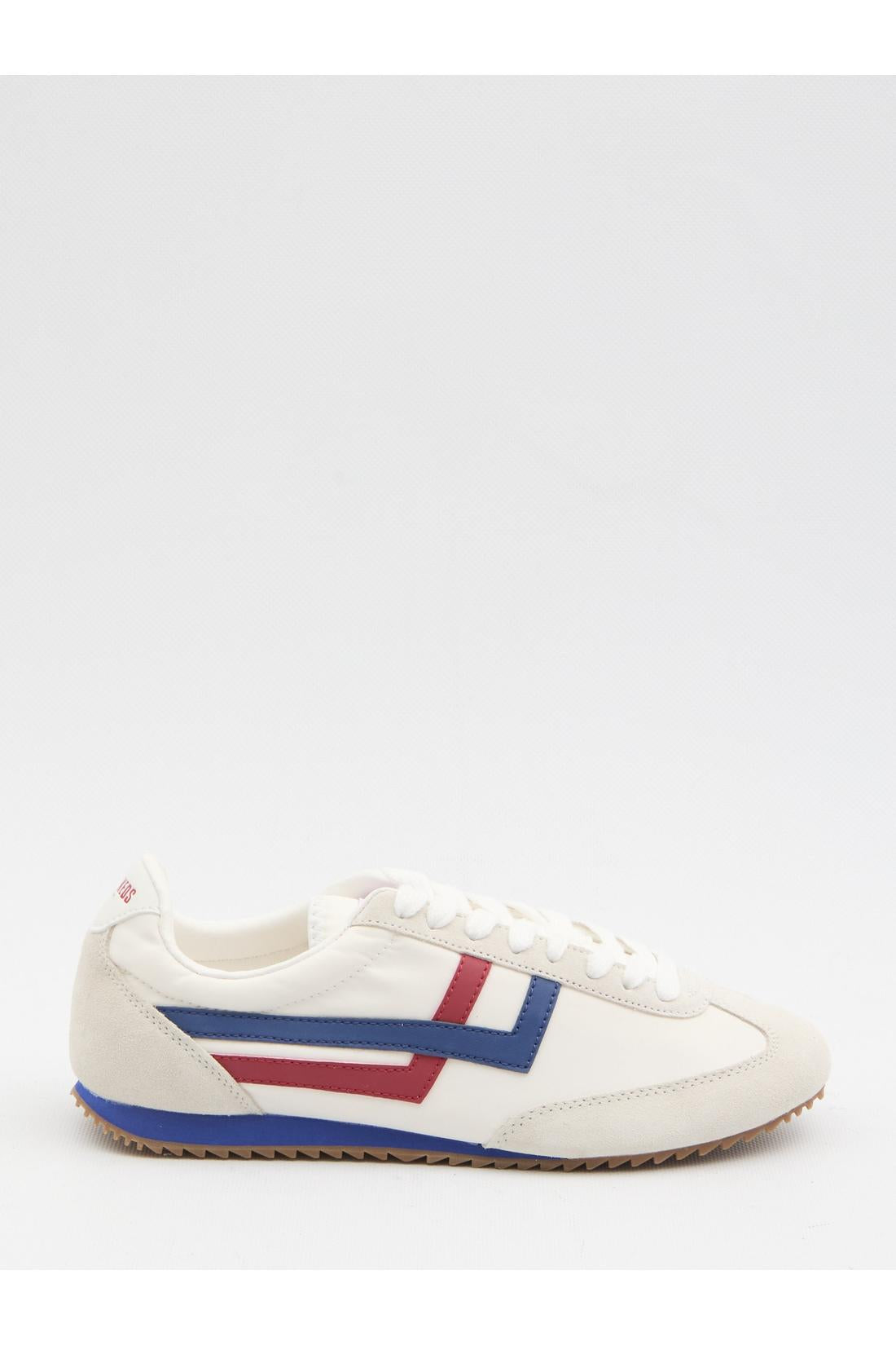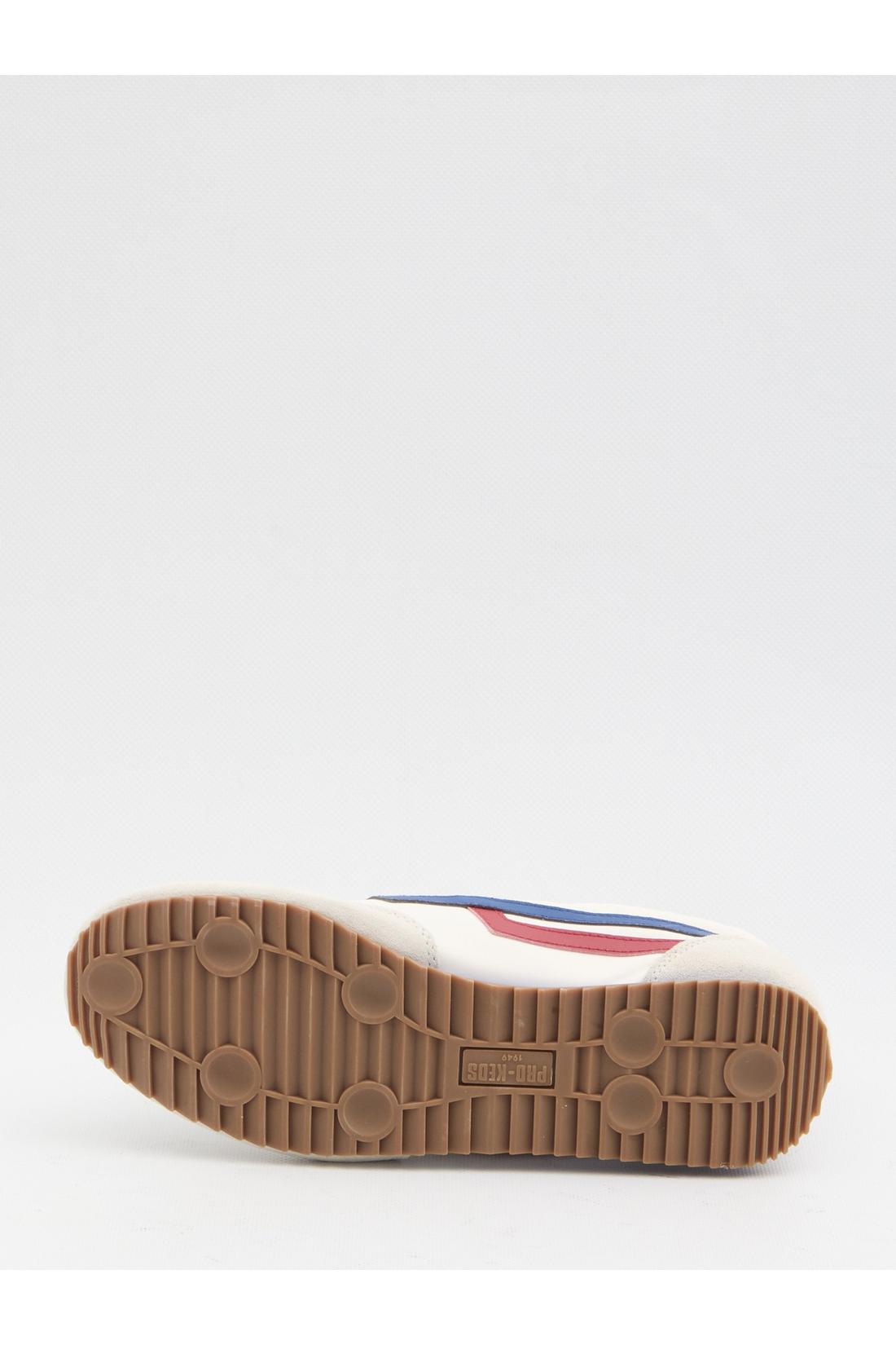 White nylon sneakers with suede leather inserts. Featuring a round toe, lace-up closure, PRO-KEDS branding on the tongue and heel, blue and red napa leather logo on the sides, and a rubber sole. Dustbag and additional laces included. Any imperfections in the leather should not be considered manufacturing defects, but rather a characteristic of the material.